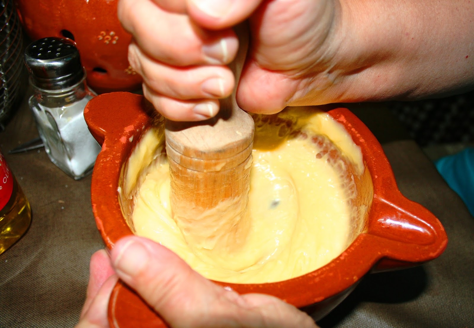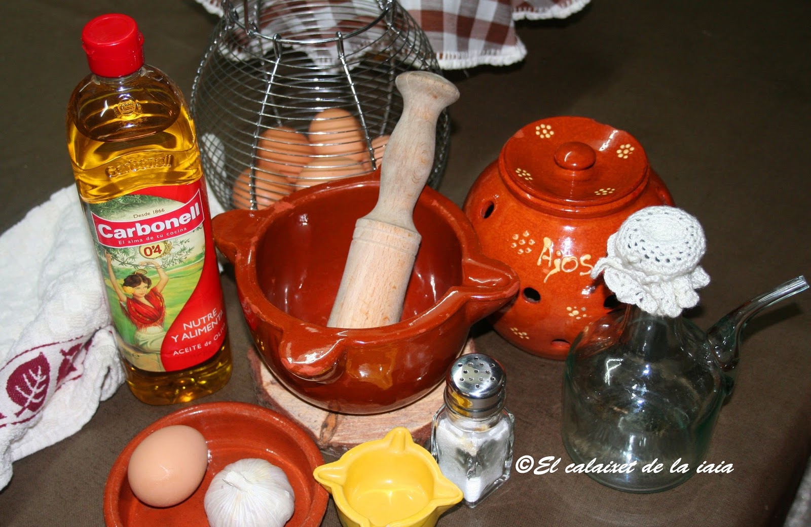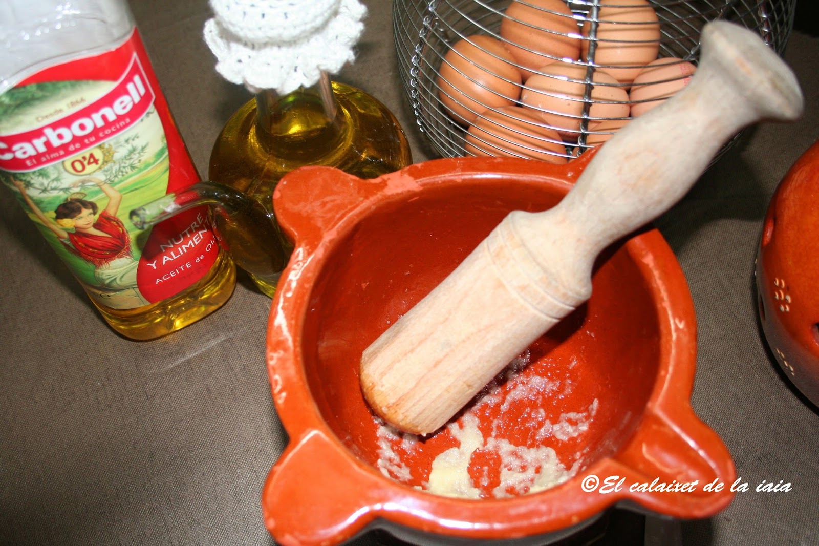La forma auténtica de hacerlo es con un buen aceite de oliva, ajos y una pizca de sal. Los utensilios son; el mortero con su mano de madera… y un buen brazo.
