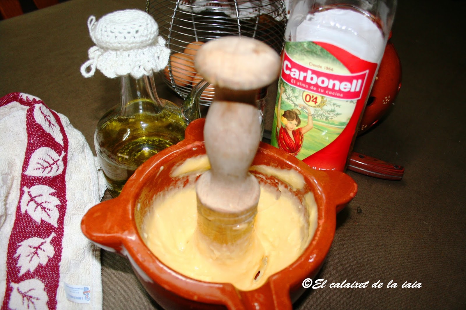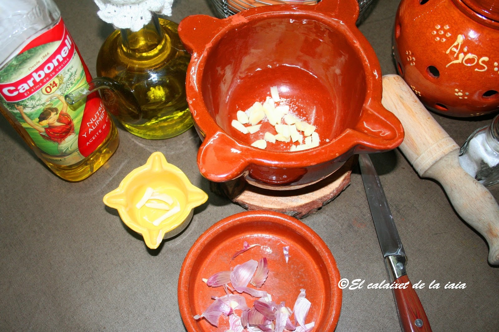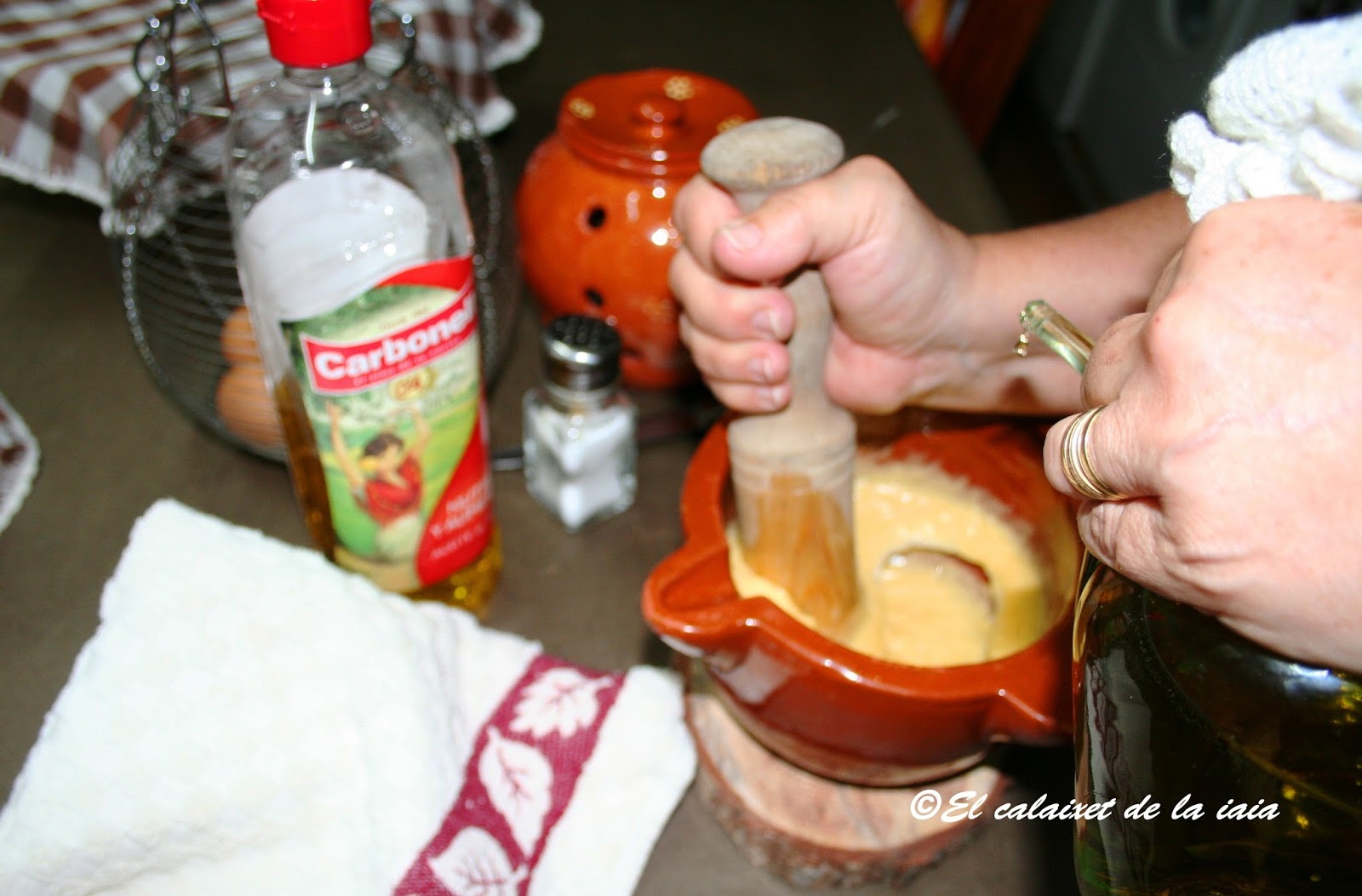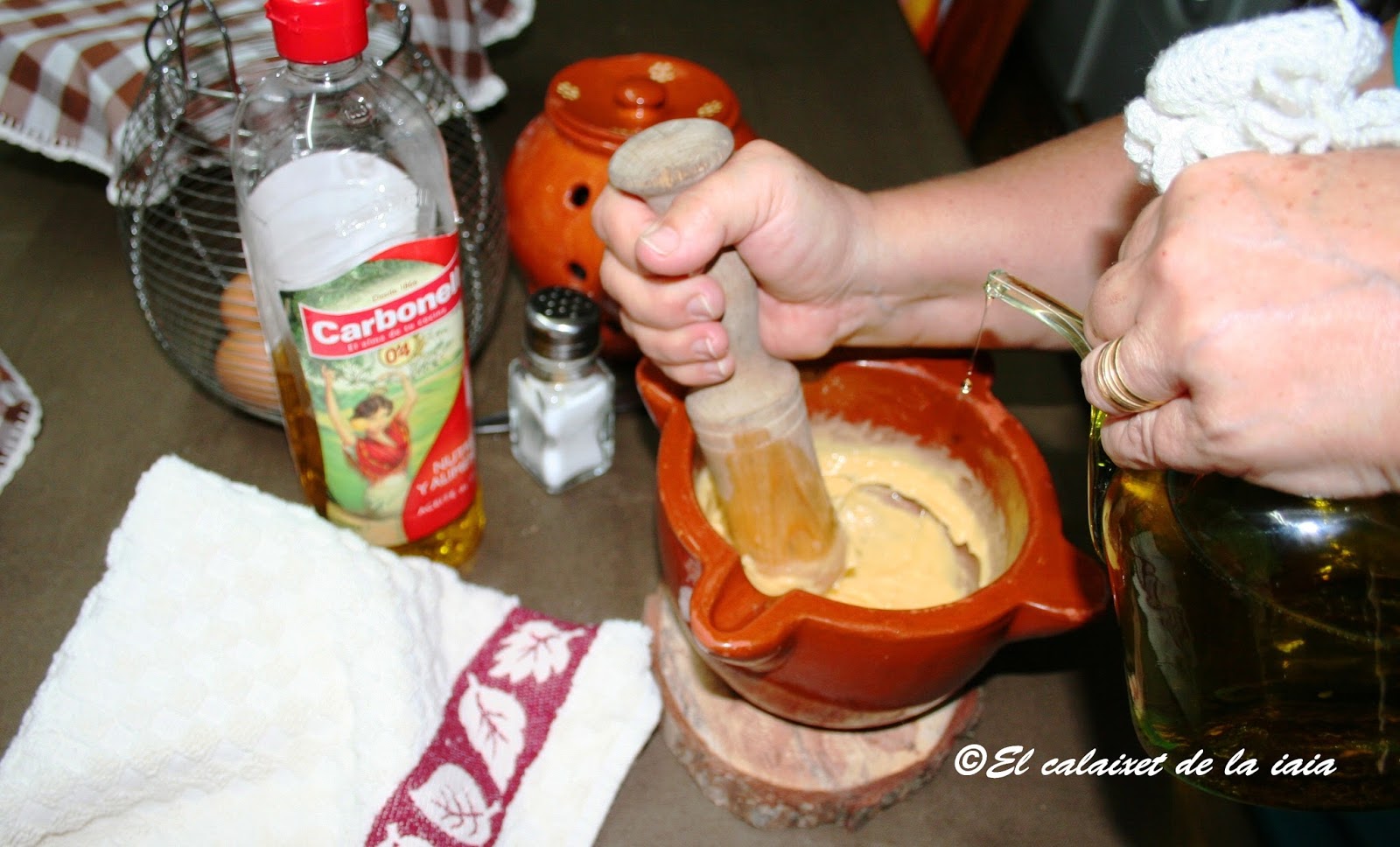 Lo hago desde jovencita, y me enseñó mi tío Pepe, (el marido de mi tía Conxeta, mis segundos padres), aunque ahora ya le añado una yema de huevo. El brazo no es el que era… y así también esta riquísimo y cuaja antes, aunque por supuesto el tradicional all i oli, solo lleva éso… ajo y aceite y un poco de sal, claro.