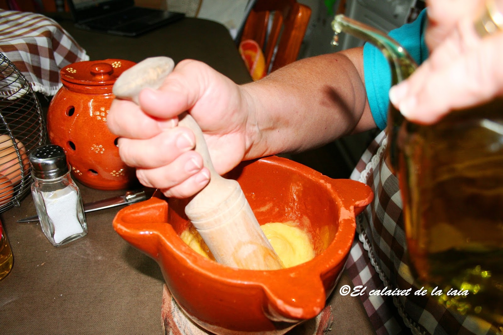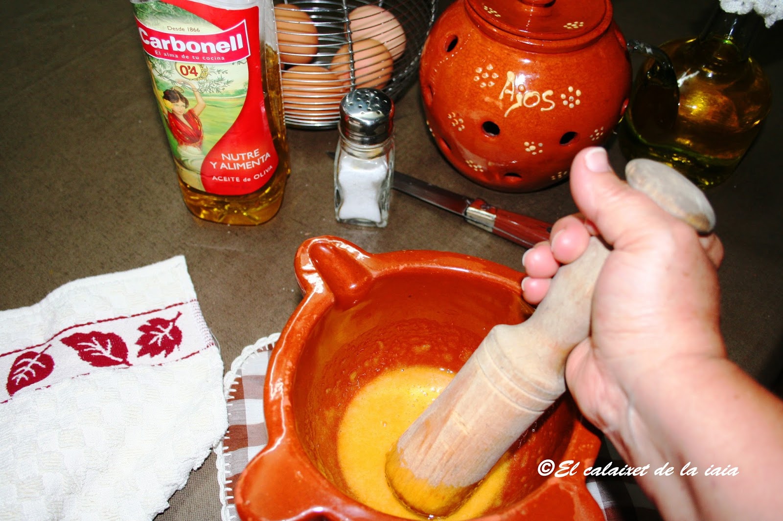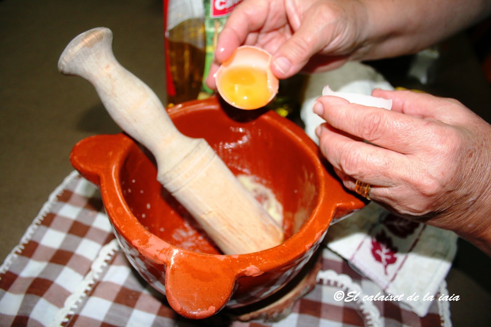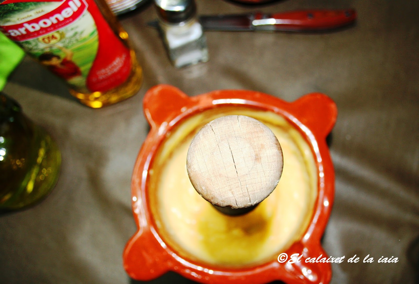 Lo hago desde jovencita, y me enseñó mi tío Pepe, (el marido de mi tía Conxeta, mis segundos padres), aunque ahora ya le añado una yema de huevo. El brazo no es el que era… y así también esta riquísimo y cuaja antes, aunque por supuesto el tradicional all i oli, solo lleva éso… ajo y aceite y un poco de sal, claro.