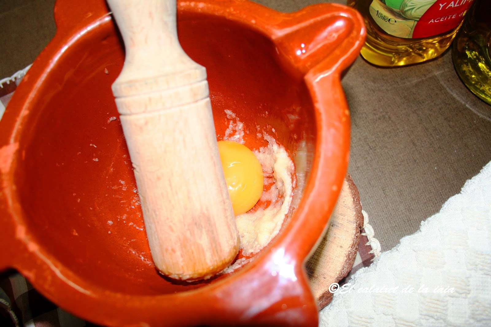 Como podréis ver el mortero, lleva una ranura y es por ella por donde se echa el aceite para que se deslice en hilo fino, aunque yo ya lo echo directamente en el mortero acostumbrada a hacer ajoaceite de todas maneras, e incluso con un tenedor y en un plato hondo, y con un vaso y un tenedor ¡y sin huevo!