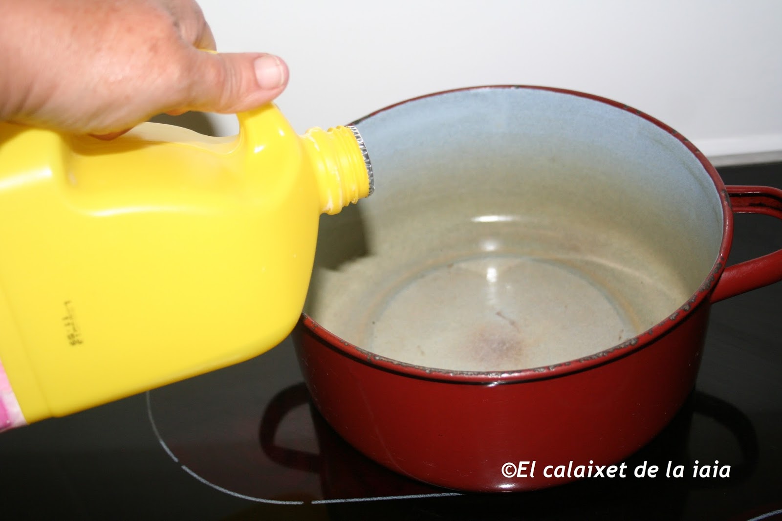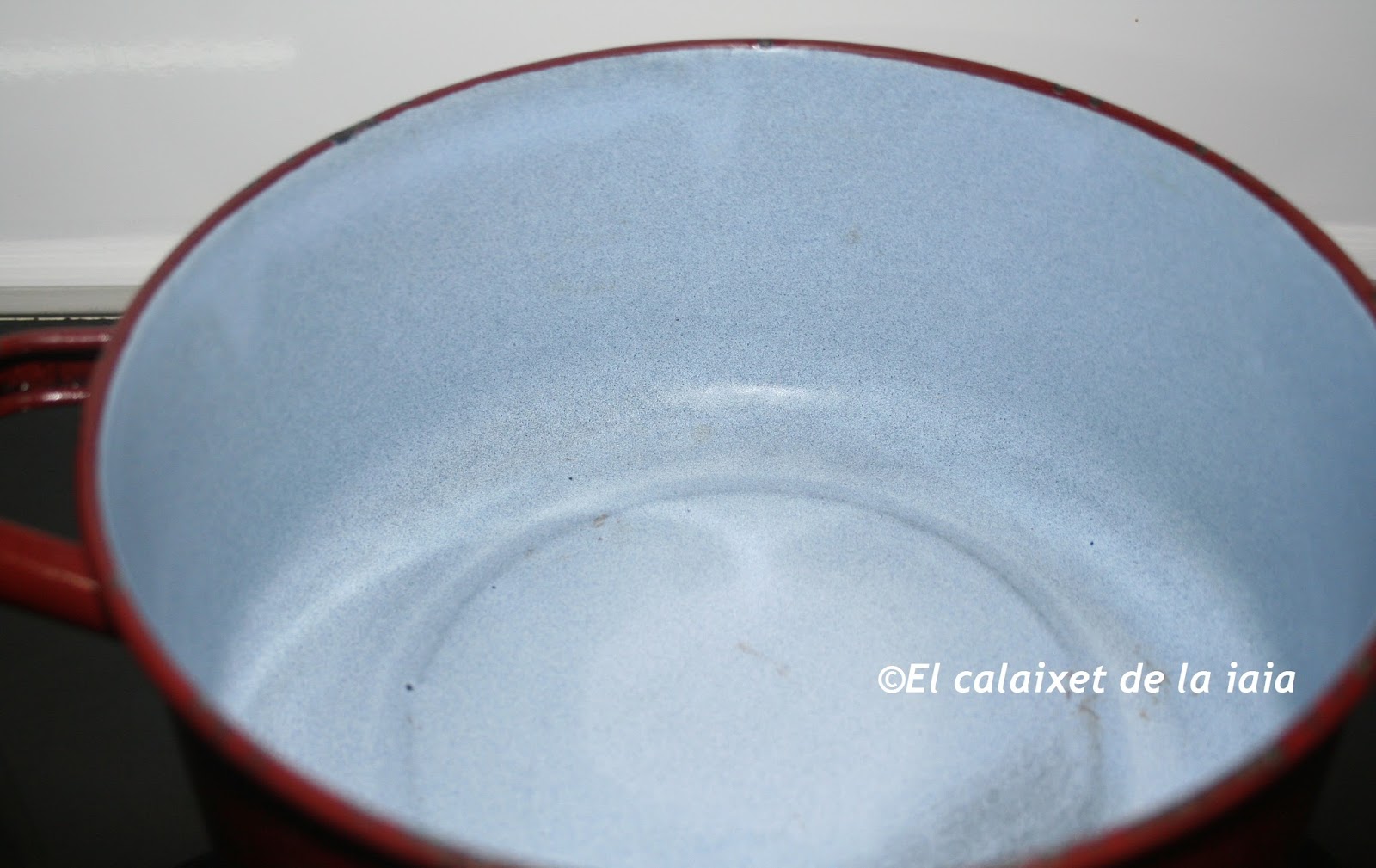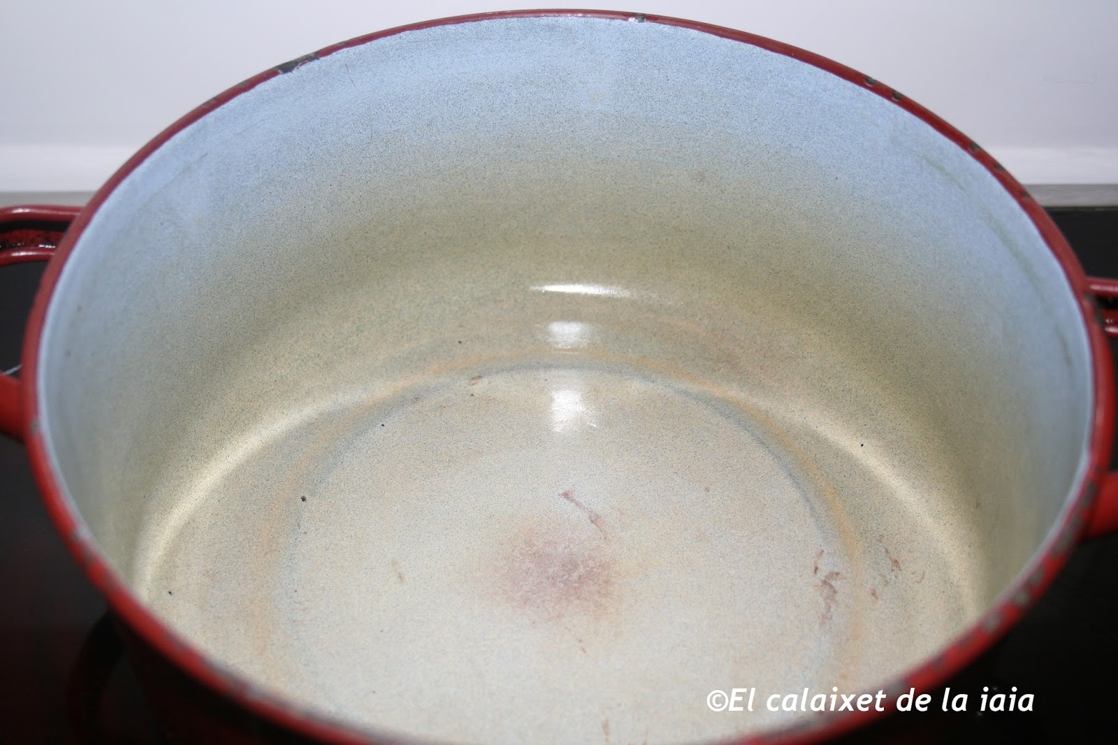 En mi casa del pueblo, conservo algunas cazuelas que eran de mi suegra. Compré hace muchos años, una batería de acero inoxidable, pero en cuanto me doy cuenta, ya tengo la comida en marcha en las viejas cazuelas….no me doy cuenta y es que me encantan. lo malo es que están, ya muy viejecitas y al igual que llevan desconchones por fuera, ya han ido perdiendo parte de la porcelana interior y claro…con el uso, se manchan. ya las puedes fregar y fregar que quedan muy feas.