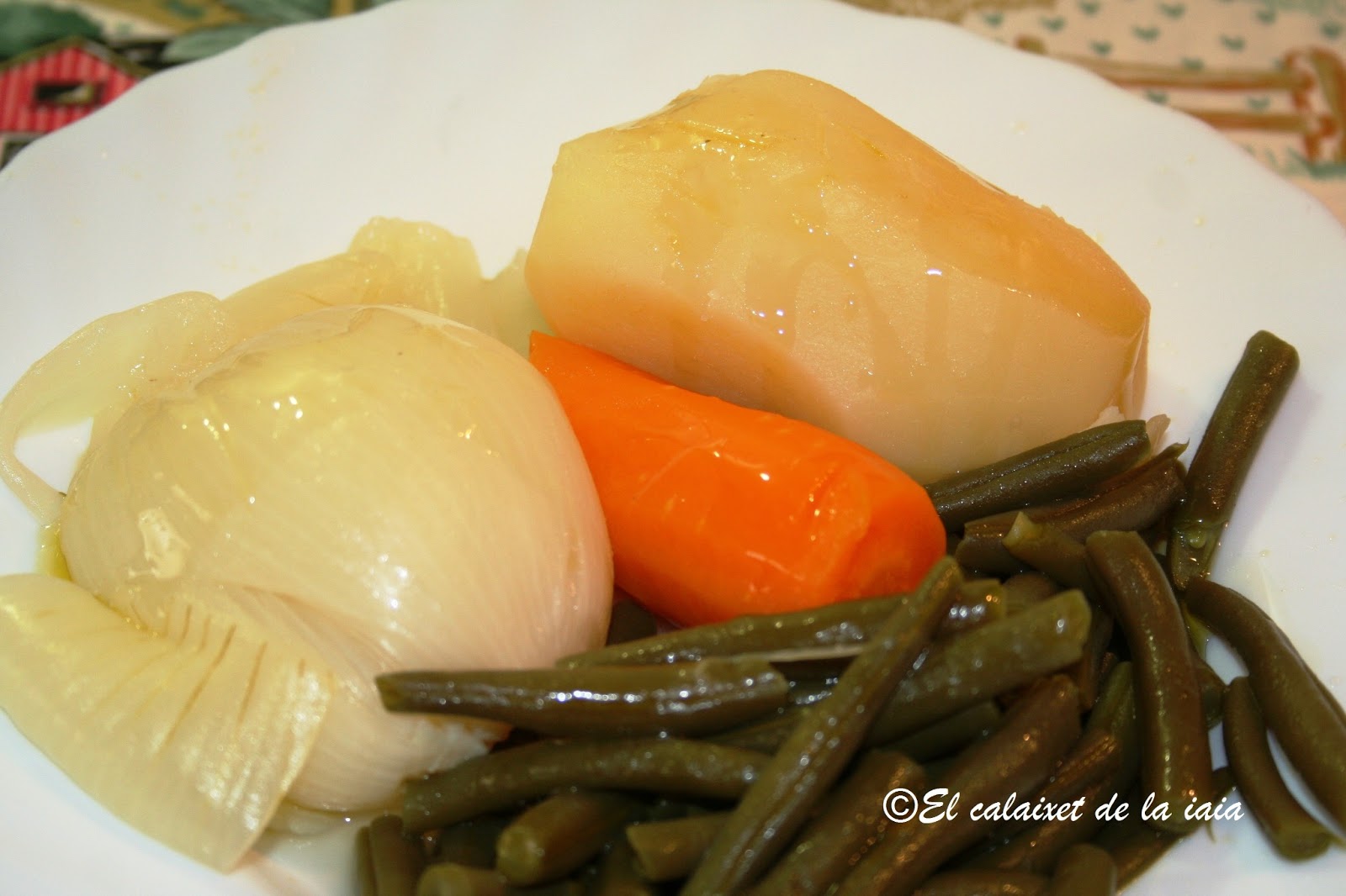 A mi maridín y a mi papi, les encanta cuando lo hago en la olla de hierro, aunque sea en la vitro, pero muchíiiisimo mejor, al fuego de la estufa de leña en el pueblo mmmm… les recuerda su infancia, tanto mi querida suegra, como mi iaia, cocinaban sobre unas trébedes en cocina abierta de leña, en el suelo, aunque mi suegra, hacía el hervido de cardo, patata y borraja, que es habitual en Aragón. Comenzó a ponerle patata, judía zanahoria y cebolla, cuando bajaron a vivir aquí, y desde entonces el hervido es uno de los platos preferidos de mi chico que me lo pide cada día 😉