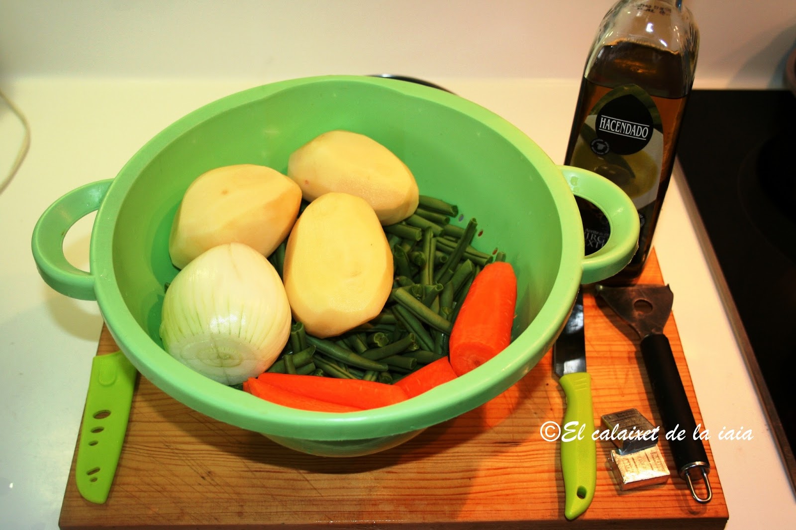 El que más aceptación tiene entre los míos. es el que hago con patata, zanahoria, cebolla y bajoqueta ampla. La de hoy es judía fina, de tipo boby, porque estoy en el pueblo, y no tengo otra, pero la tradicional es la ancha, esto que quede claro, e incluso más tradicional aún, sin la zanahoria. Pero hoy os pongo el que cenaremos en casa ,hago de mas, y para mañana haré puré, por eso le he puesto zanahorias, pero si estamos en València, patata, cebolla tierna y judía ancha o bachoqueta, solamente.