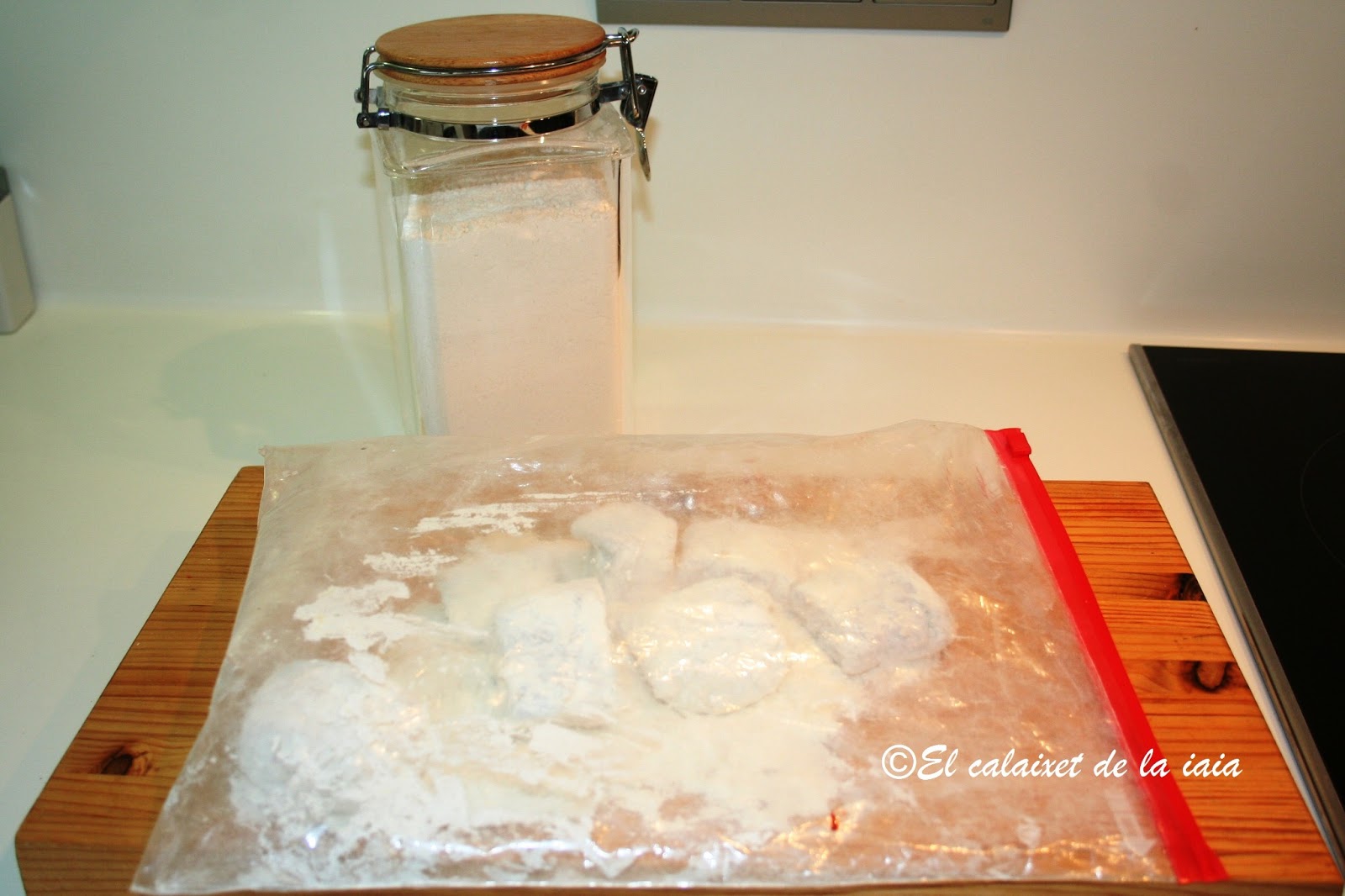 Cojo una bolsa de congelación, meto el alimento a rebozar, pongo la harina. cierro herméticamente…..
