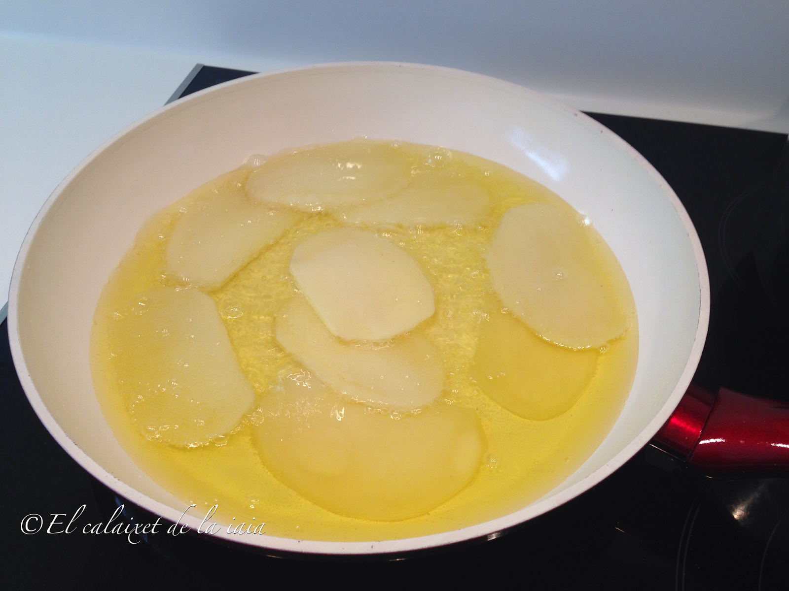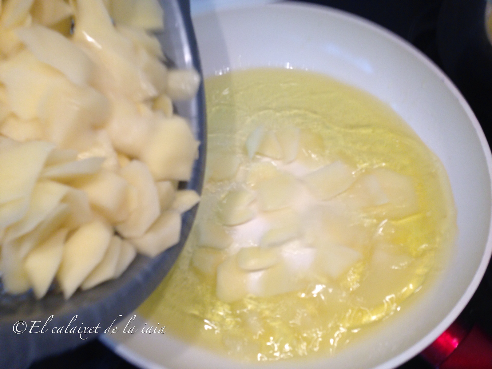 Cortamos el resto de patatas como para una tortilla normal y freimos en el mismo aceite a fuego medio, para que no se hagan demasiado