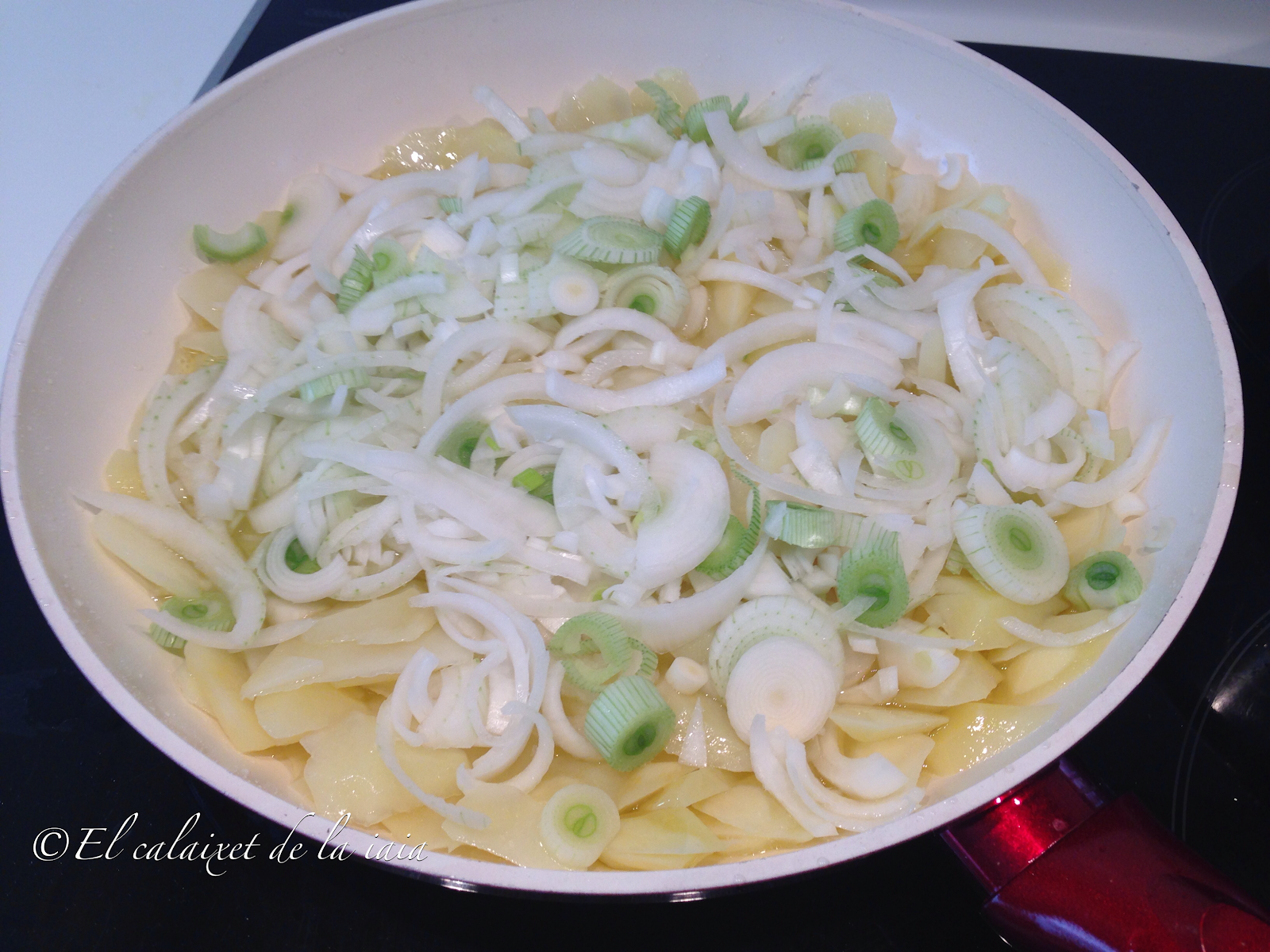 cuando las patatas estén blandas añadimos la cebolla dejamos pochar todo junto removiendo de vez en cuando y precalentamos el horno a 180º