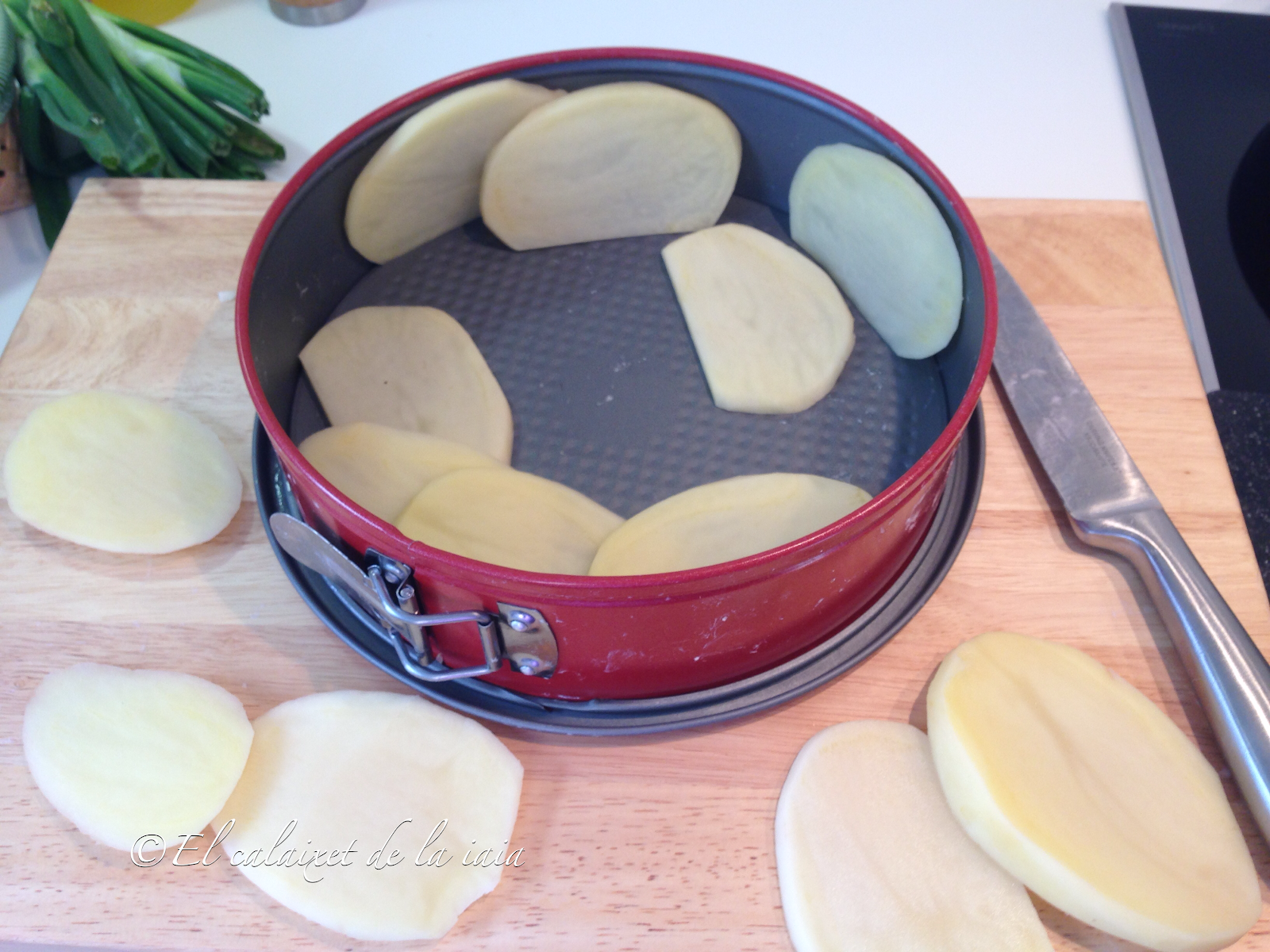 Cortamos dos patatas en rodajas finas para forrar el fondo y el lateral del molde, calculamos cuantas necesitamos para cubrir las paredes