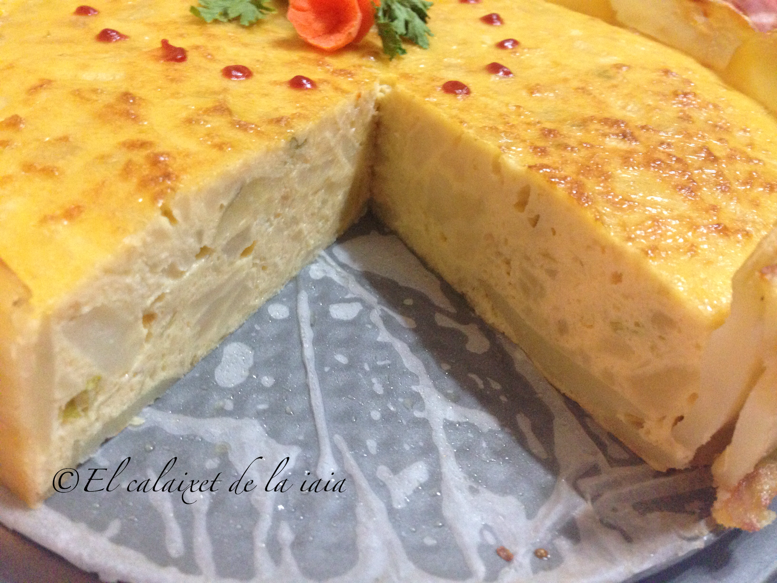 Éste es el corte,para mi gusto, ha quedado el huevo, demasiado cuajado, he cometido el error, de apagar el horno y no sacarla al momento, si os gusta con el huevo menos hecho, sólo la habéis de dejar menos rato en el horno, ésto ya es a gusto del consumidor, en casa no nos gusta tan cuajada, ya os digo… pero la he dejado en el horno después de apagado, y se me ha hecho demasiado 😔