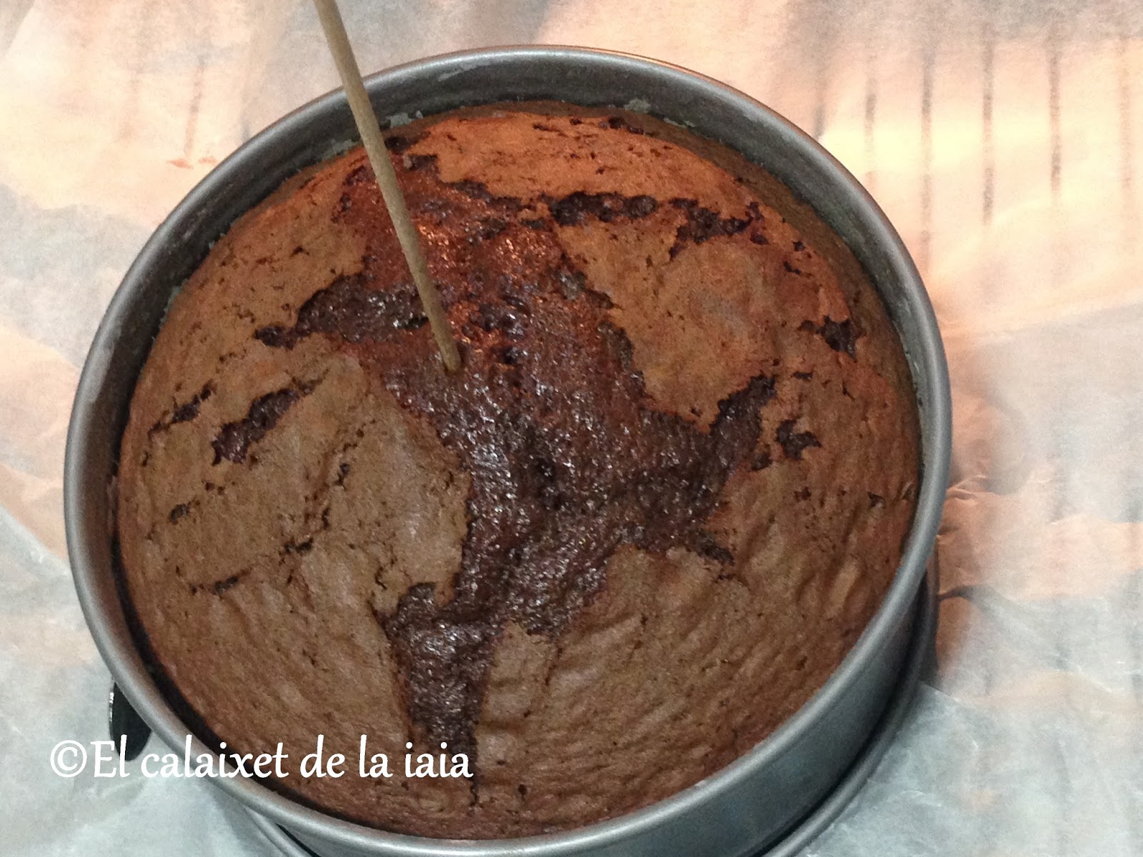 a los 45 minutos más o meno,(abrid y cerrad el horno lo más rápido posible para que pierda el mínimo calor) os aconsejo que comprobéis como va la cocción pinchando en el centro del bizcocho con un palito de brocheta, si sale limpio, ya está listo, de lo contrario dejaremos unos minutos mas. Cuando esté horneado y el palitosalga limpio, abrimos la puerta del horno y dejamos en bizcocho dentro unos 5 minutos, pero con la puerta abierta.