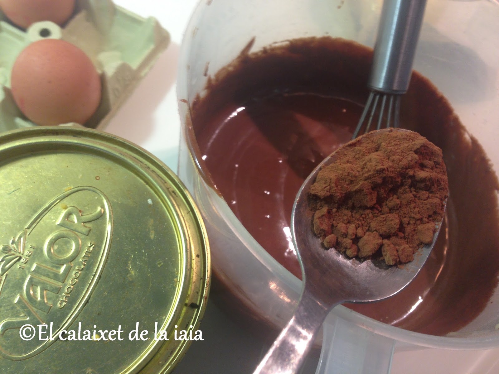 añadimos el chocolate en polvo, procurad que sea cacao puro sin azúcar, y batimos hasta que todo se integre muy bien y nos quede una masa uniforme, sin grumos. El resultado será una masa muy muy densa, tranquilos, es así…