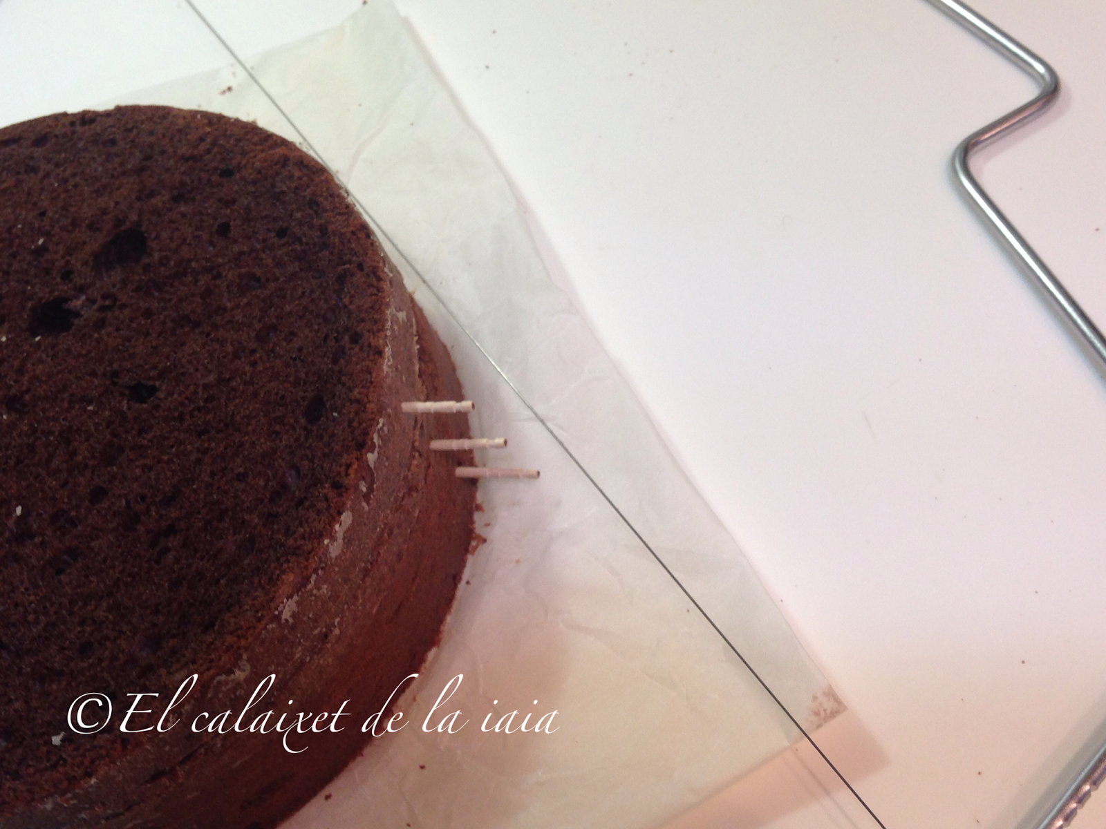 un truco que comparto con vosotros es marcar con unos palillos cada capa de bizcocho antes de rellenarlo, para que luego al volver a montarlo coincidan los cortes, y nos quede muy igualado 😉