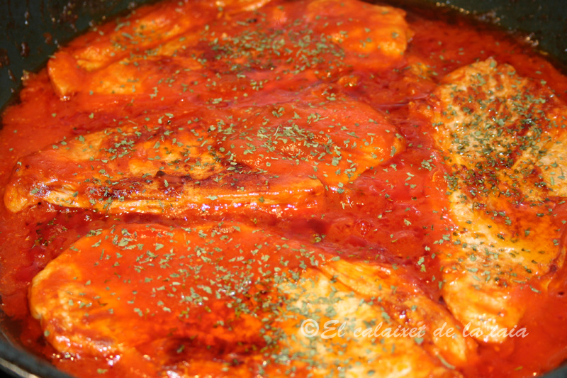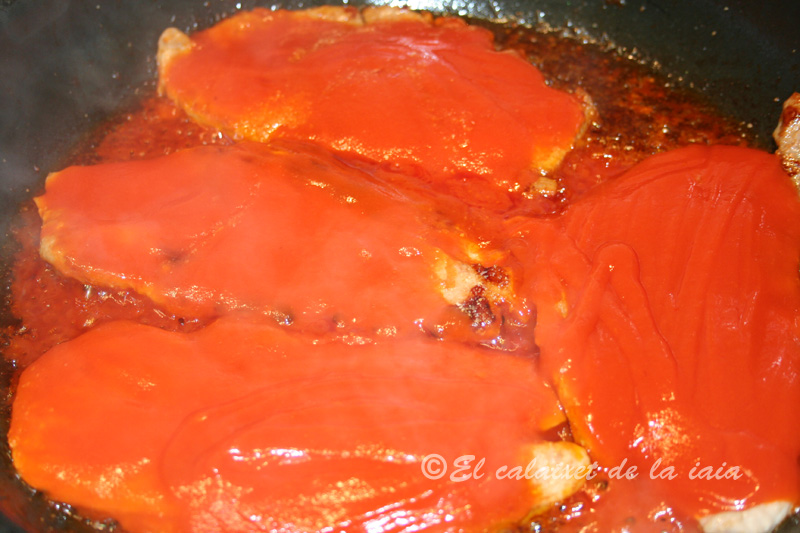 Añadimos el tomate y lo dejamos 5 minutos a fuego medio, a los dos ó tres, volteamos.