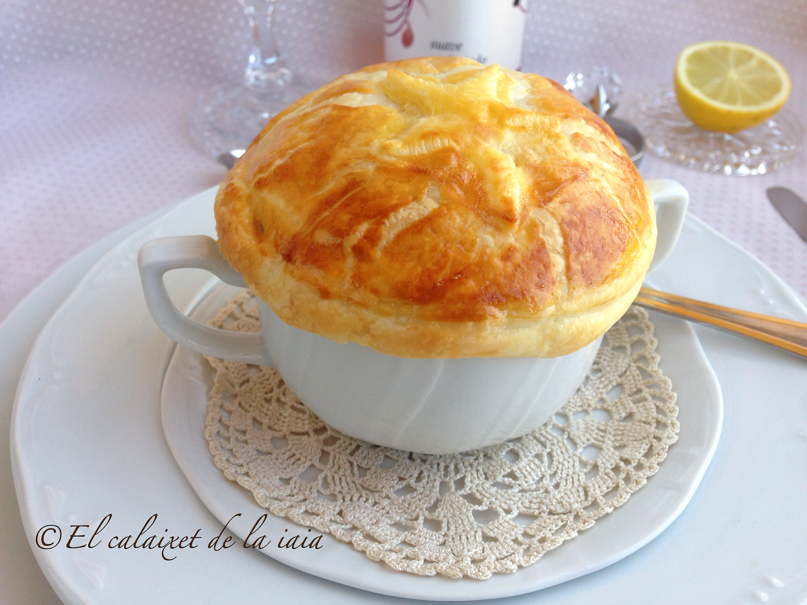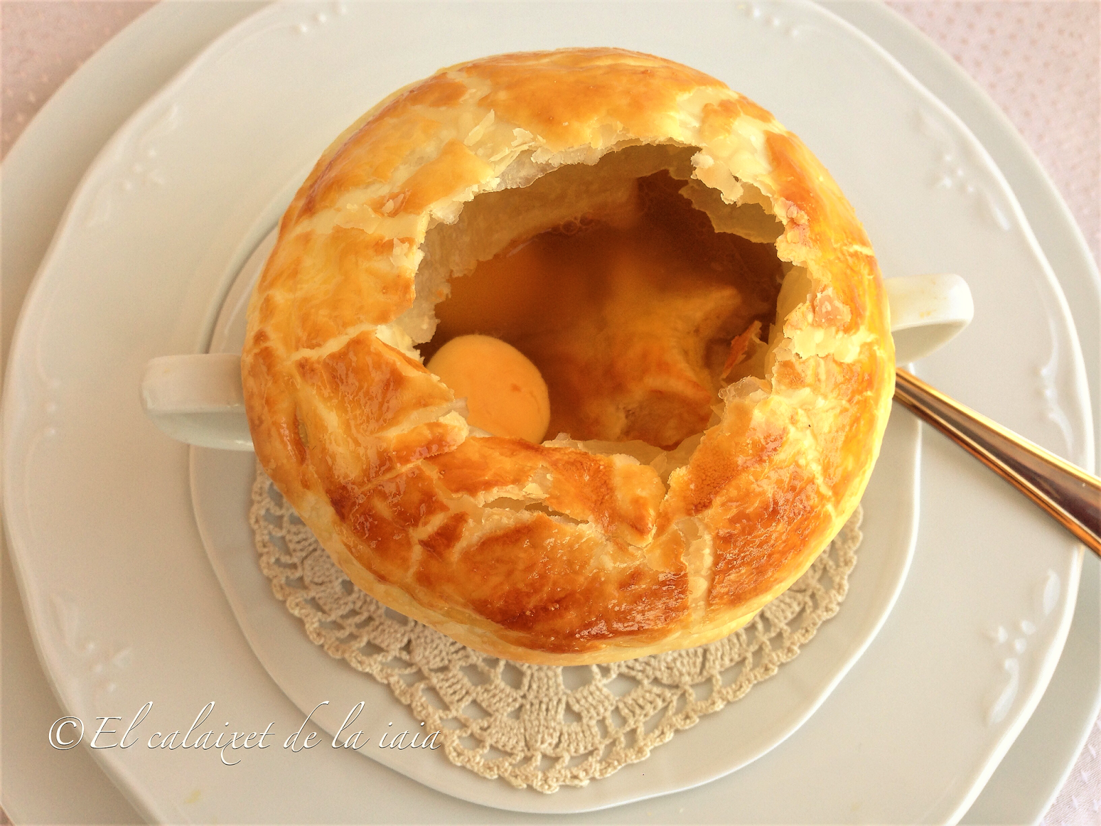 Ya que, es similar a la que os he puesto el enlace, pero sustituyendo los tostones de pan por el hojaldre, puesto que al abrir hueco, el hojaldre cae sobre la sopa y hace el efecto del pan.
