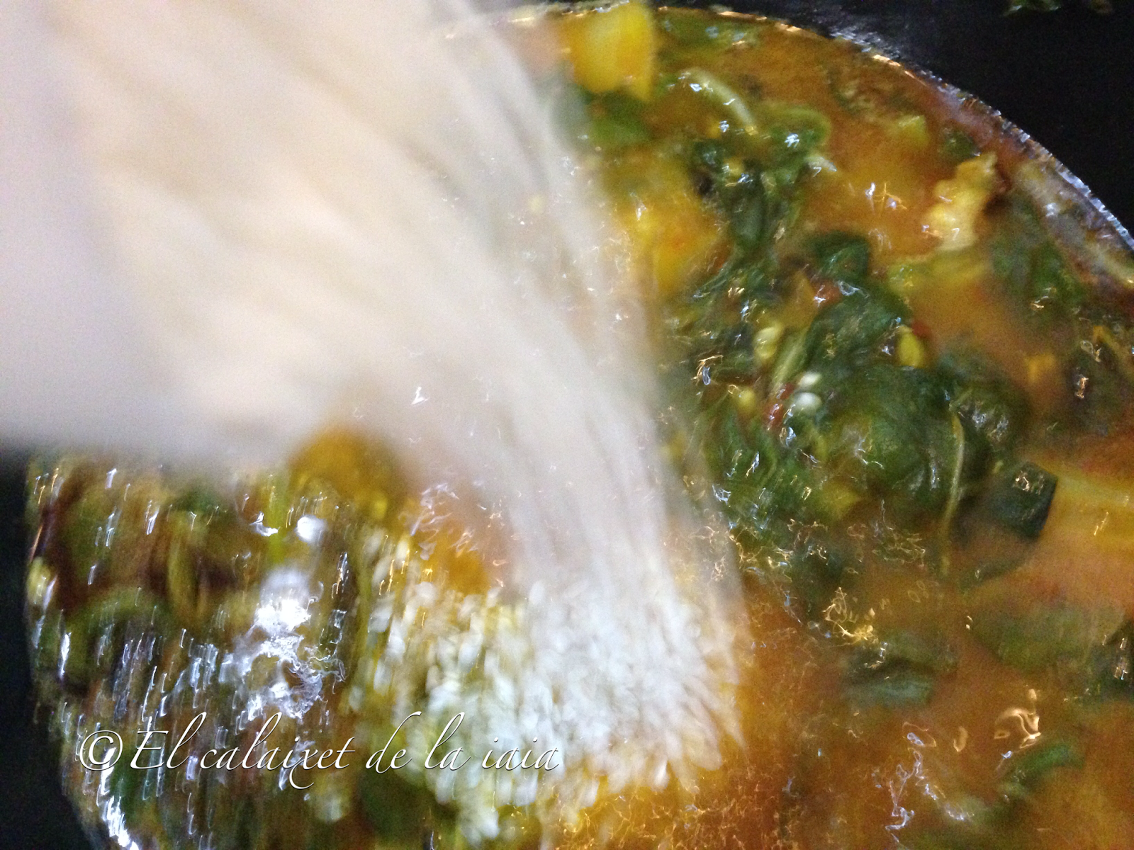 E incorporamos el arroz. El tema de proporción de caldo con arroz, siempre es complicado, lo sé, porque me lo decís mucho, como todo, es cuestión de práctica, antes de tener el blog no medía nunca nada, todo lo cocinaba a ojo (los arroces claro), pero entiendo que os sea difícil yo ahora lo mido por indicaros a vosotros. No hay que confundir nunca el arroz seco con el meloso o caldoso, son completamente distintos, aunque la mayoría de cocineros mete en el mismo saco el meloso y el caldoso y éso no es correcto. Un arroz meloso apenas tiene un pelín de caldo, que es lo que le hace la melosidad, pero apenas nada, un pelín…no están los granos nadando en una piscina de caldo, éso será un arroz caldoso y depende de cómo nos guste de caldoso y como nos guste el caldo líquido espesito, o cremoso….