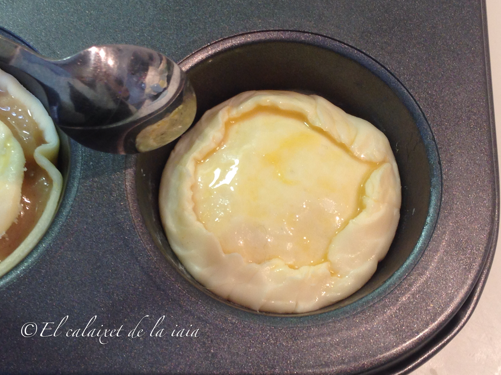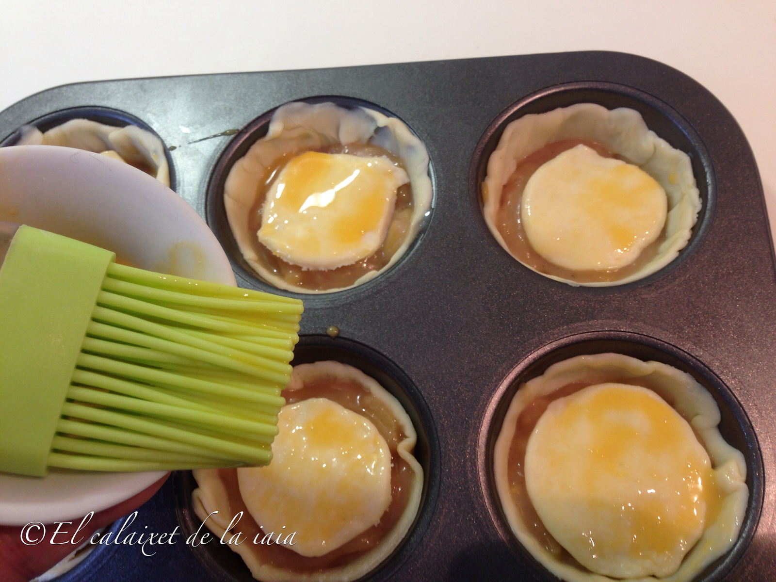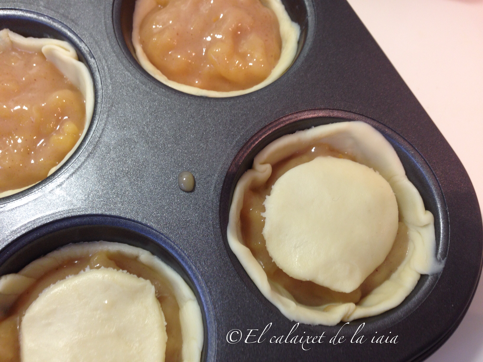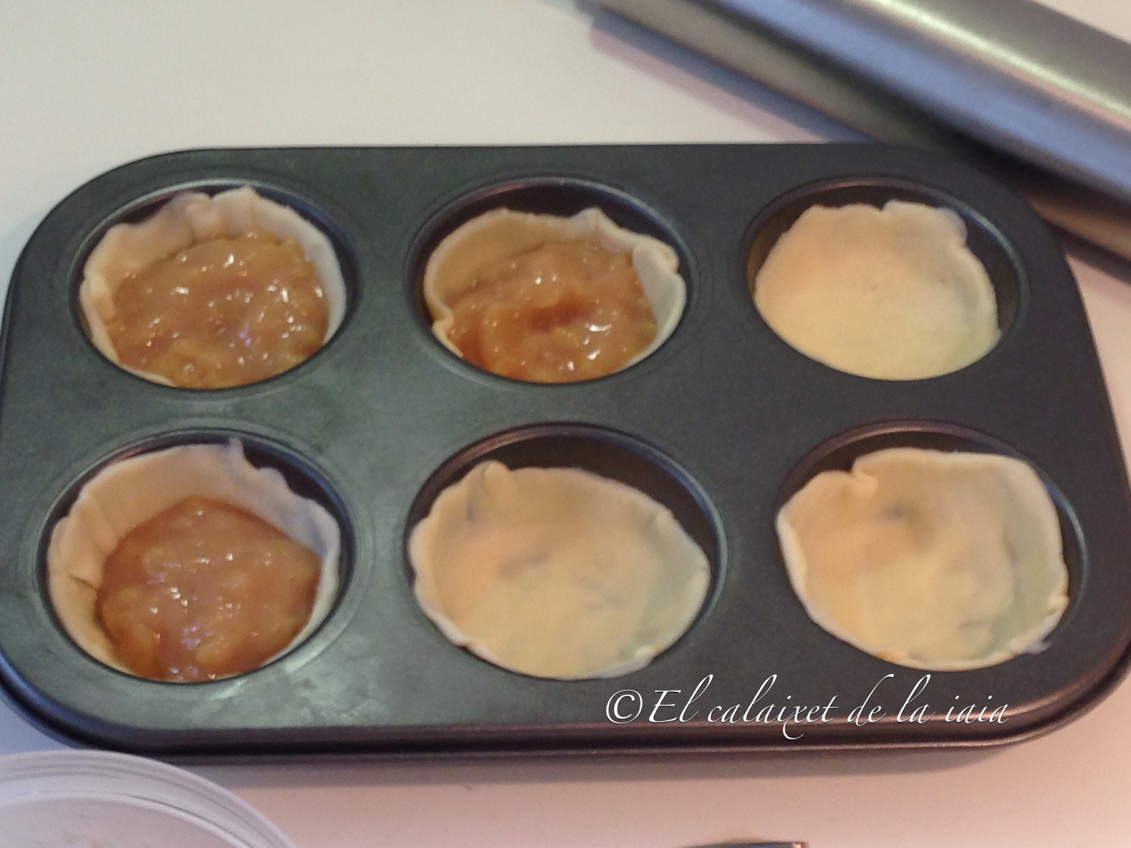 engrasaremos con un poco de mantequilla un molde de magdalenas, y pondremos los círculos de masa de hojaldre, rellenaremos con la compota una vez fría pero no demasiado