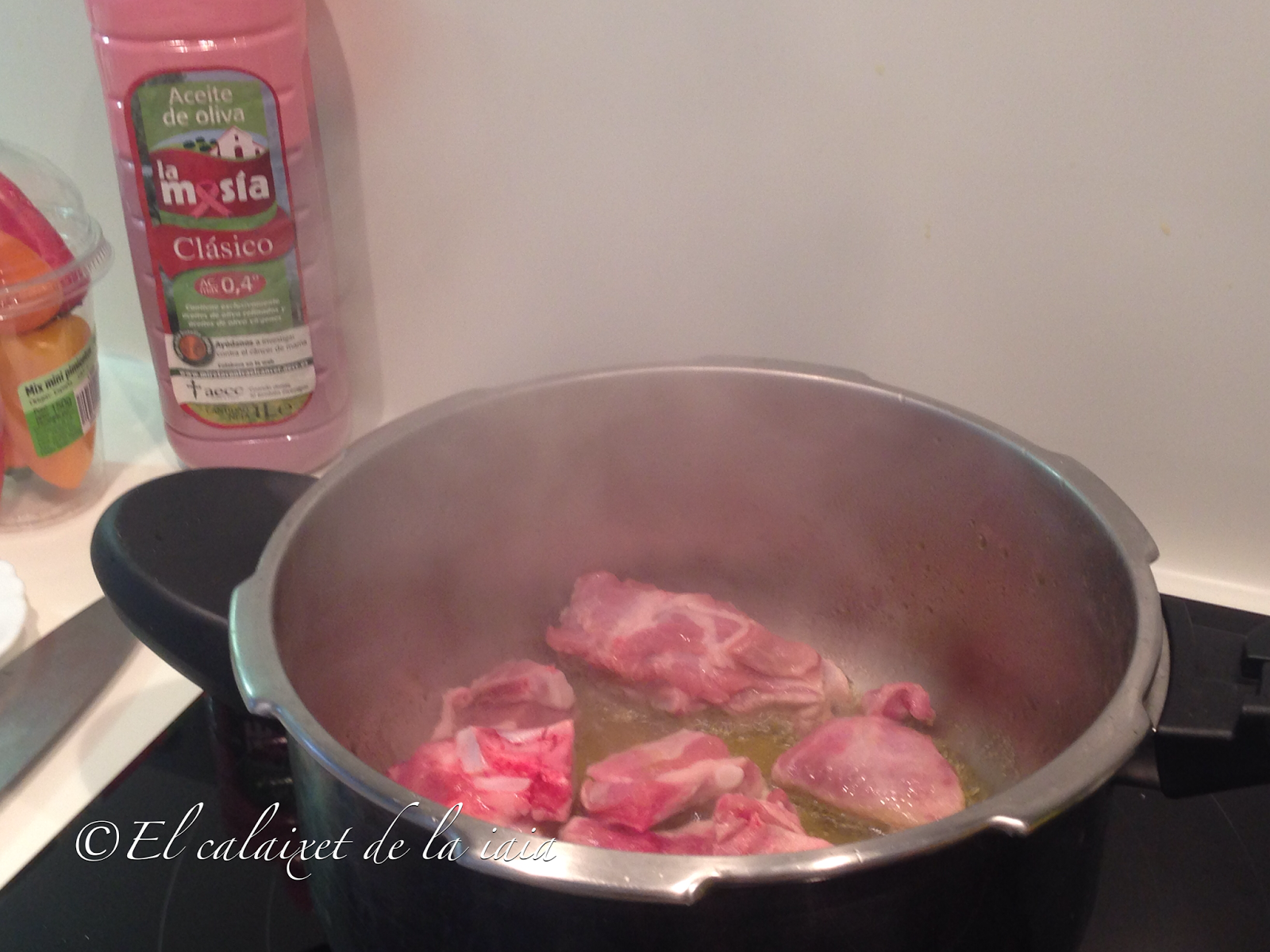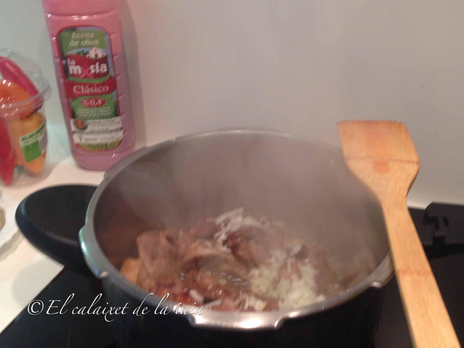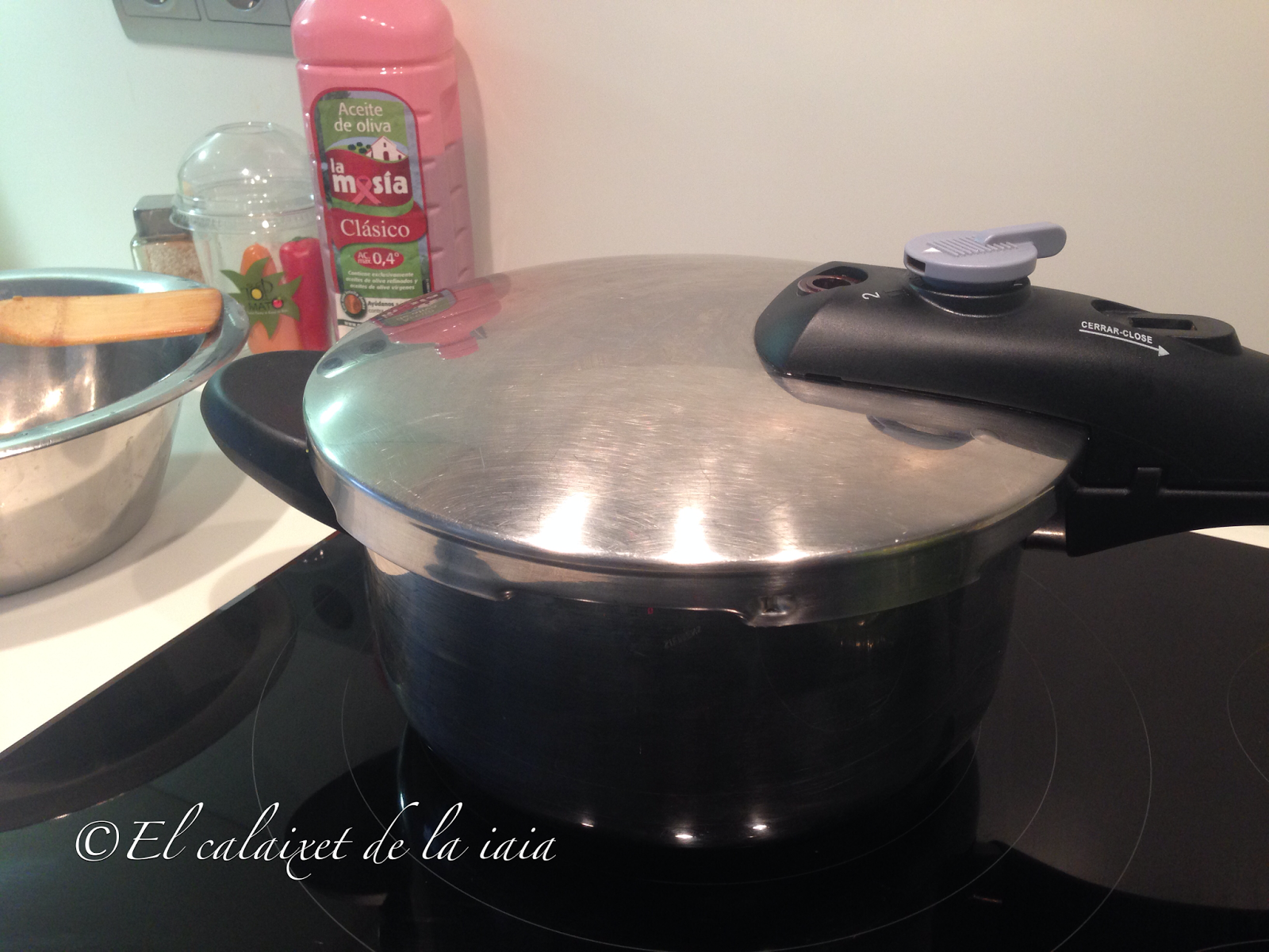 y tapamos la olla, que dejaremos a fuego mínimo durante 15 minutos al nº2 de la olla y a partir que comience a salir el vapor por la válvula. Si lo hacéis en olla expres, serán unos 25 minutos y en cazuela al chup, chup calcula unos 60/70 minutos. Estos tiempos son aproximados porque depende mucho de la olla o cazuela