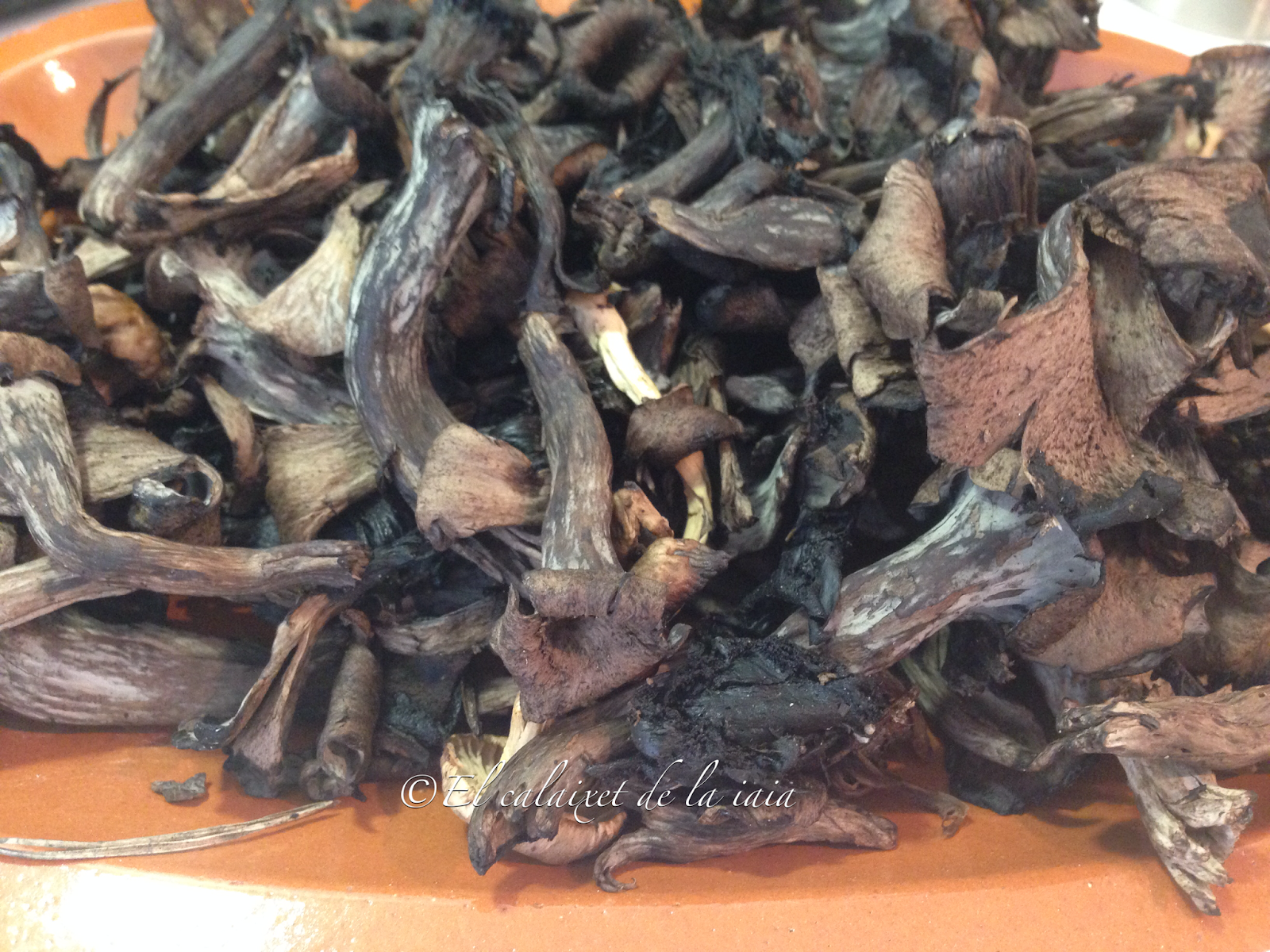 extraeremos las trompetas del agua y las pondremos a escurrir bien para acabar secándolas en papel absorbente de cocina. El agua del remojo, no la tiréis (aquí no tiramos nada jeje) ya que tienen nutrientes y sabor y la podéis utilizar para otras preparaciones, como por ejemplo una crema, unas croquetas, arroces, caldo etc.