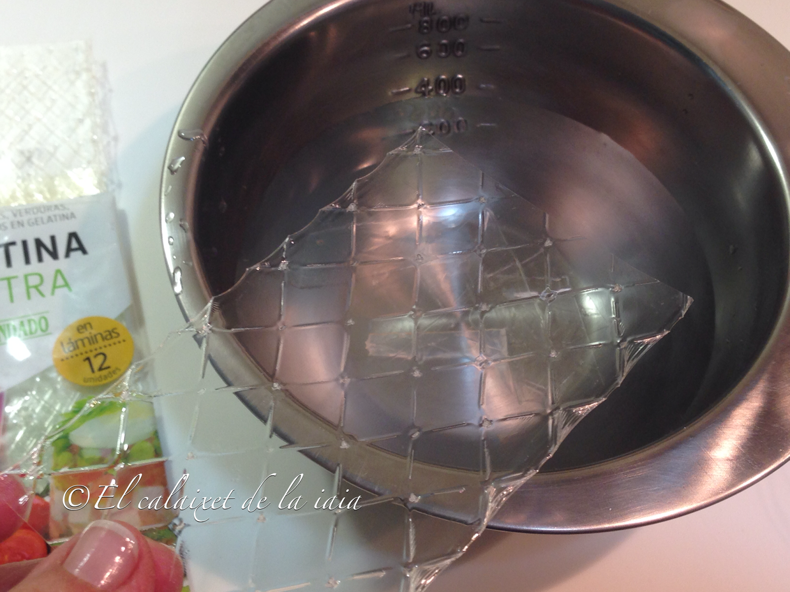 Pondremos a hidratar las hojas de gelatina, poniéndolas en agua fría durante cinco minutos