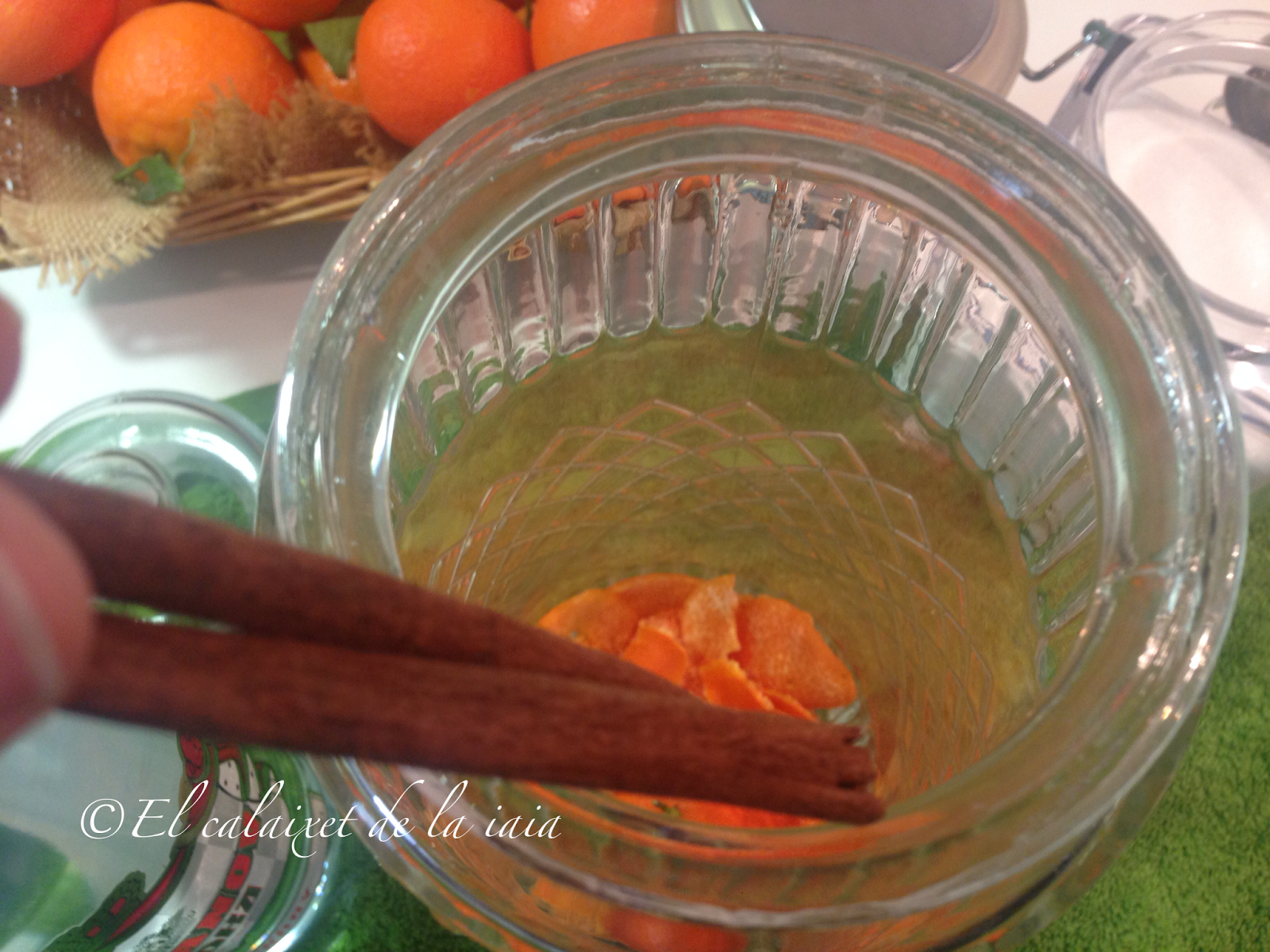 En un recipiente de cristal que tenga la boca ancha, iremos colocando las pieles limpias de parte blanca, que por si no lo sabéis se llama el ALBEDO, por si os interesa saber cómo se llama la parte coloreada de los cítricos, aprovecho la ocasión para deciros que se llama el FLAVEDO y que es la parte más visible de la piel, la que tiene color y la que contiene