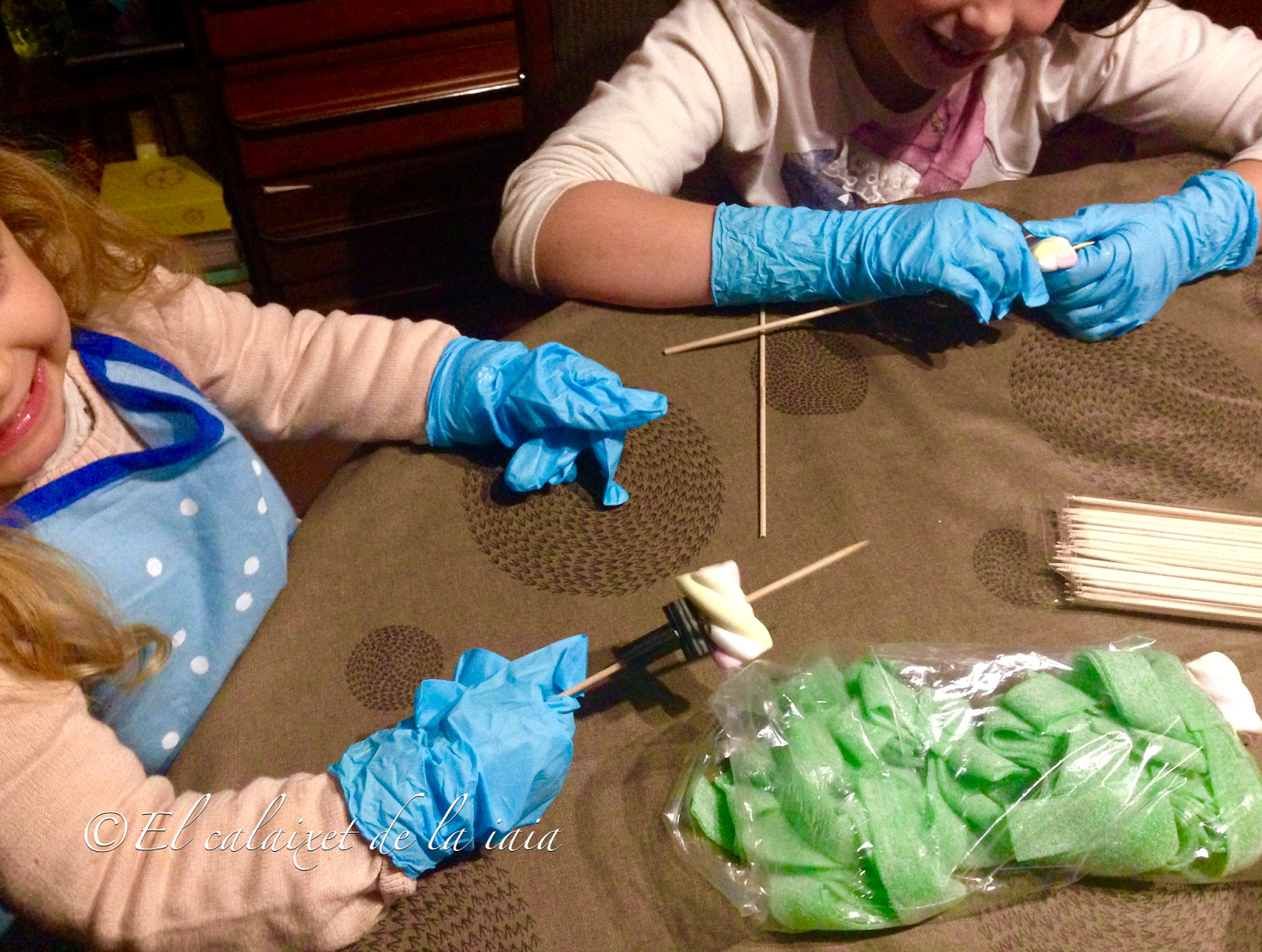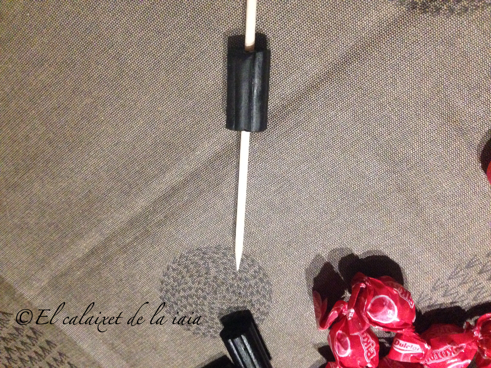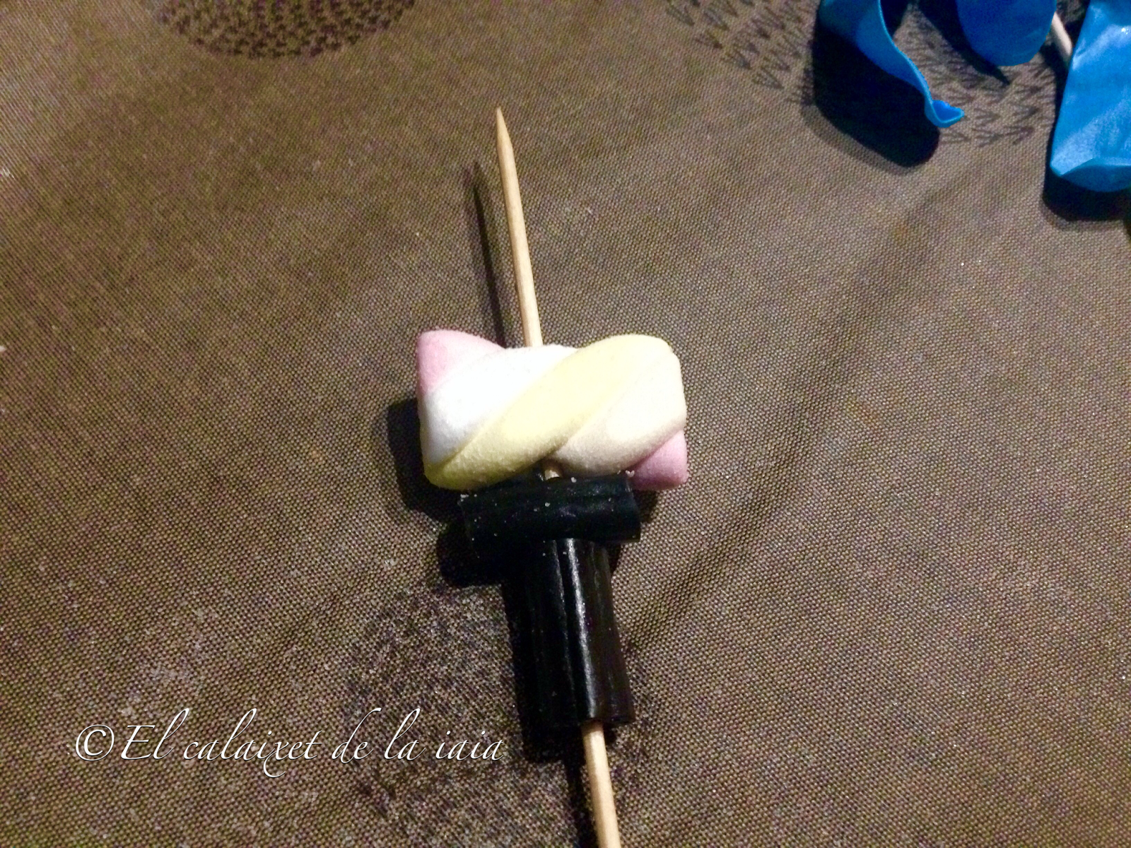 como las nubes son tan pegajosas y vamos a insertar golosinas que llevan mucho azúcar, os recomiendo untar un poco la parte de la punta del palito de madera con un poco de mantequilla o aceite de coco.