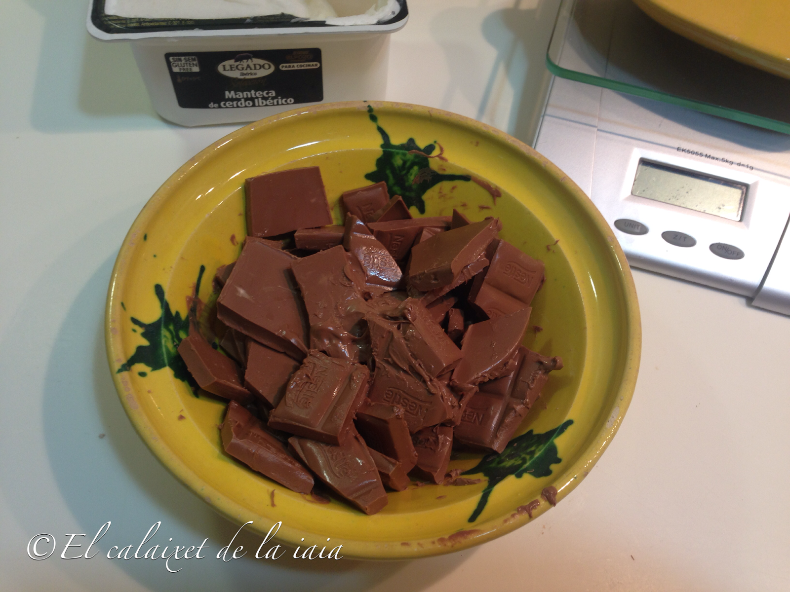 sacamos el recipiente, pesamos 50g de manteca de cerdo