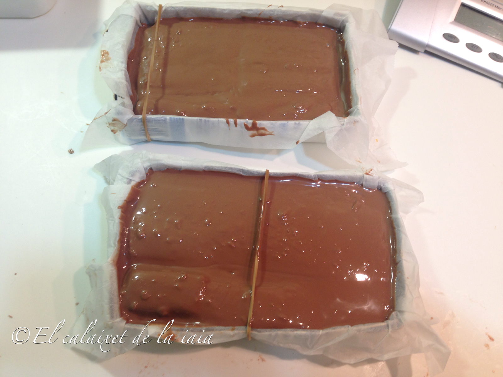 En un recipiente apto para microondas trocearemos el chocolate. Ésta partida de turrones la he preparado de chocolate con leche, porque a mi Pau no le va en chocolate puro, luego he hecho dos tabletas de turrón más con chocolate fondant.