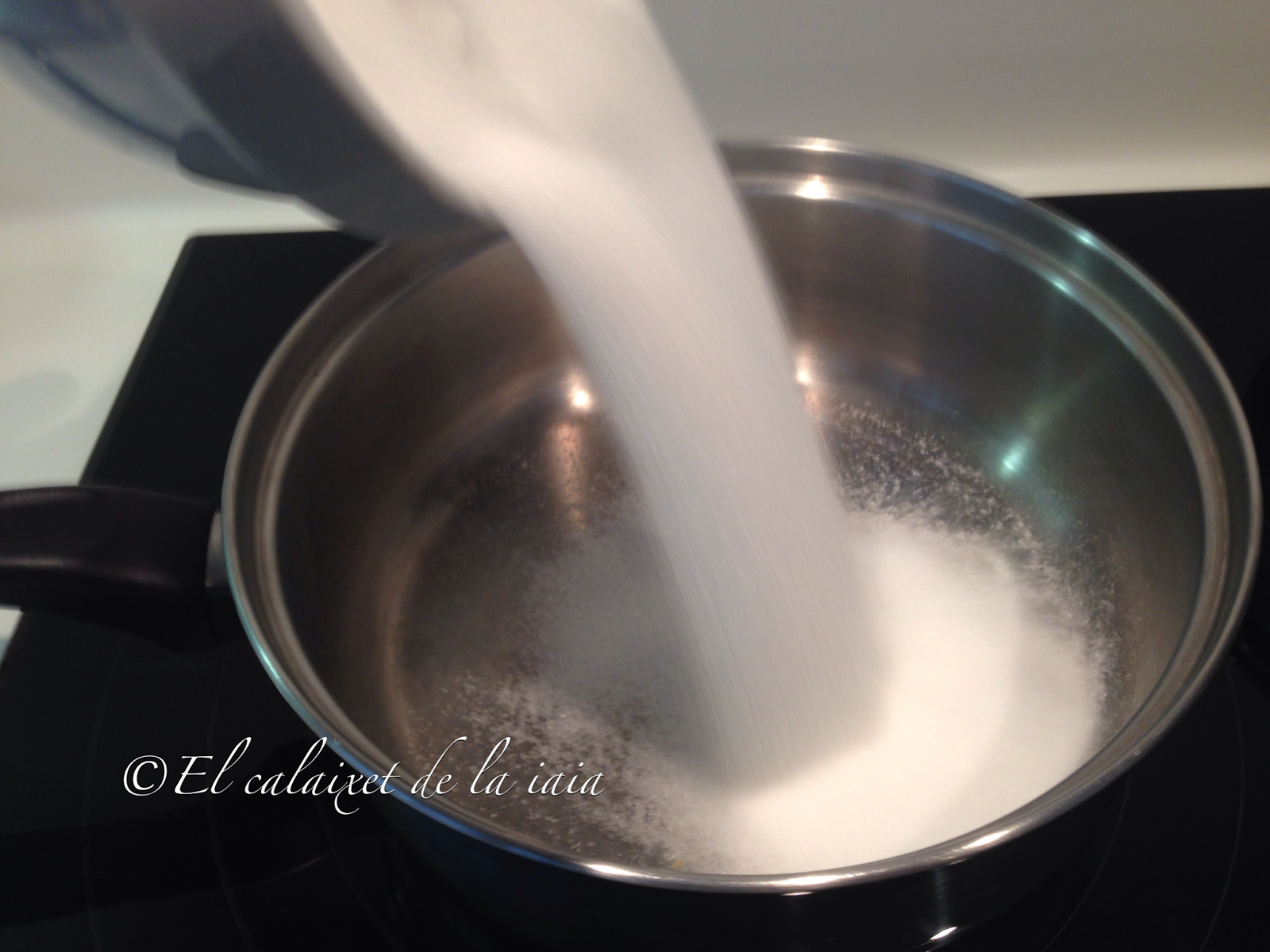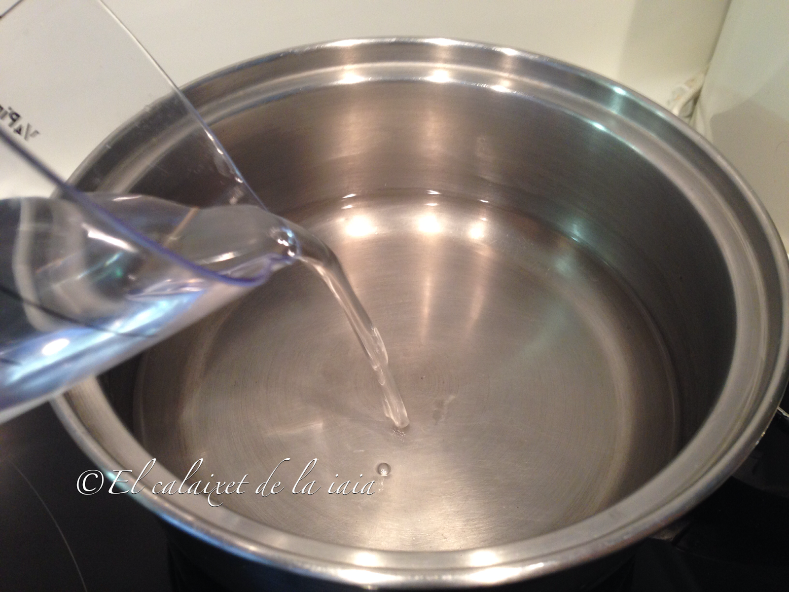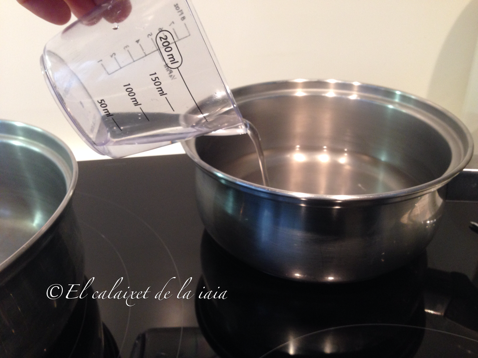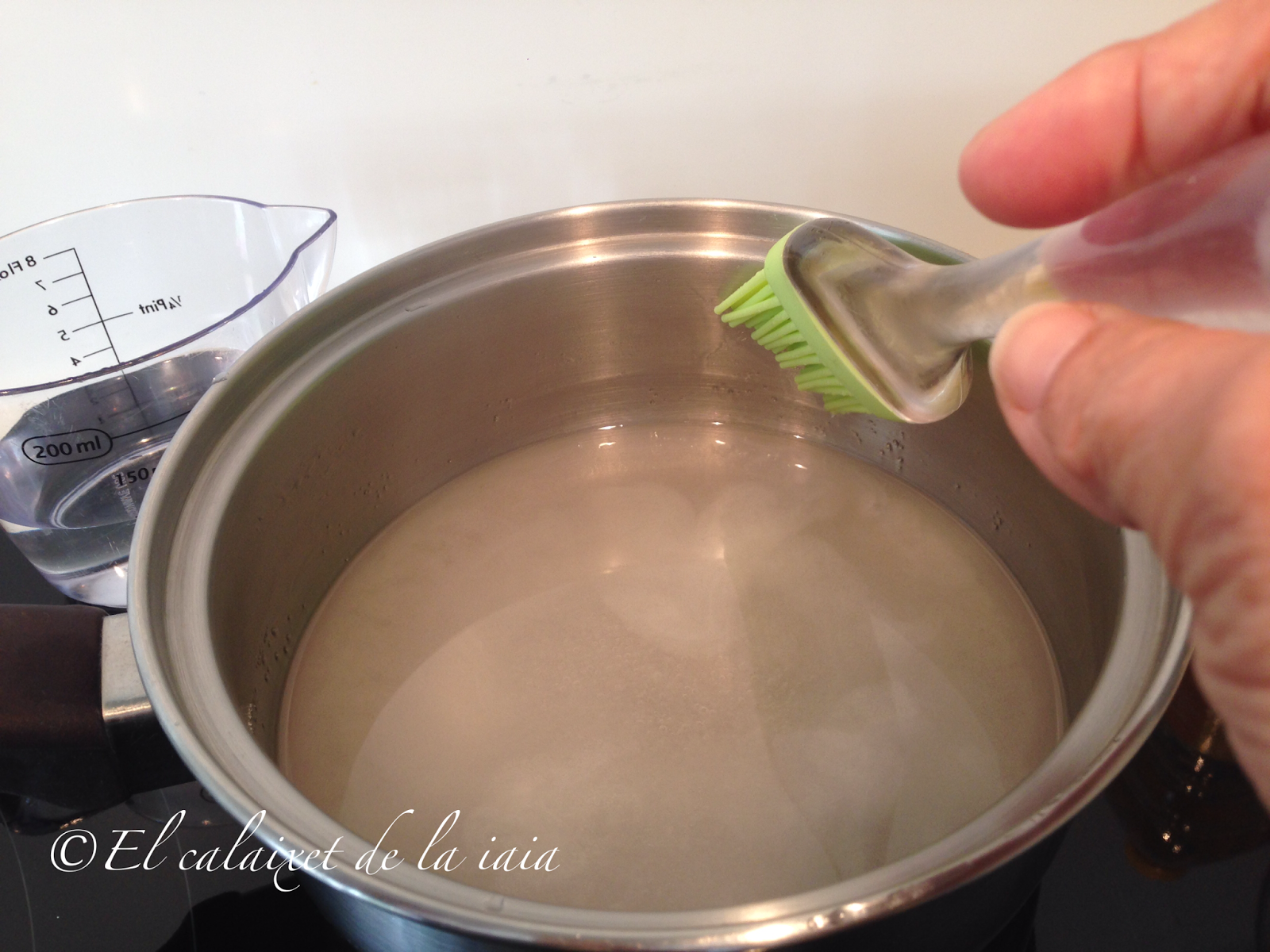 añadiremos 100 ml de agua y haremos de nuevo el proceso de pintar las paredes con el pincel con agua para que no se pegue al cazo