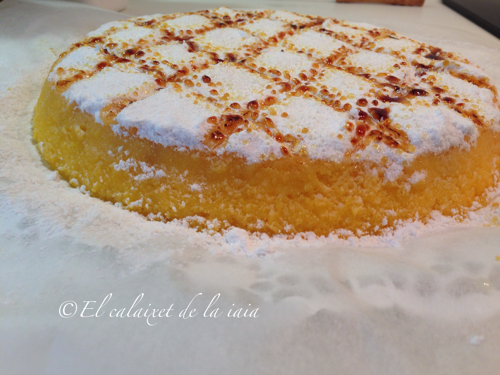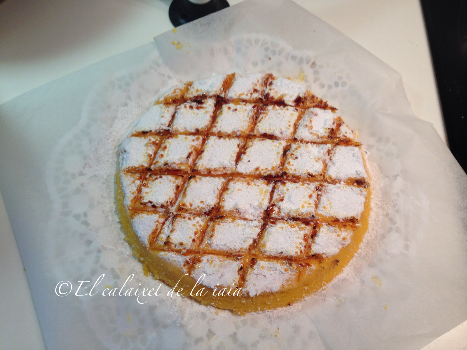 La preparación de esta tarta se hace en dos partes, con dos puntos importantes en cada una de ellas; primera el bizcocho con el almíbar y segunda la crema de yema con el quemado del azúcar glas. La primer parte necesita un reposo de mínimo 12 horas, así que comenzamos. Para ello, cortaremos un círculo de papel sulfurizado o de horno del tamaño de la base del molde elegido