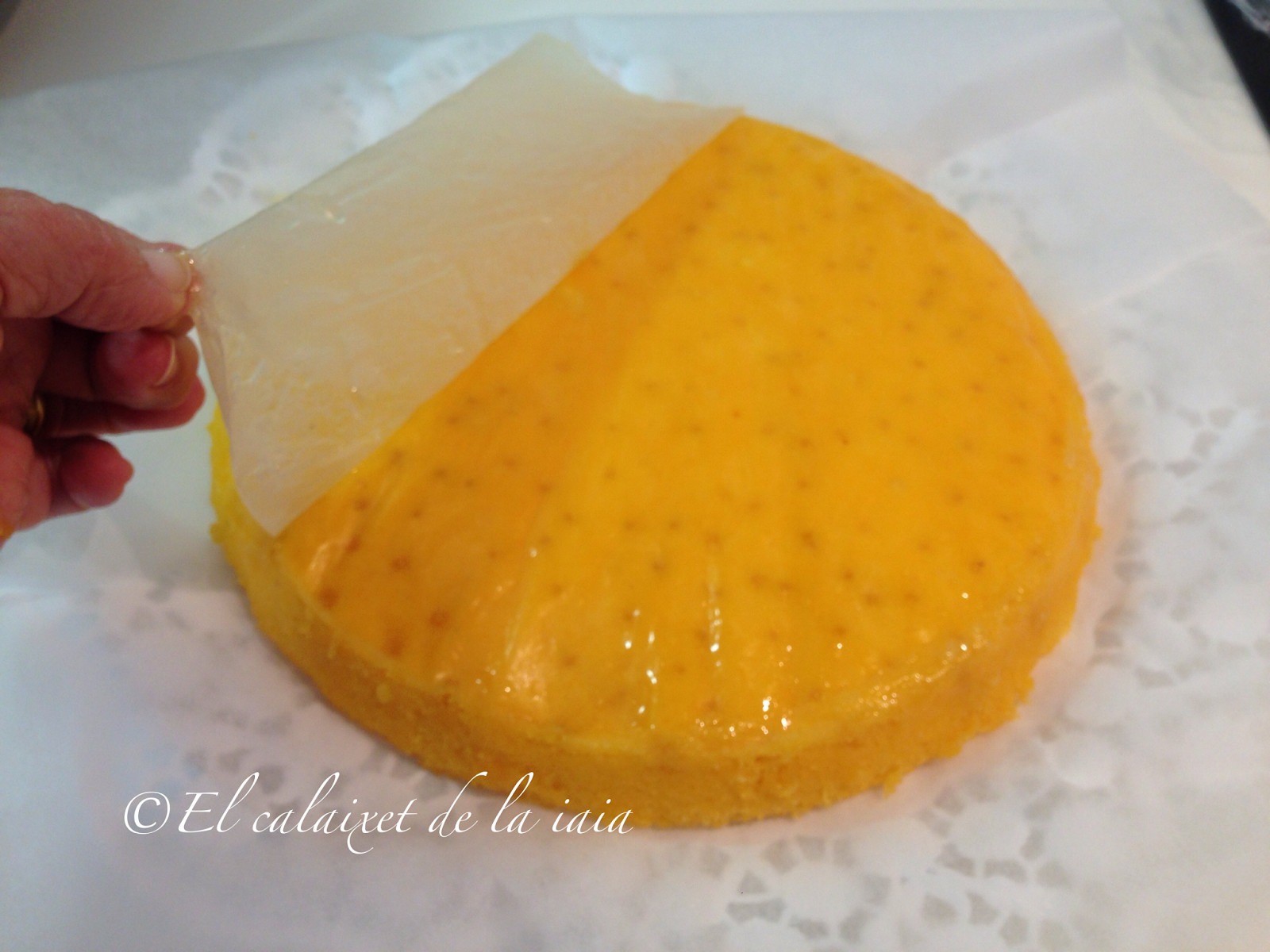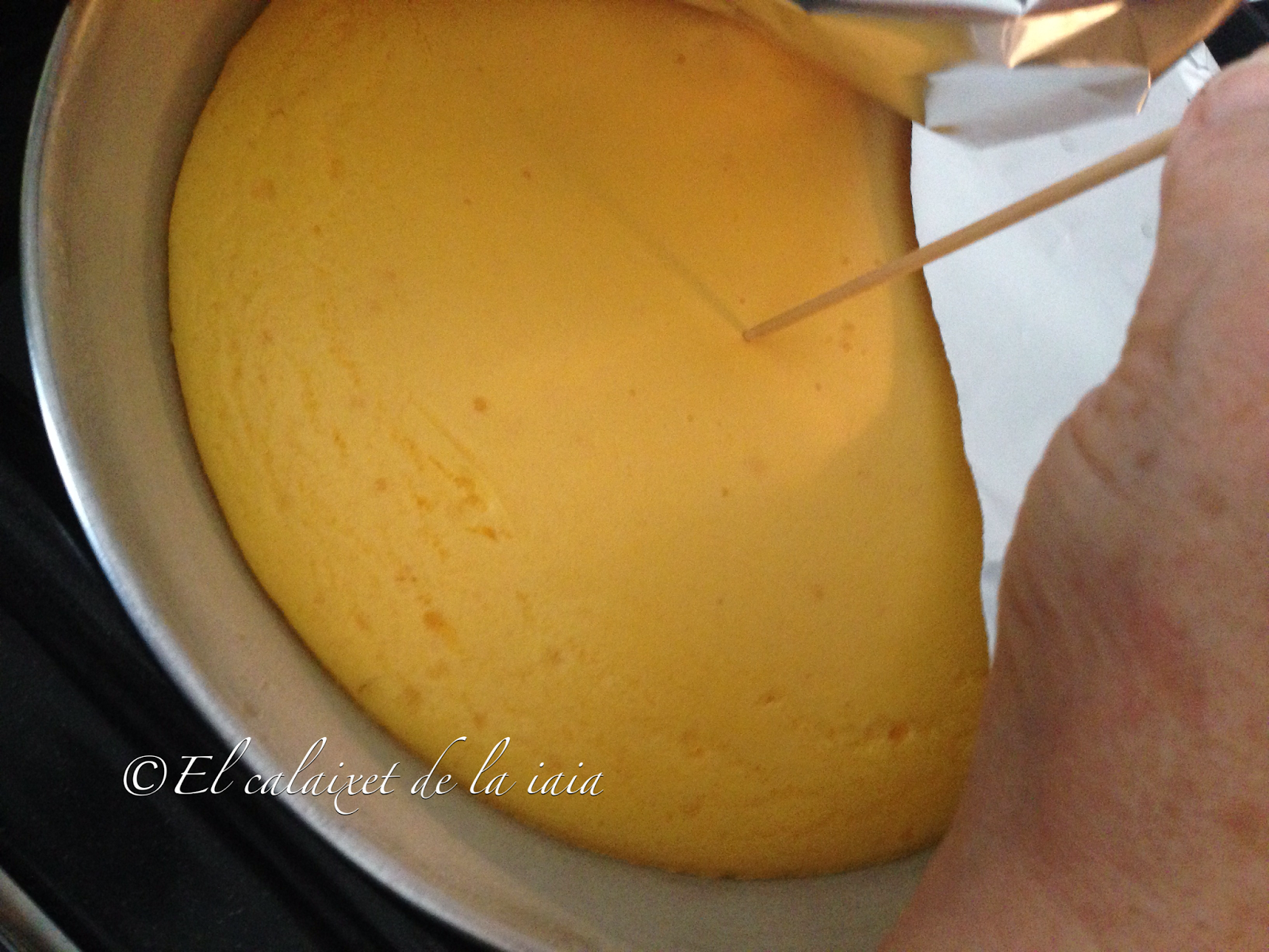 Con un palo de brocheta haremos perforaciones por todo el bizcocho que teníamos enfriando, pero sin sacar del molde e iremos calando todo el bizcocho con el almíbar. Hemos de poner tooodooo el almíbar que hemos preparado, tener en cuenta que el bizcocho lo hemos hecho sin pizca de azúcar y la función del almíbar es la de endulzar y proporcionar humedad al bizcocho, así que aunque os parezca mucho, hacedme caso y usar hasta la última gota. Taparemos el molde con papel film y dejamos en el frigo como mínimo 12 horas. Yo lo dejo toda la noche y sigo con la tarta al día siguiente. Si escalonamos los pasos resulta muy sencilla y fácil de hacer 😉