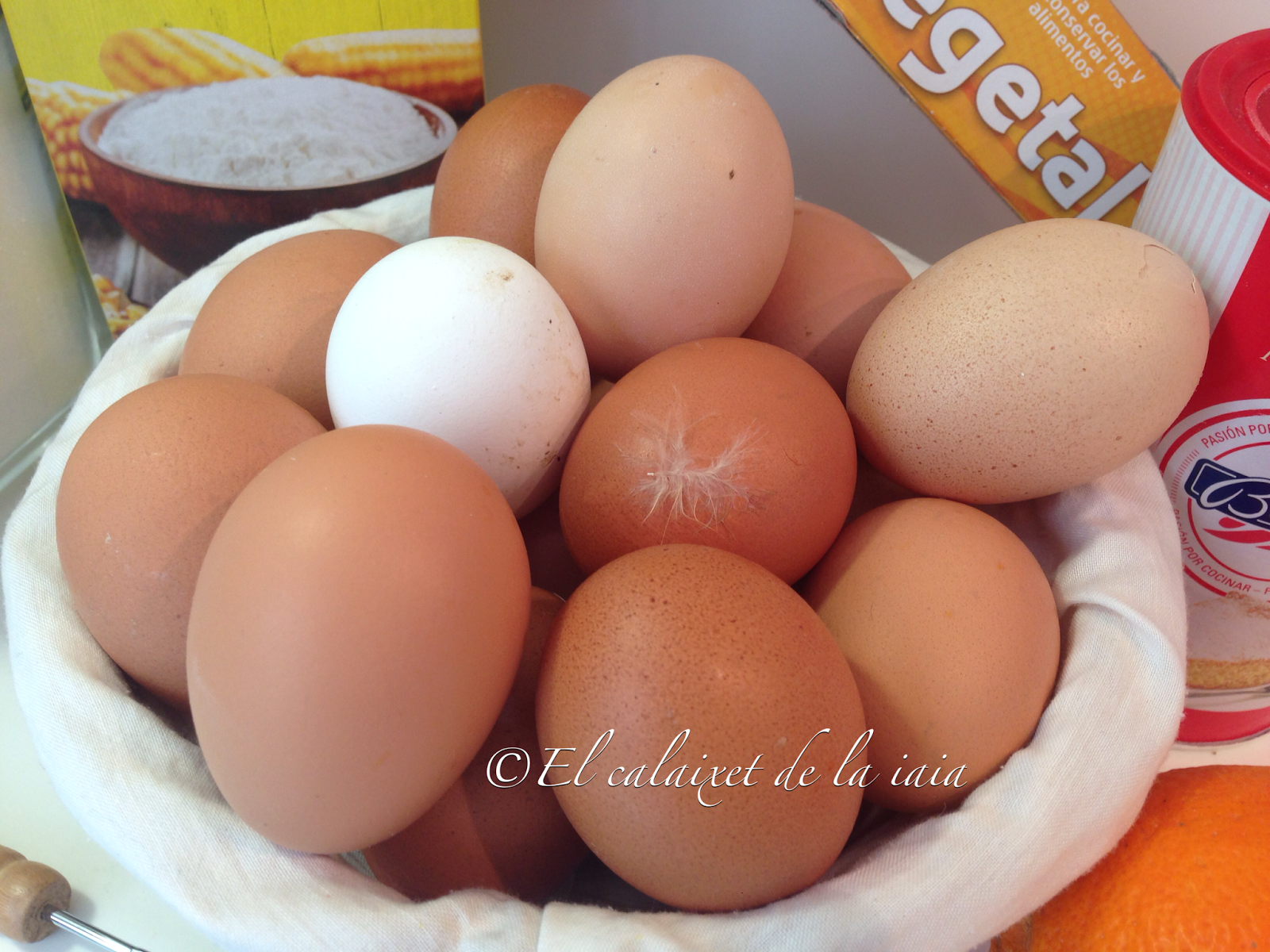 Utilizo normalmente huevos ecológicos caseros, de las gallinas que crían mi nuera y mi hijo mayores y que son una verdadera delicia (tengo una amiga que dice que son huevos de pata negra, como el jamón de Jabugo) y como podéis ver cada uno de un color y tamaño