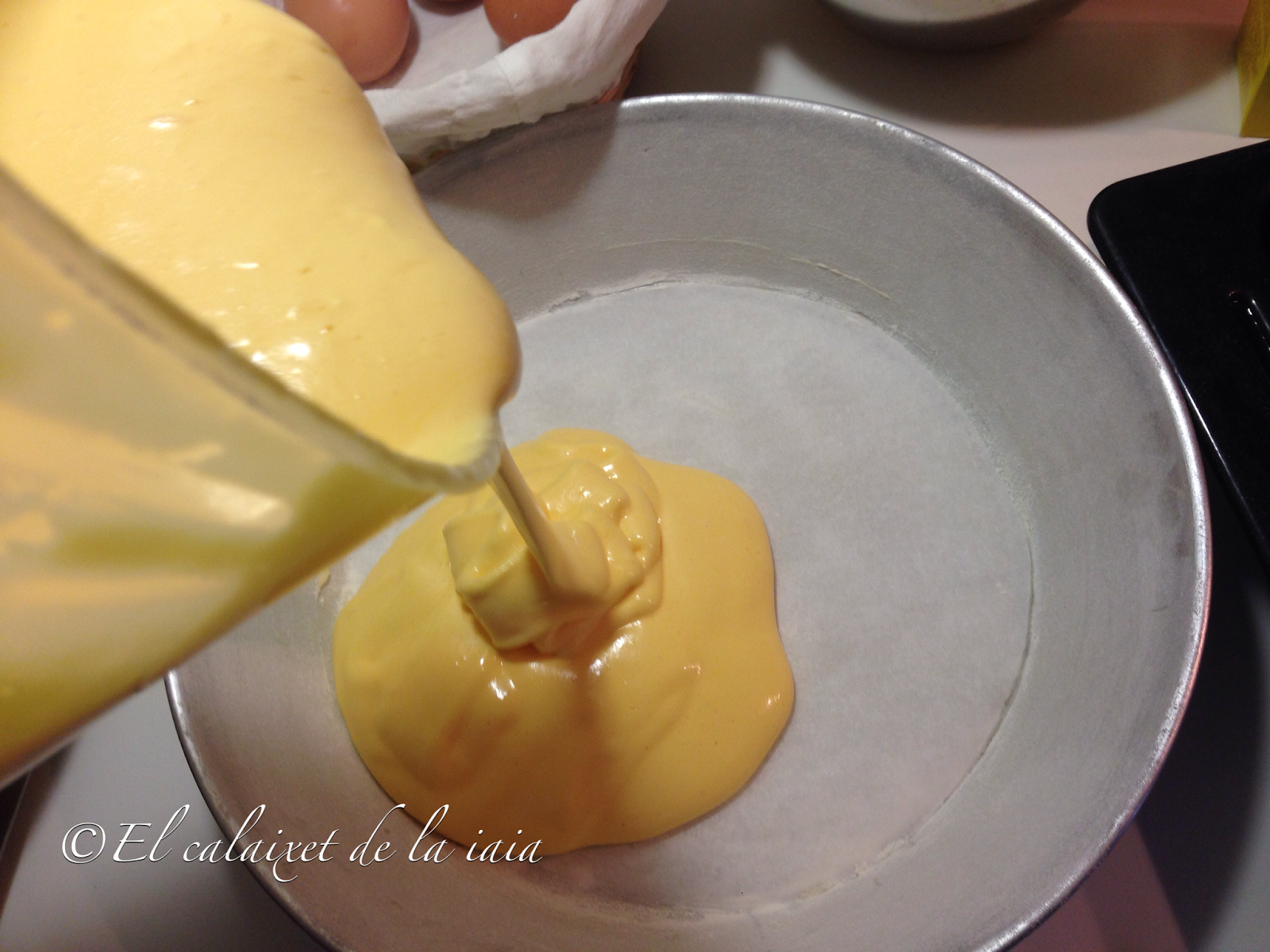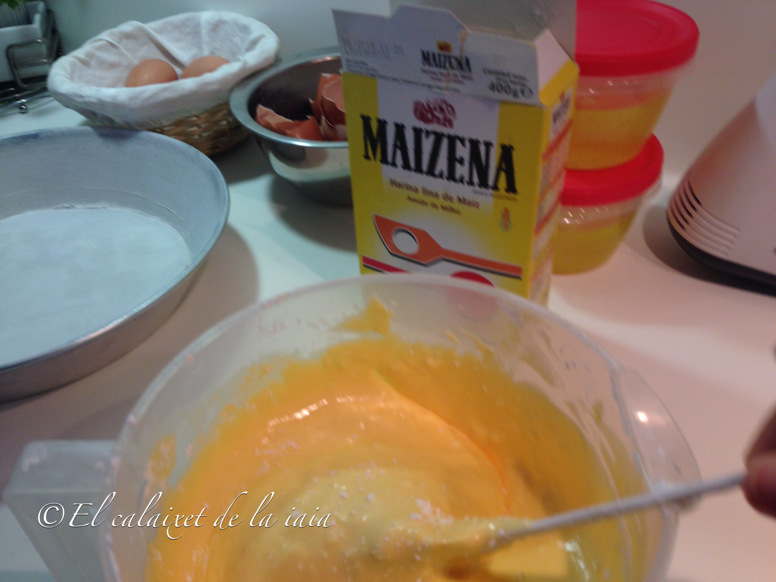 volcaremos inmediatamente el almíbar sobre las yemas con la Maizena y batiremos rápida e incesantemente.Pasaremos de nuevo todo al cazo y pondremos a fuego bajo removiendo sin cesar, hasta que veamos que se convierte casi en un flan