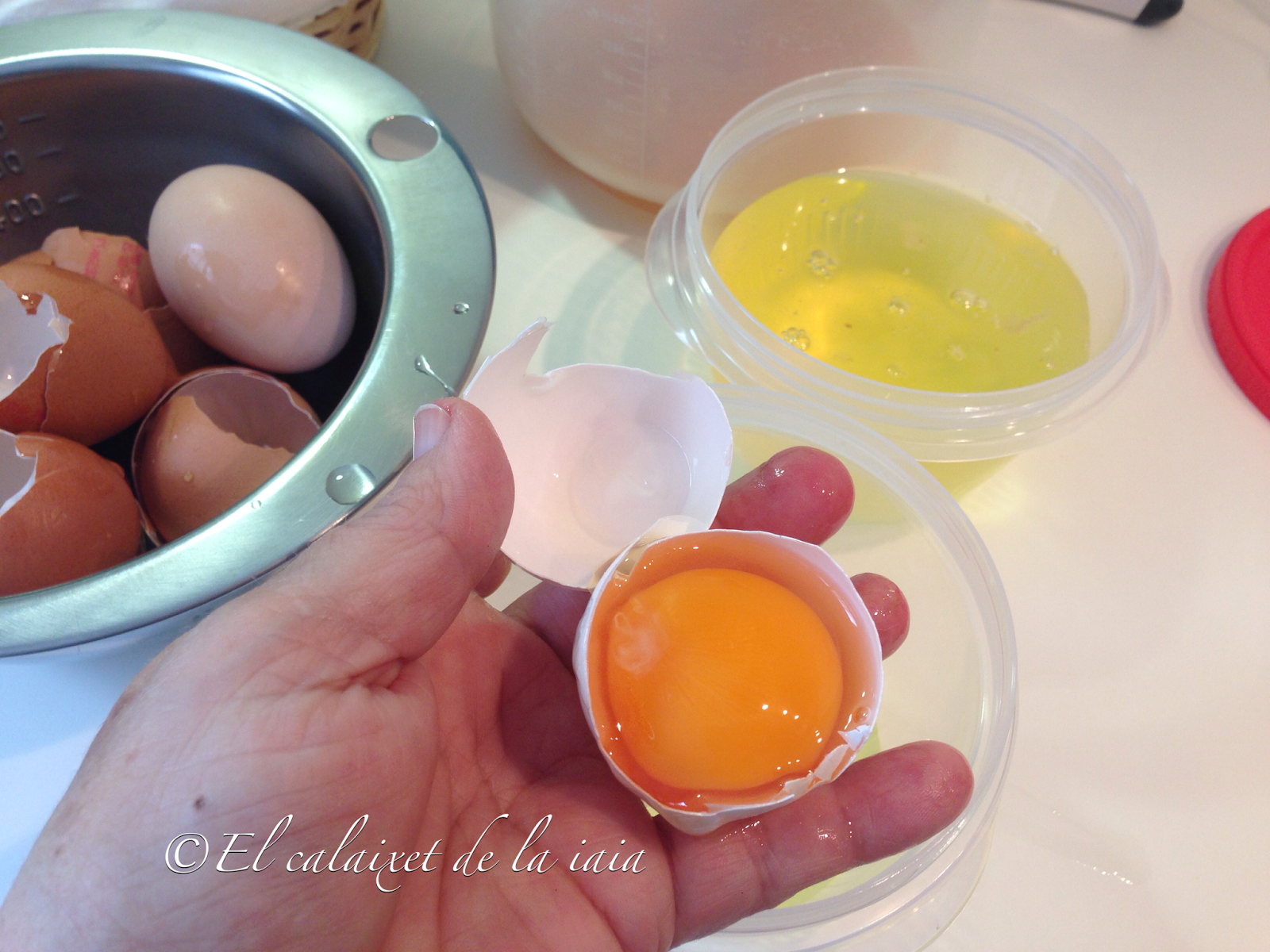 ……y al día siguiente vamos a montar y terminar nuestra capuchina. Separamos 6 yemas de sus claras (guardar todas las claras en un bote de cristal cerrado y en el frigo, mas adelante os pondré una receta para aprovecharlas, que aqui no se desperdicia nada)