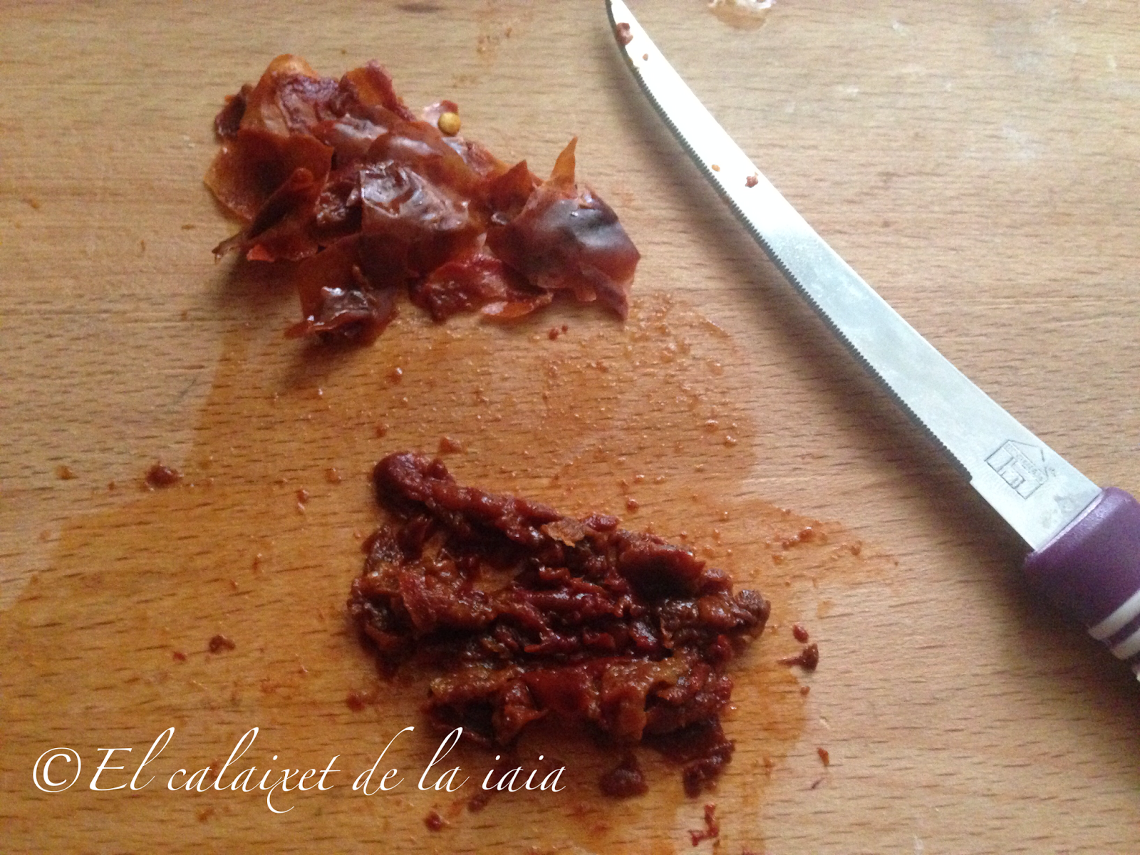 Para empezar, enjuagamos y cortamos la ñora por la mitad, quitamos las semillas y la ponemos a remojo en medio vasito de agua tibia unos 20 minutos,