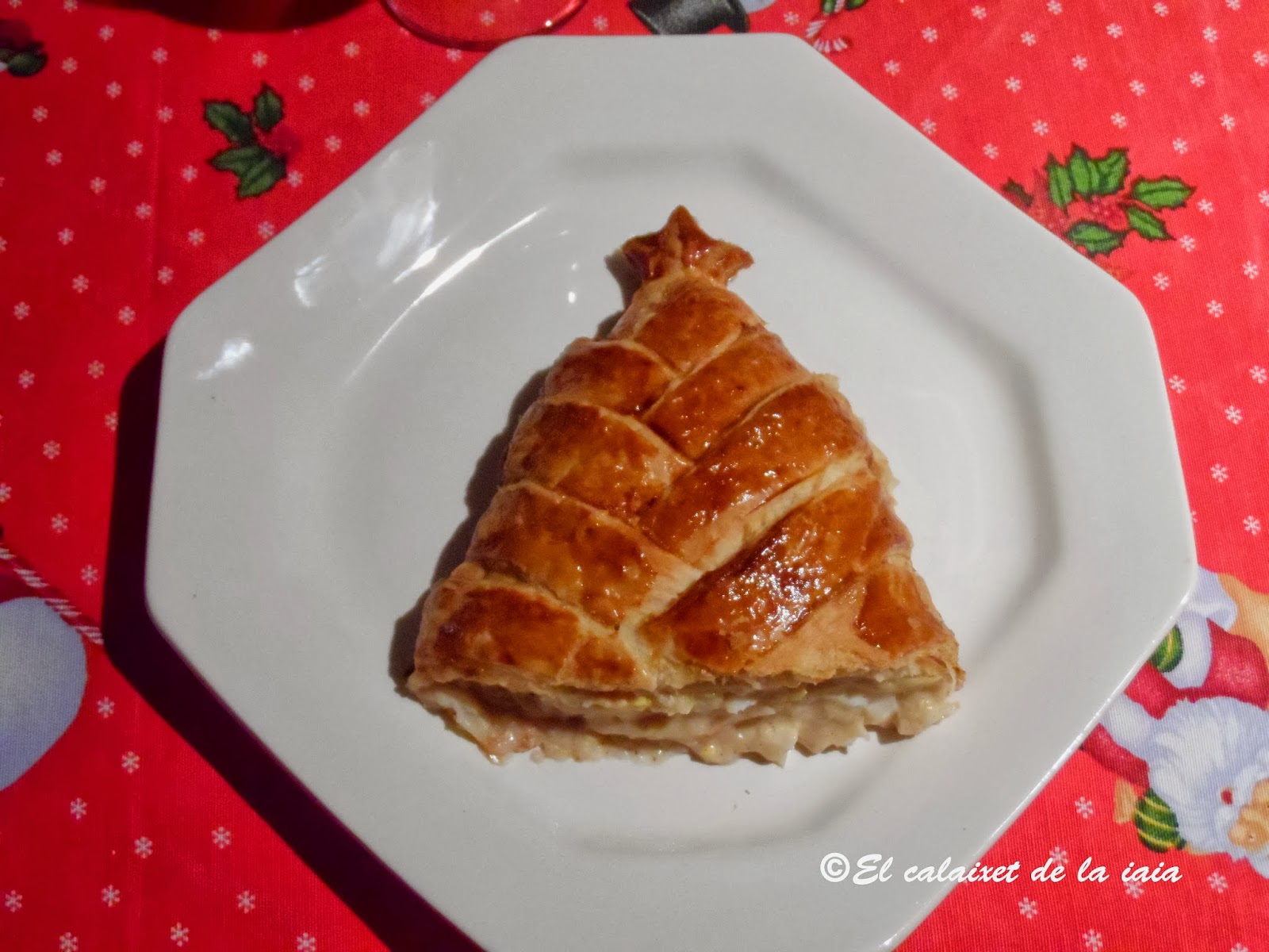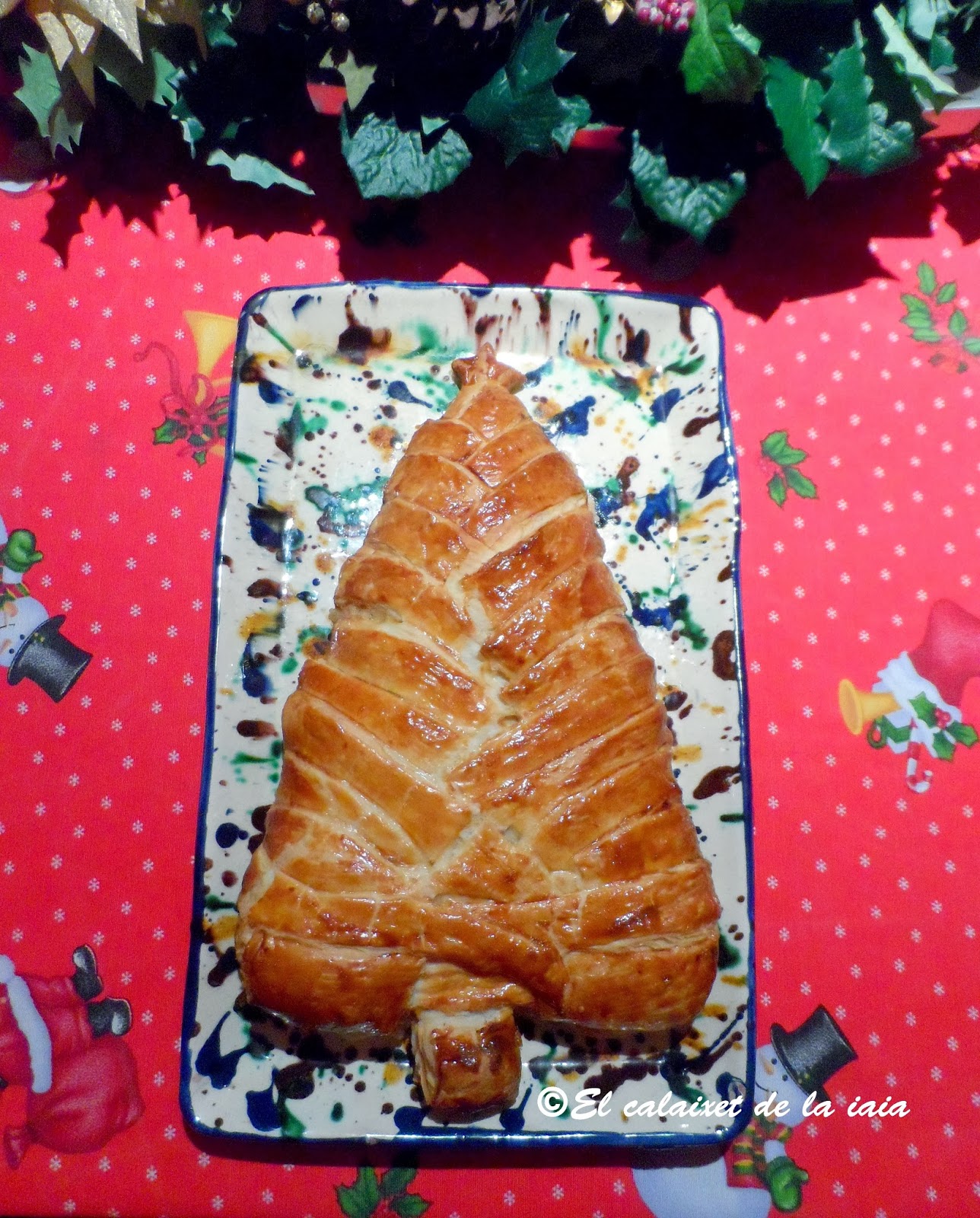 En la pescadería del mercado, repartían un día unos folletos con recetas para cocinar el pescado en celebraciones, me gustó una de las recetas, e hice mi adaptación particular para que saliera más económica, cambiando la merluza fresca por congelada y los langostinos por gambita pelada, la nata por bechamel casera… y un par de cositas más. Para darle un aire más Navideño le he dado forma de abeto (en lugar de forma empanada como decía la receta original), como hice el año pasado con las pizzas de Nochebuena para los nanos.
