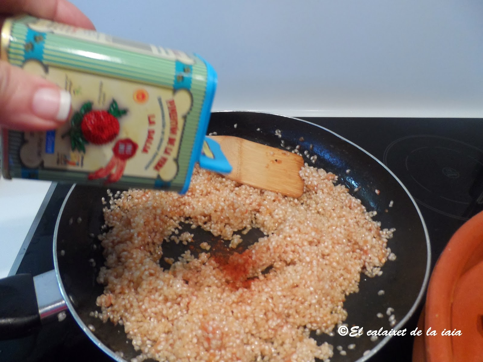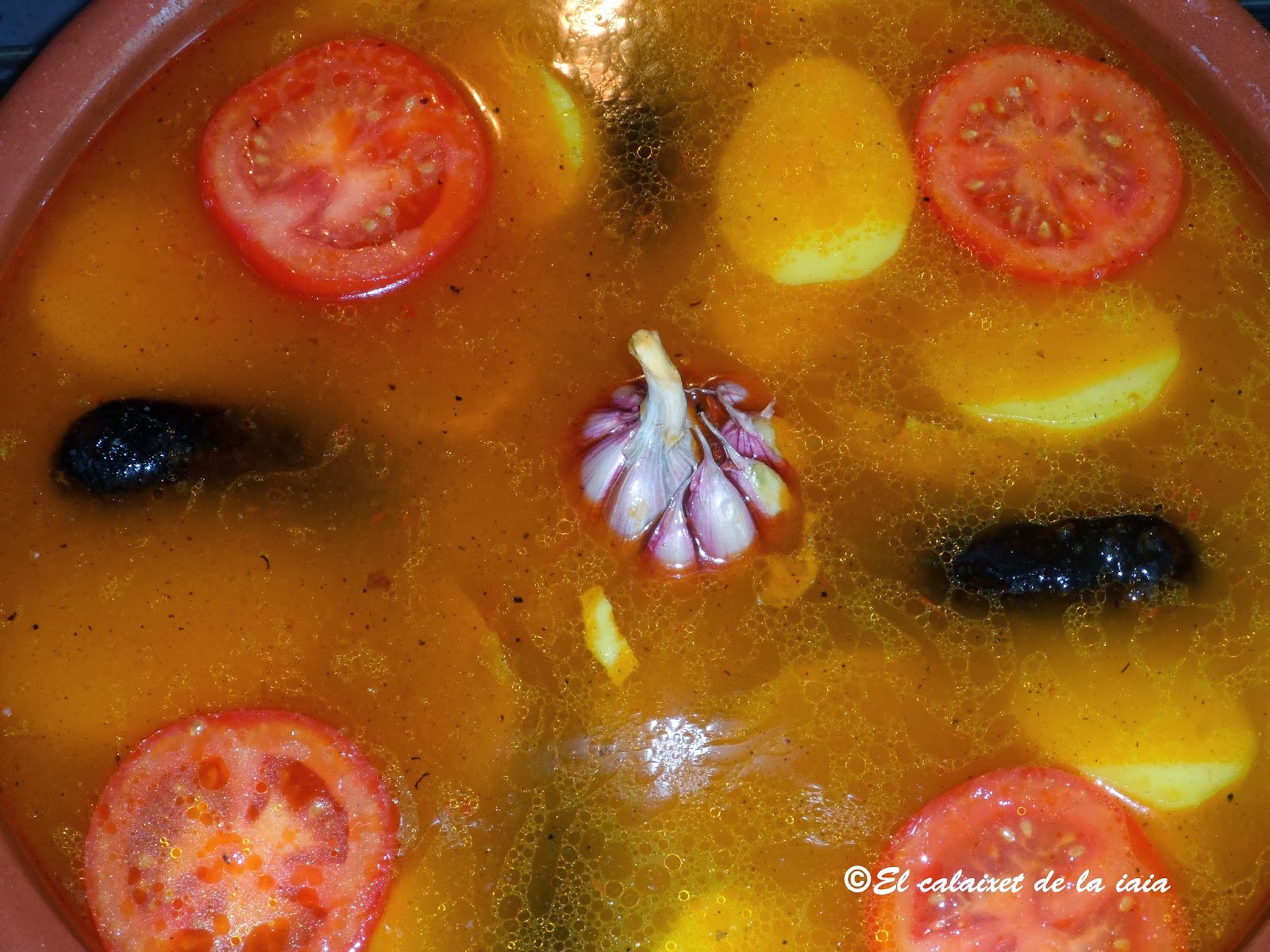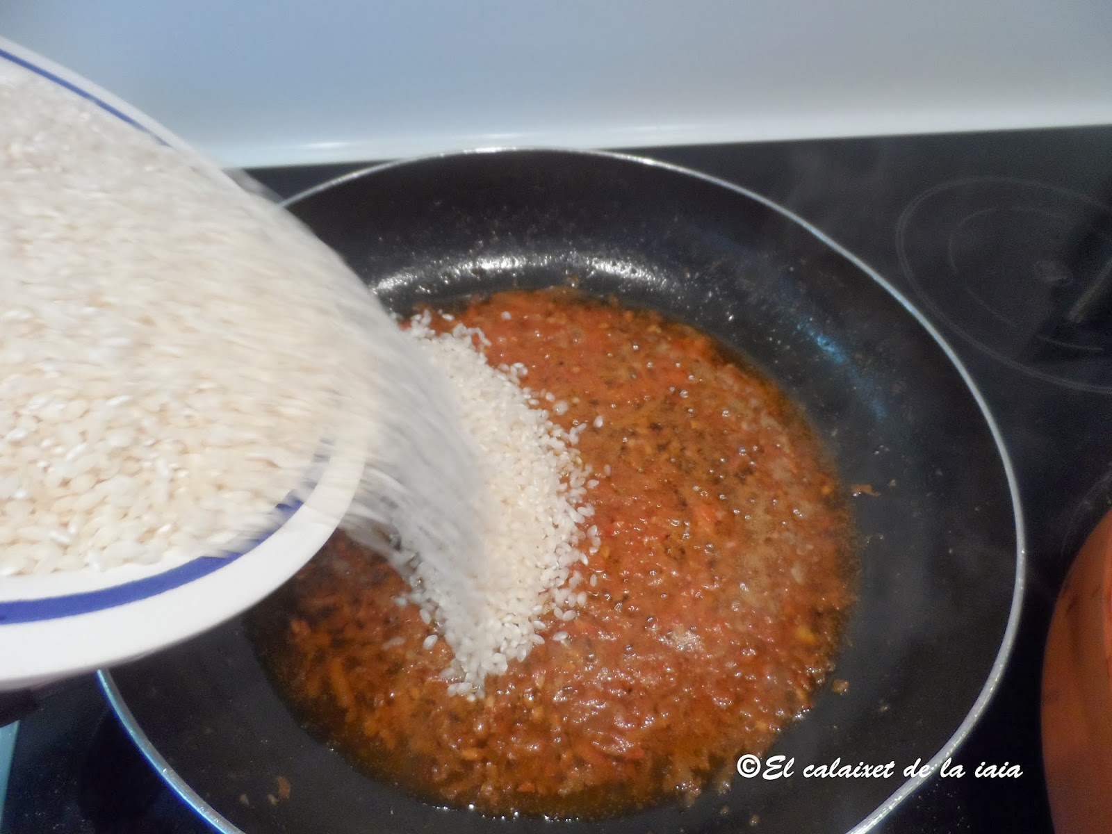 Añadimos el caldo hirviendo ESTO ES MUY IMPORTANTE, y para el rosetjat, siempre con caldo del puchero, así como en el arroz al horno hay quién le echa agua, en lugar de caldo, no es mi costumbre, yo procuro que sea siempre con caldo, pero este rosetjat. ha de ser con caldo preciso.