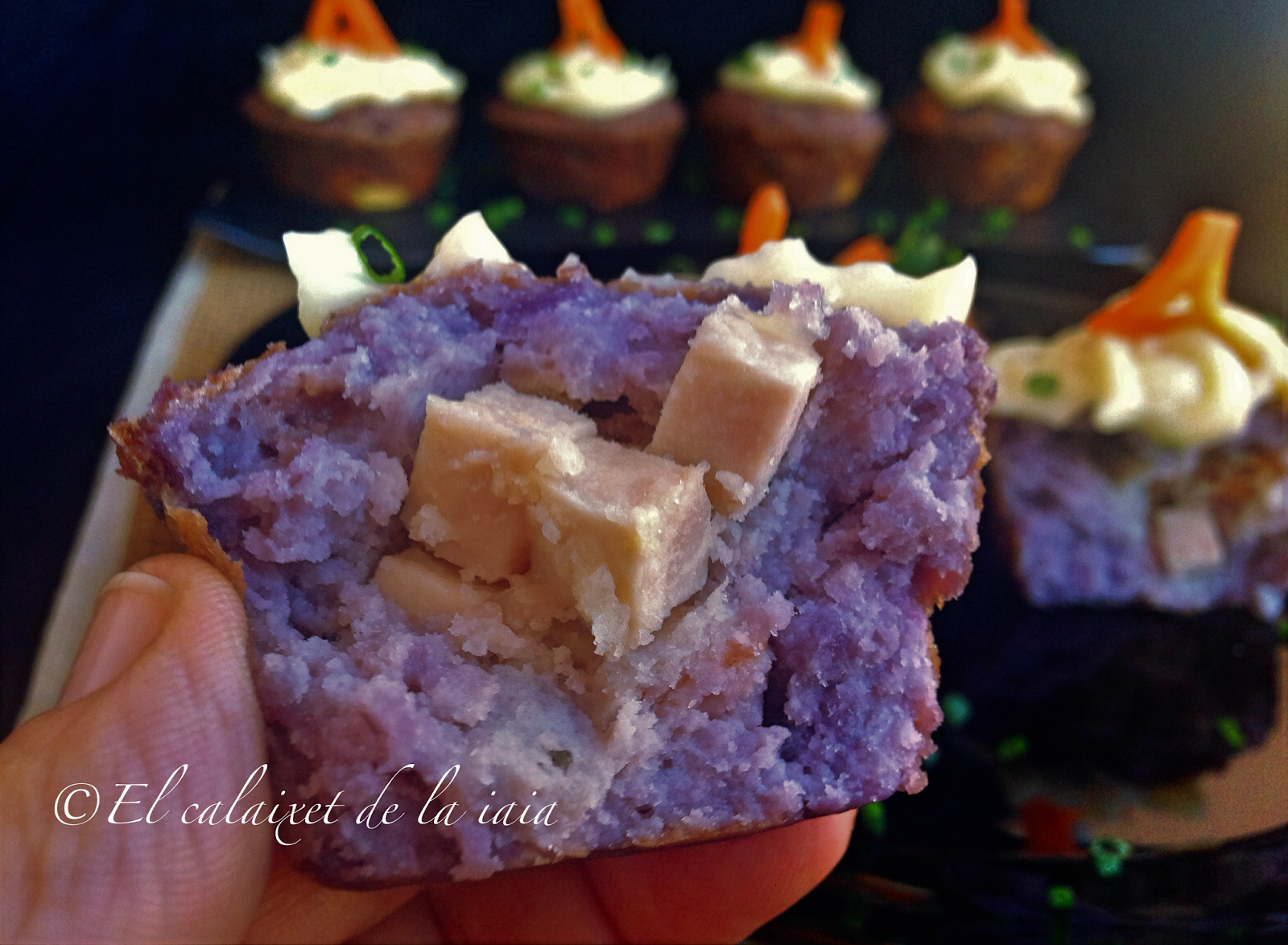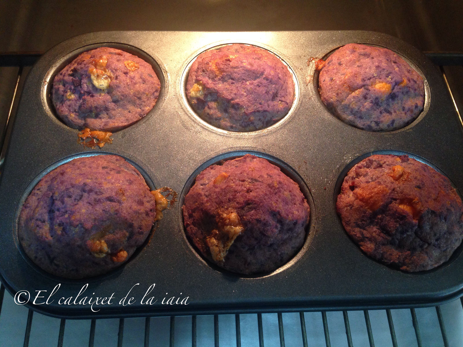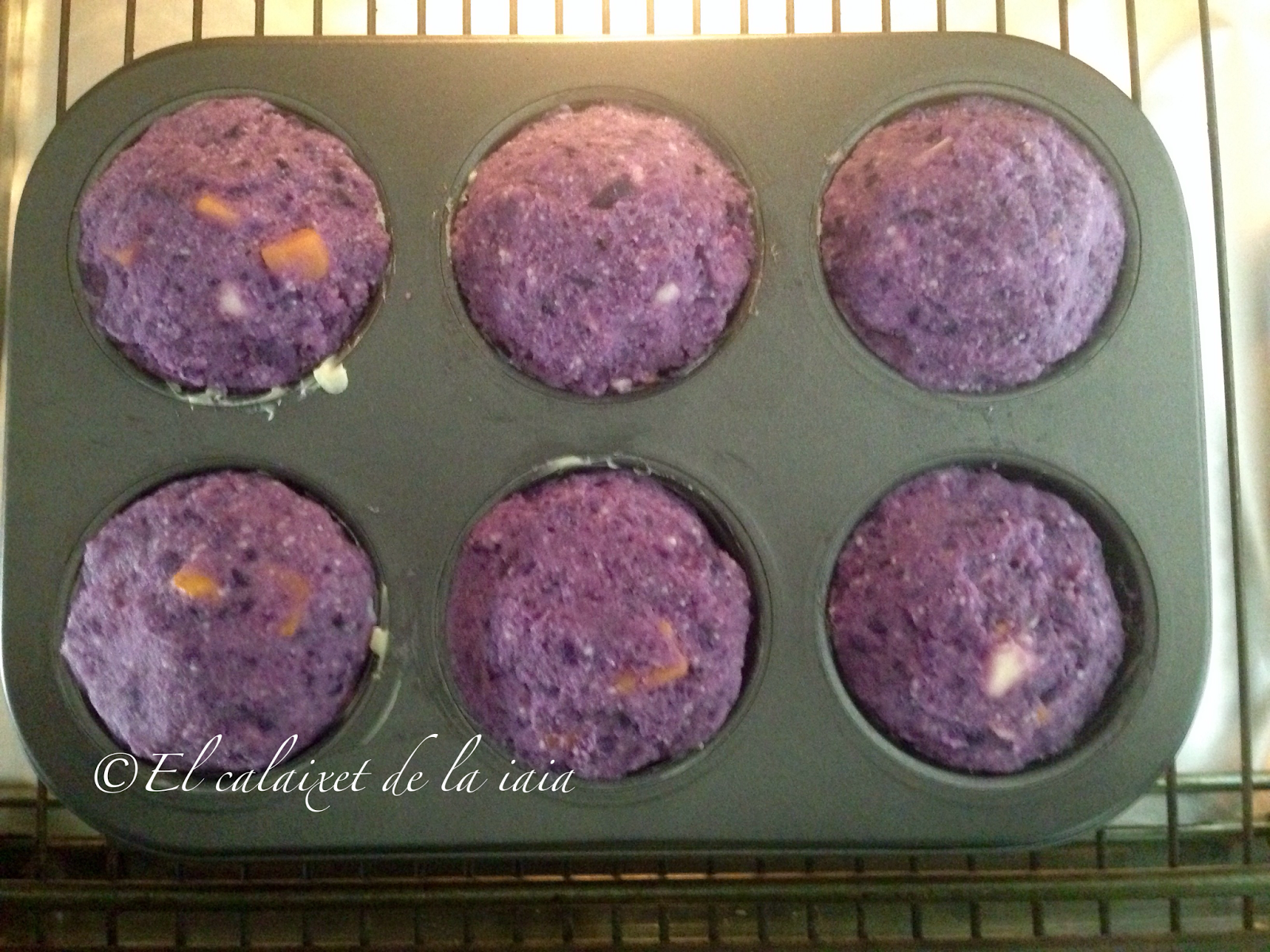 cuando veáis que la masa ha subido ligeramente, el queso se ha derretido un poco y ha cambiado la intensidad de color del morado,estarán hechas. El truco del palo de brocheta en éste caso no sirve, porque el centro de la «magdalena» queda húmedo por la patata