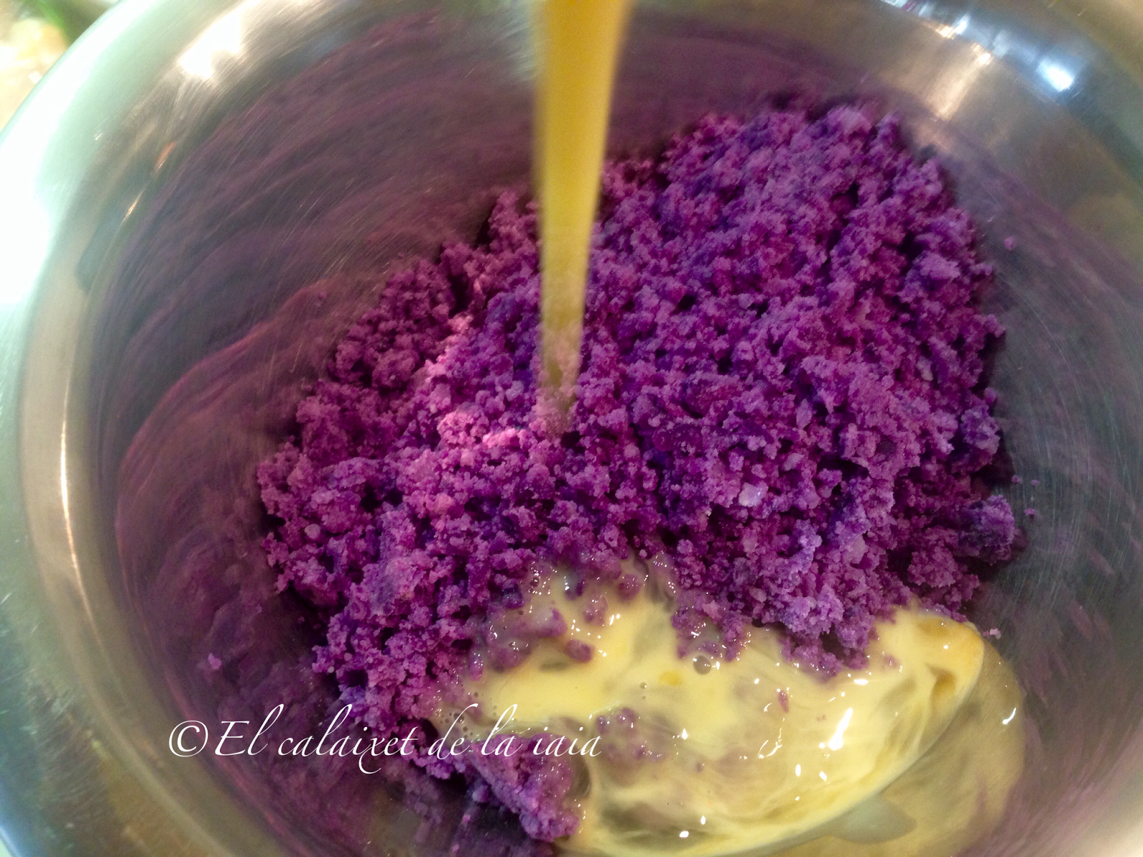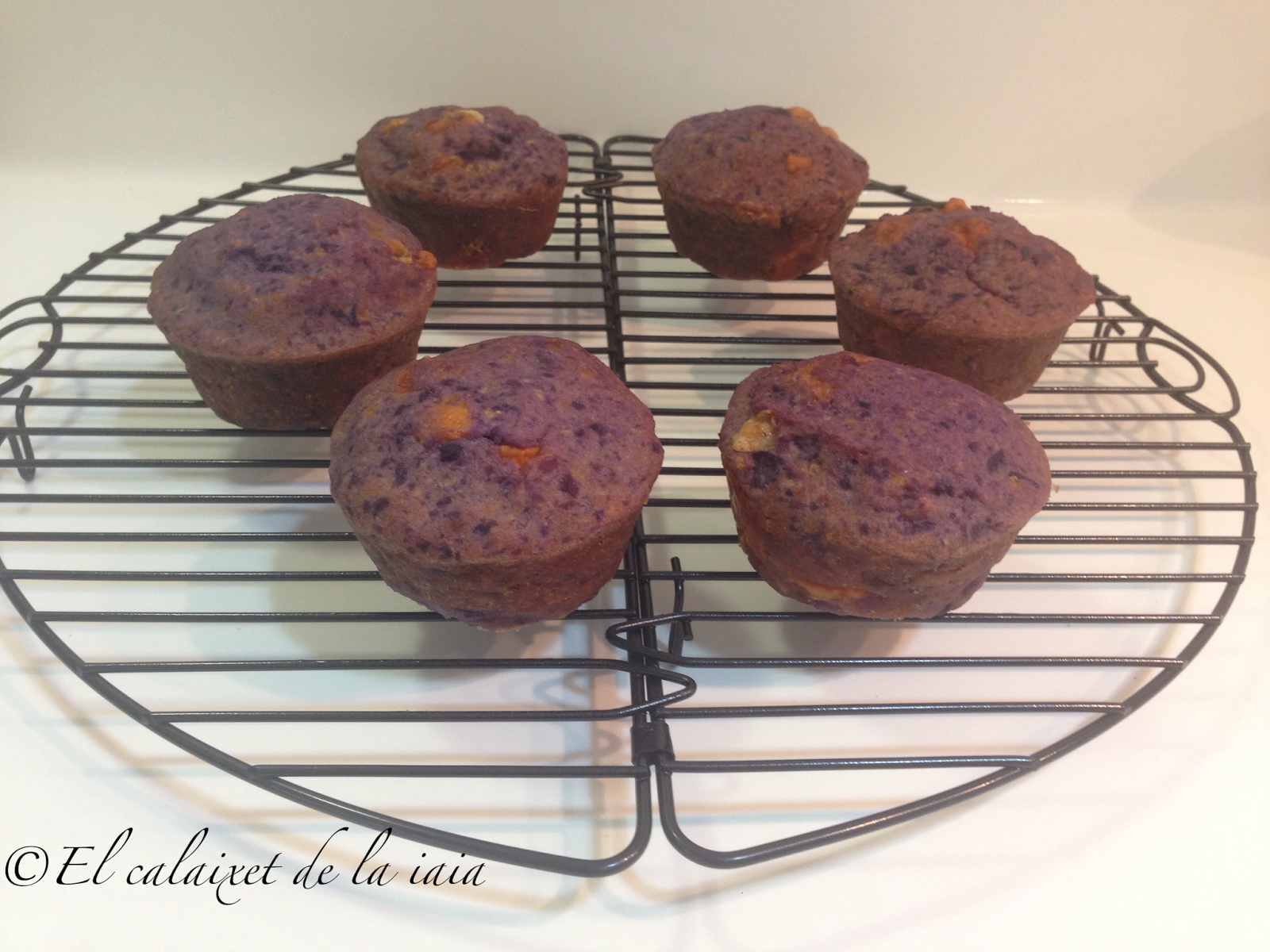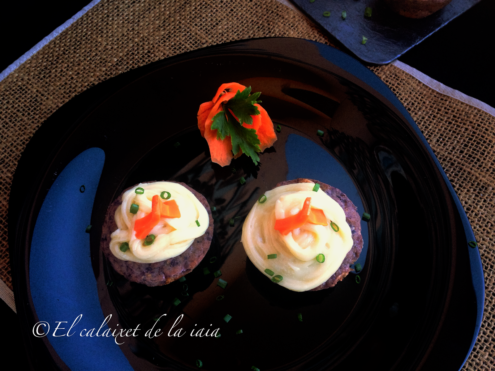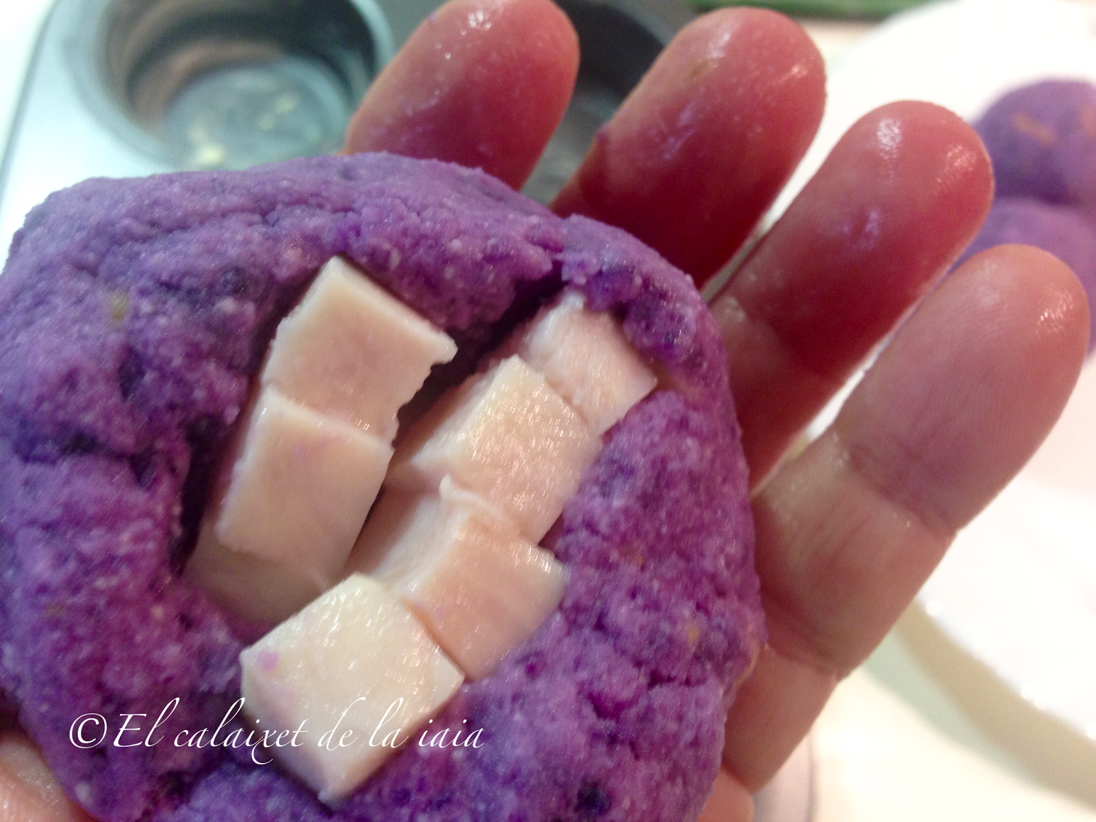 cuando veáis que la masa ha subido ligeramente, el queso se ha derretido un poco y ha cambiado la intensidad de color del morado,estarán hechas. El truco del palo de brocheta en éste caso no sirve, porque el centro de la «magdalena» queda húmedo por la patata