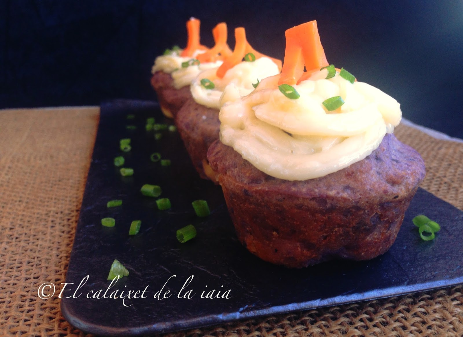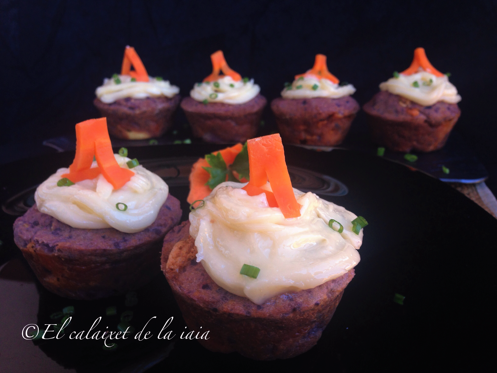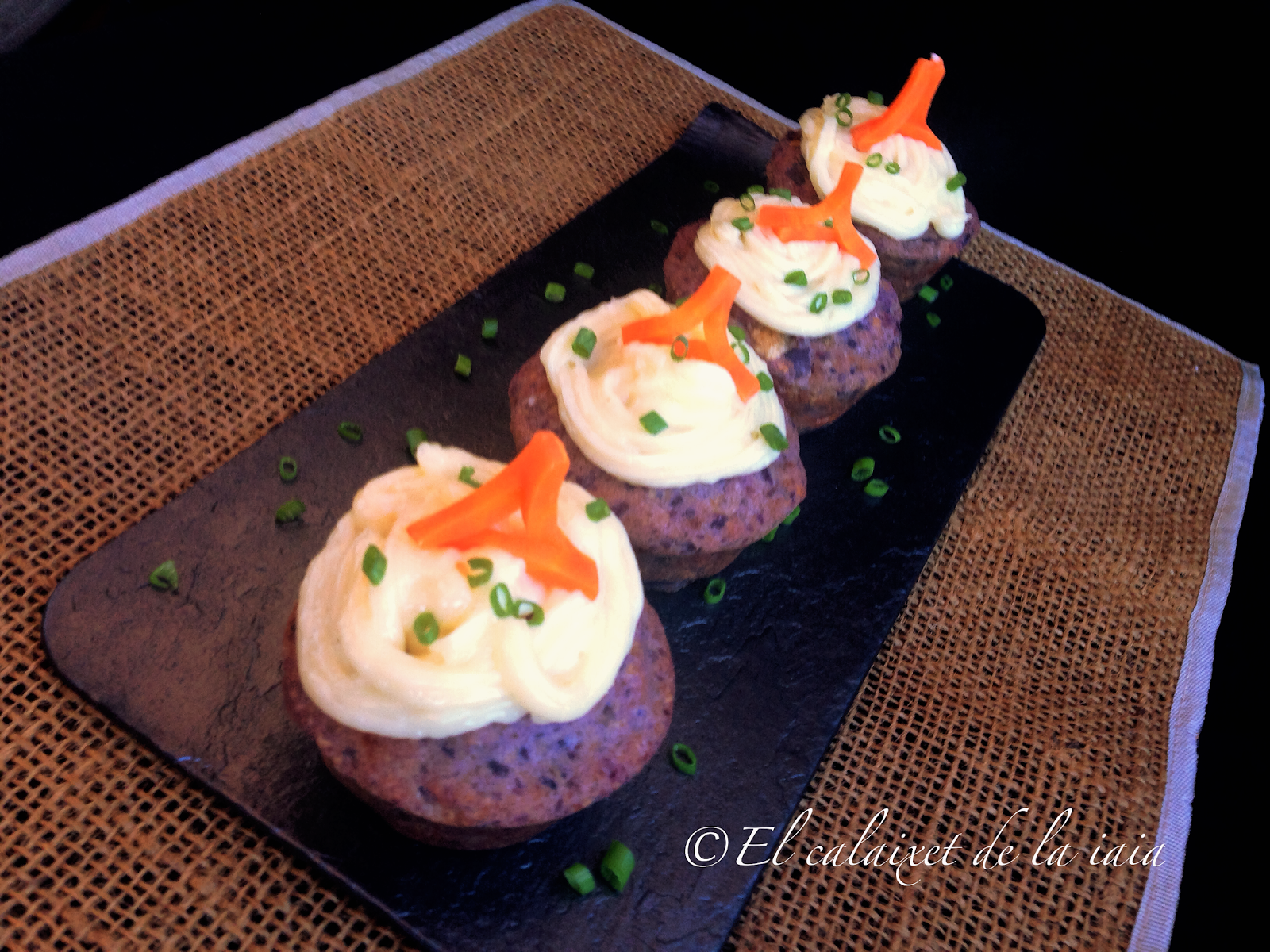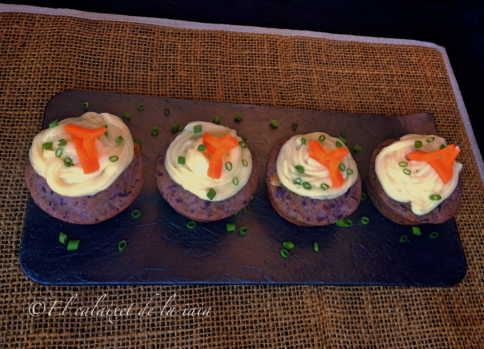 con el all i oli, pondremos una capa sobre una «magdalena» ayudándonos de una pala o una manga pastelera