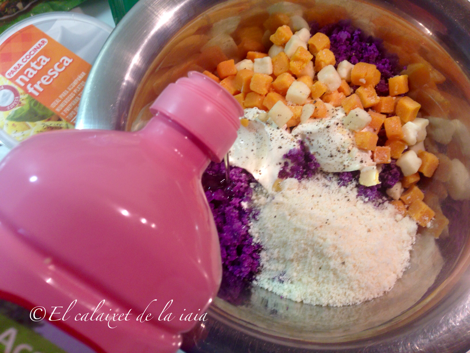 Éstas «magdalenas» las he preparado otras veces con patatas blancas y el queso rallado, pero ésta vez he querido dar un toque de color, ya que Con esta receta participo en el Reto de Noviembre 2016 de CdM – Cocineros del Mundo en el apartado salado #RetoNoviembre2016CdM y quería hacer algo mas original.