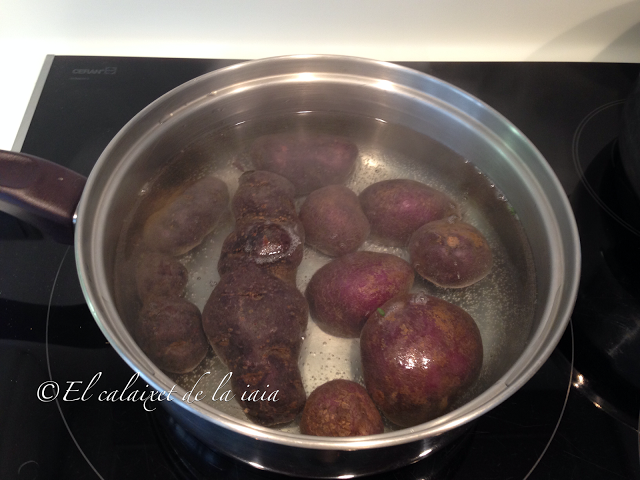 Lavamos las patatas y las colocamos en una cazuela con agua y sal. Cuando empiece a hervir, cocemos durante unos 15-20 minutos, comprobaremos que están hechas cuando pinchando con un palillo o palo de brocheta, entre sin dificultades. Dejaremos enfriar.
