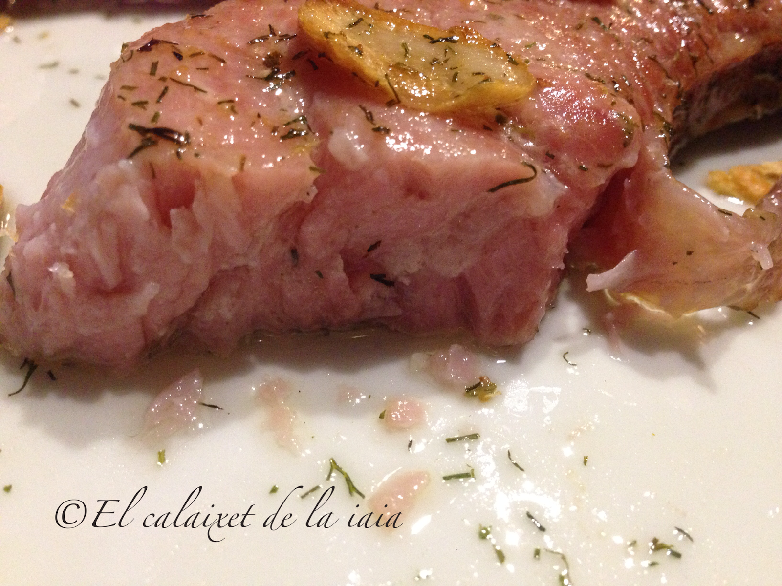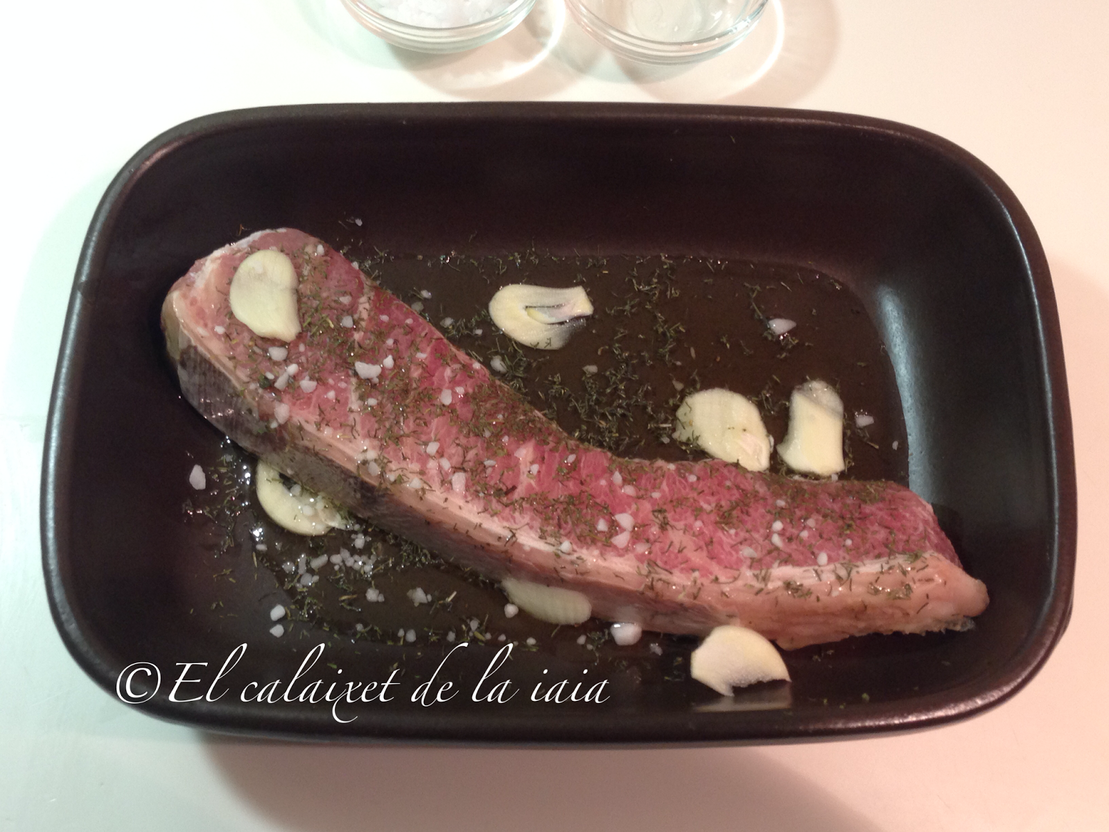 Una hora antes de cocinar el atún, lo pondremos a macerar con los dientes de ajos laminados, el eneldo, aceite de oliva y un poco de sal maldón. Lo tapamos con papel film, y lo conservamos en el frigo.
