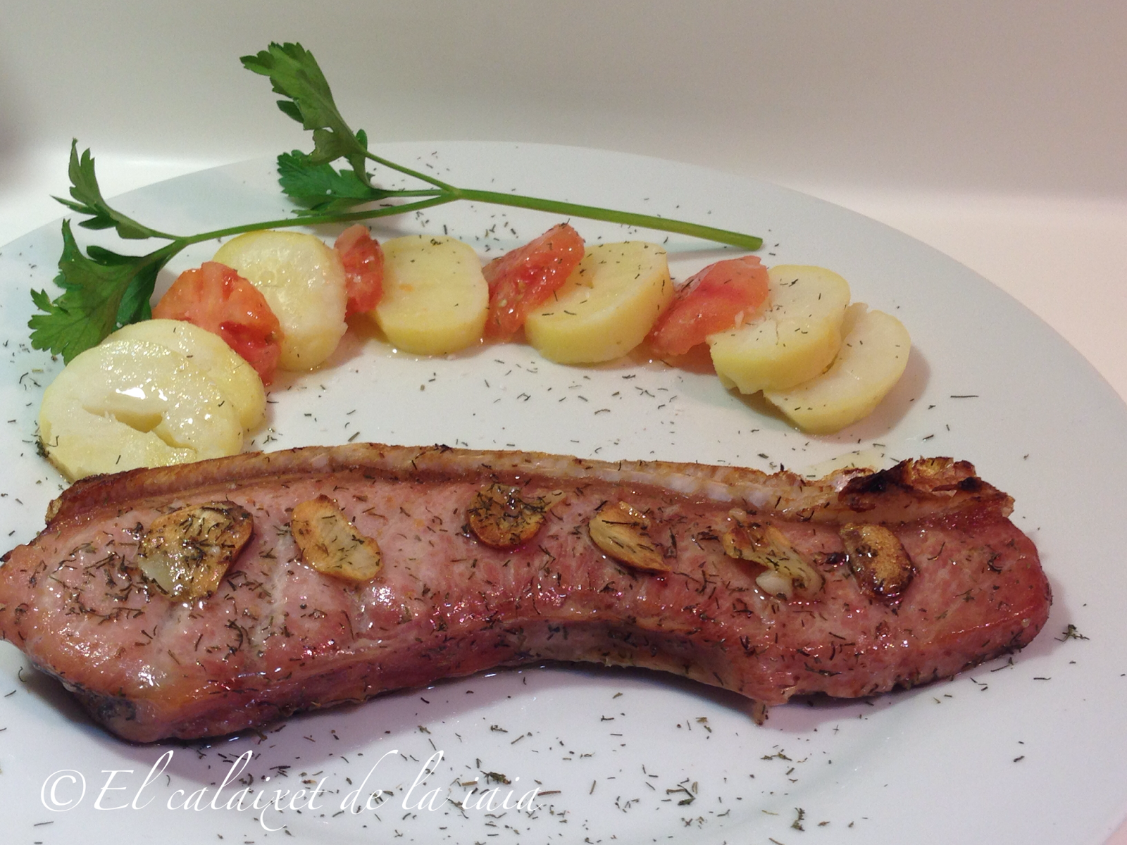 Cómo guarnición le he puesto unas rodajas de patata al vapor y de tomate valenciano natural, aderezado con sal y aceite de oliva virgen