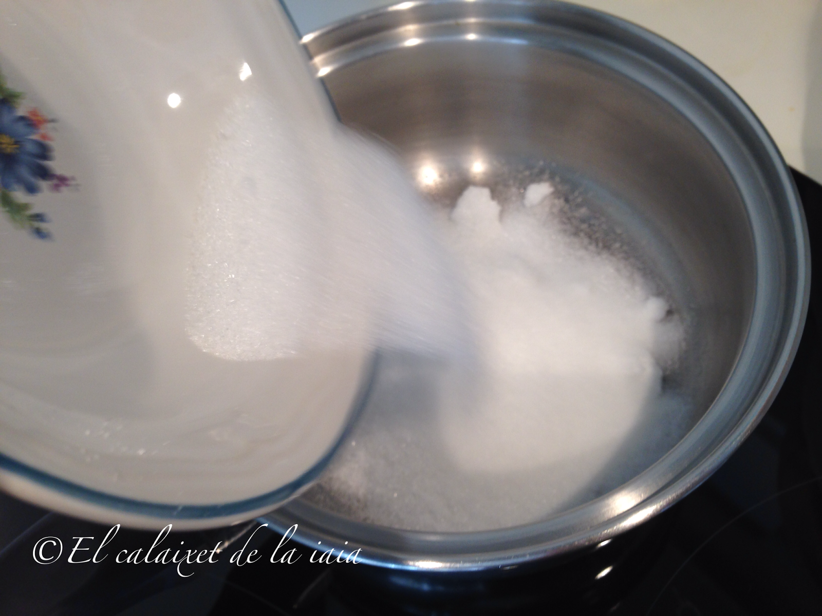 añadiremos 100 ml de agua y haremos de nuevo el proceso de pintar las paredes con el pincel con agua para que no se pegue al cazo