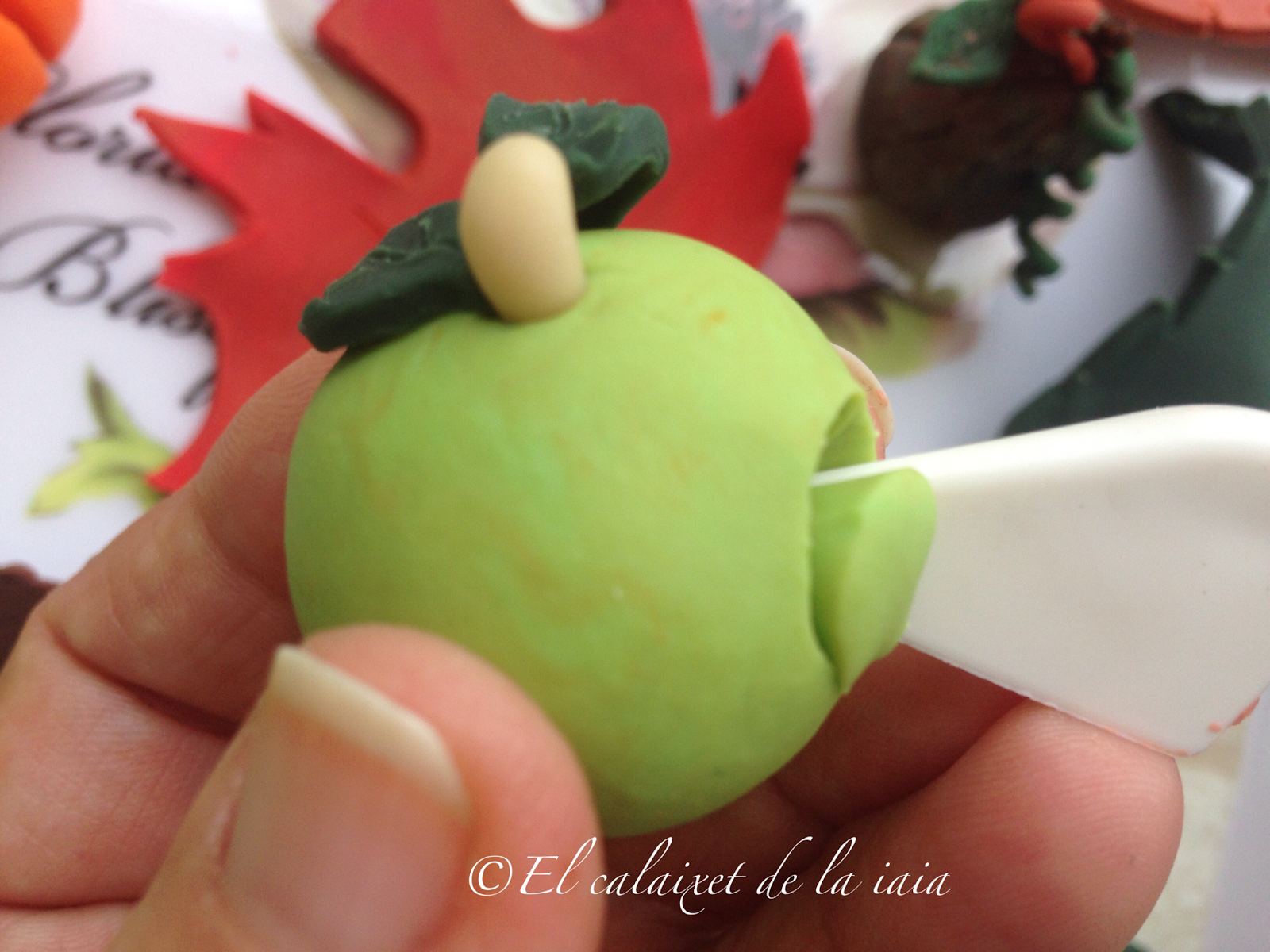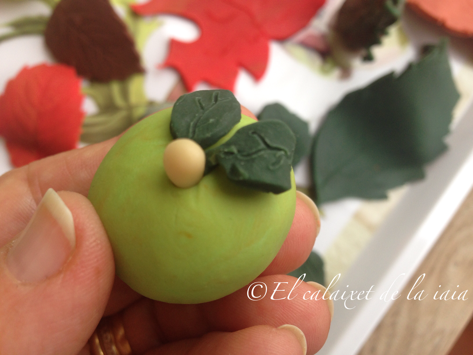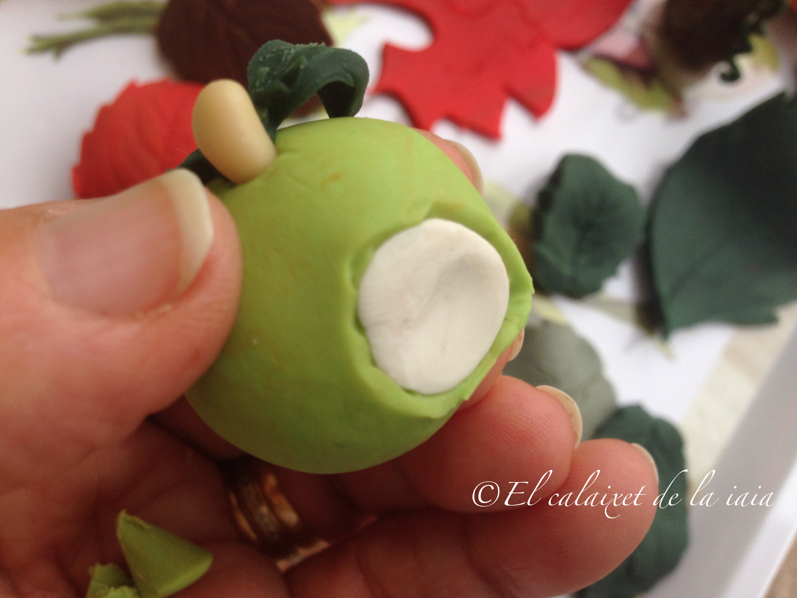 o mojar el pincel muy poquito en agua. Terminaremos la manzanita colocando un piñón