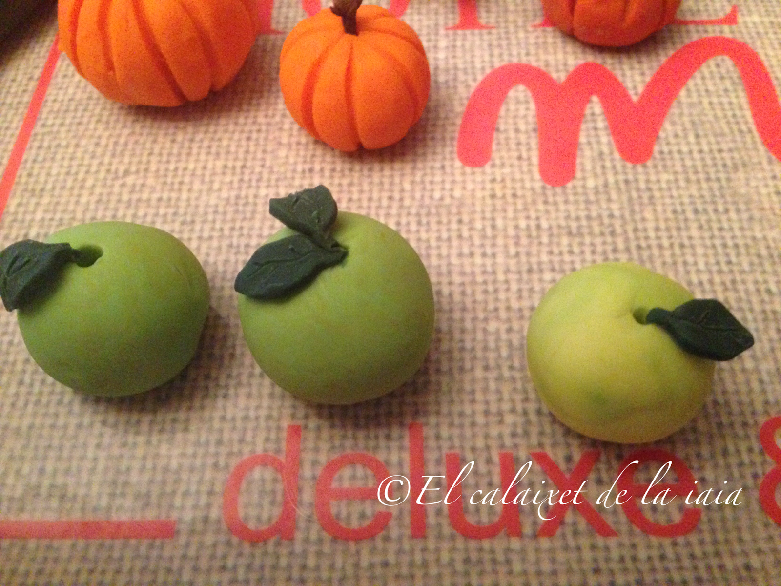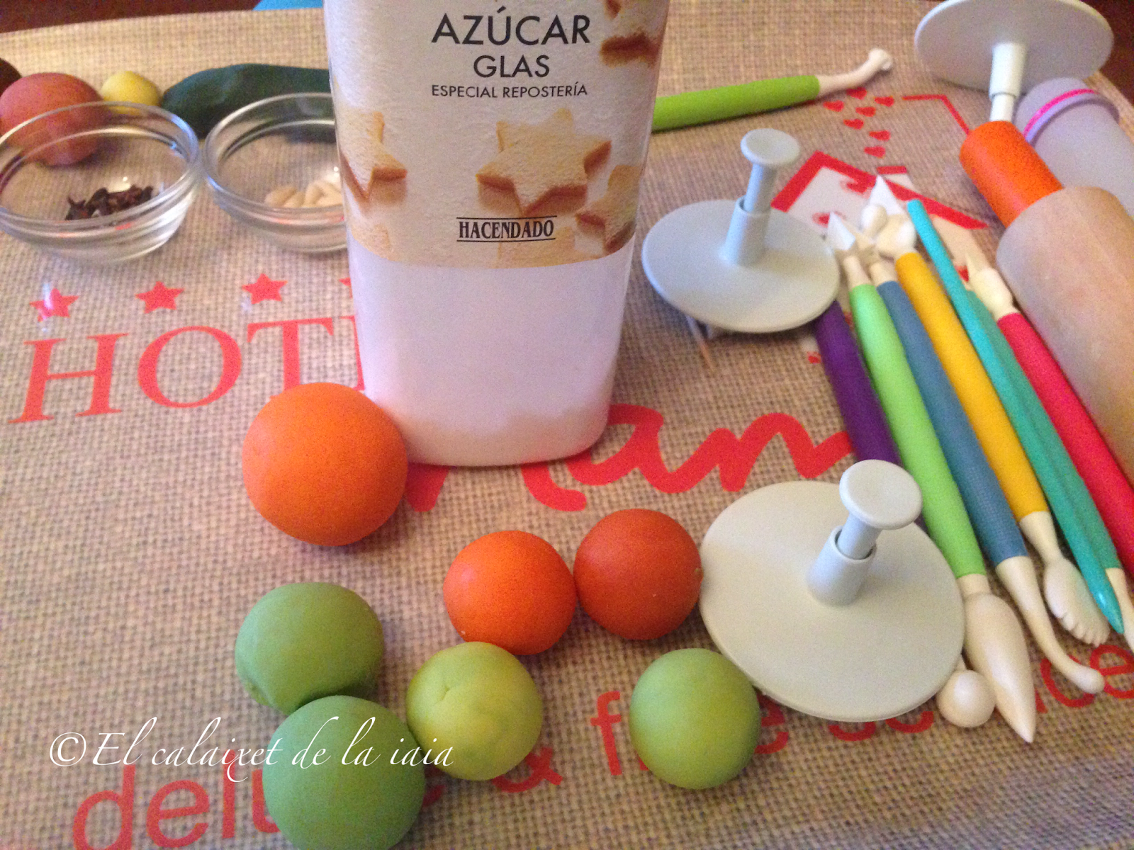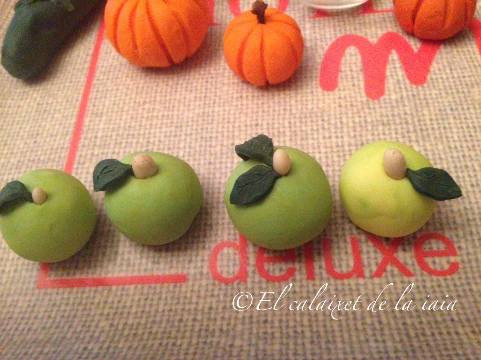 En lugar de fondant podemos hacerlas de mazapán, que es lo que utilizamos para la «Mocadorà» del 9 d’Octubre, día de los enamorados valencianos. La receta del mazapán está aquí https://elcalaixetdelaiaia.es/?p=1082 y sólo tenéis que tintar distintas piezas con tintes comestibles, para hacer las figuritas de las distintas frutitas , hortalizas etc.