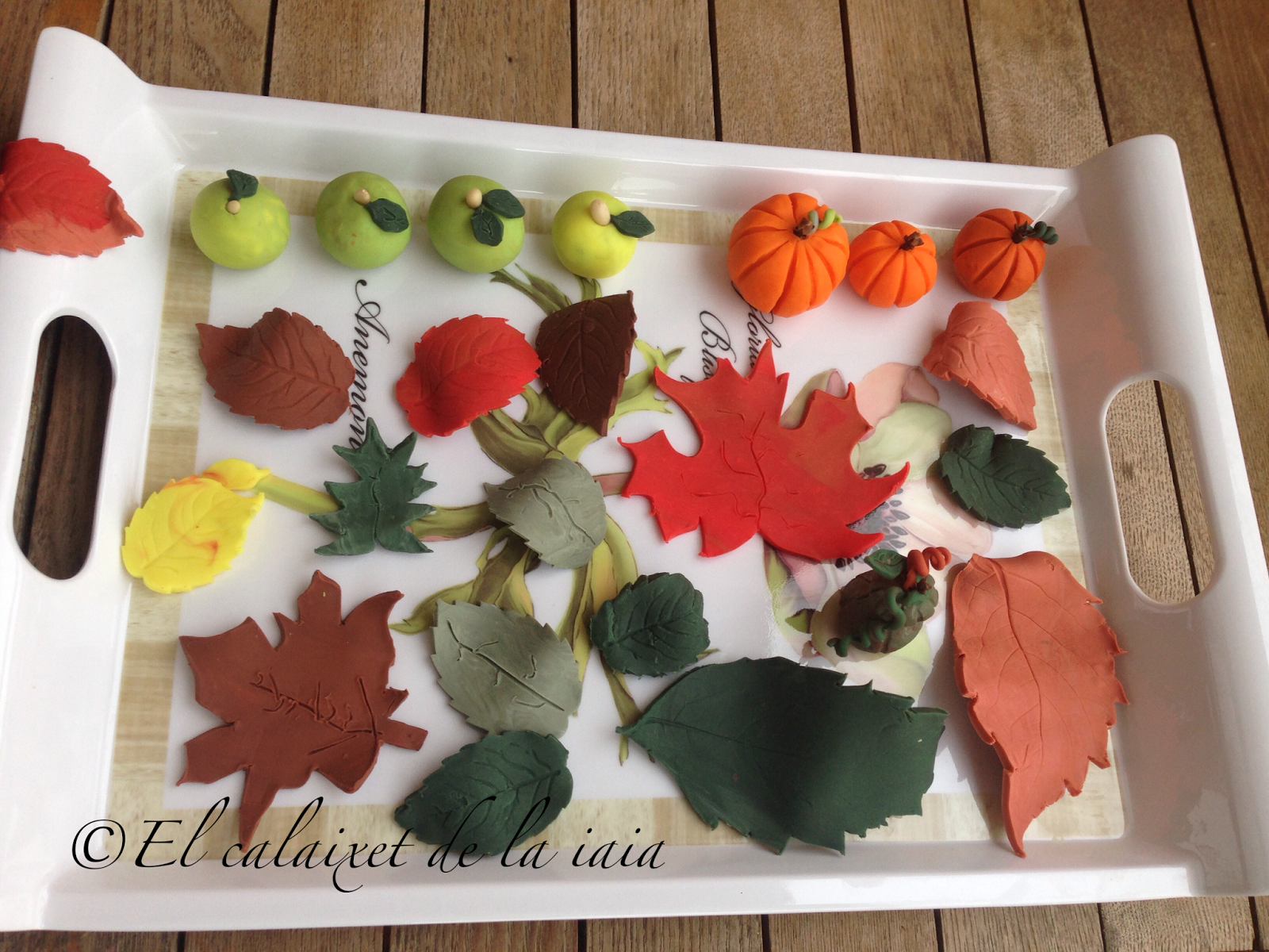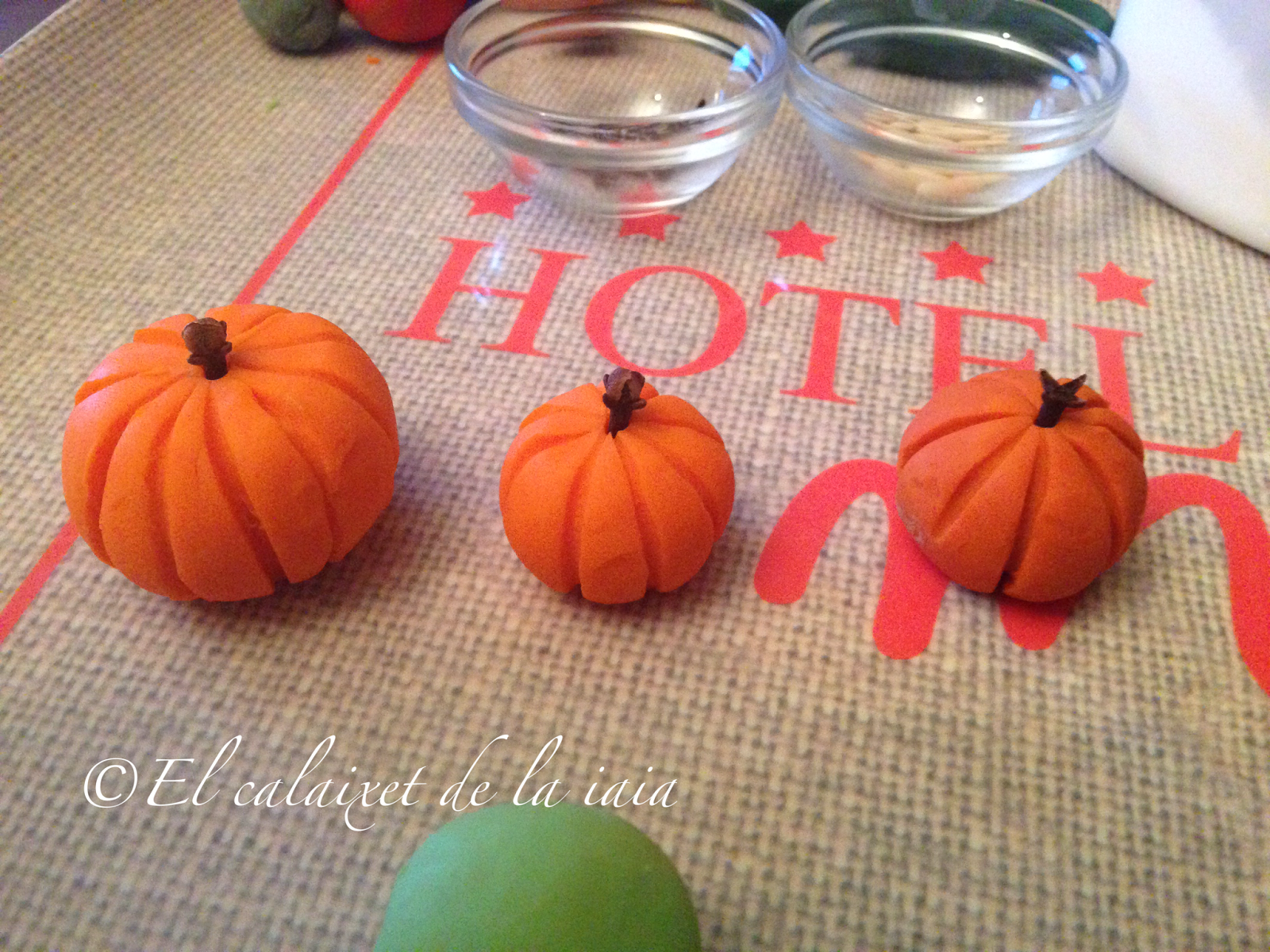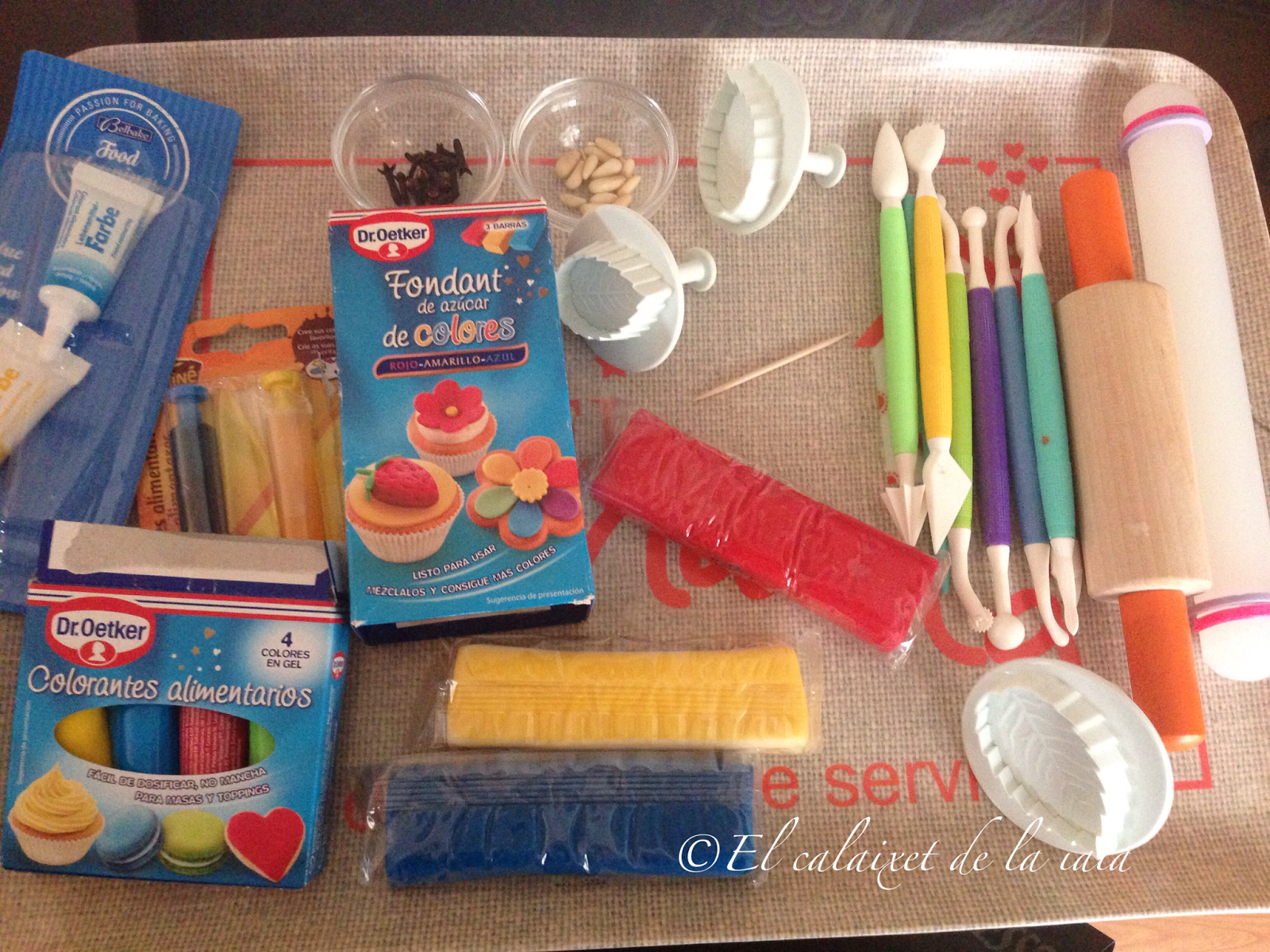 En lugar de fondant podemos hacerlas de mazapán, que es lo que utilizamos para la «Mocadorà» del 9 d’Octubre, día de los enamorados valencianos. La receta del mazapán está aquí https://elcalaixetdelaiaia.es/?p=1082 y sólo tenéis que tintar distintas piezas con tintes comestibles, para hacer las figuritas de las distintas frutitas , hortalizas etc.