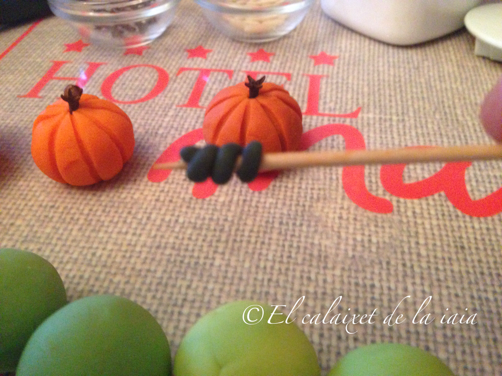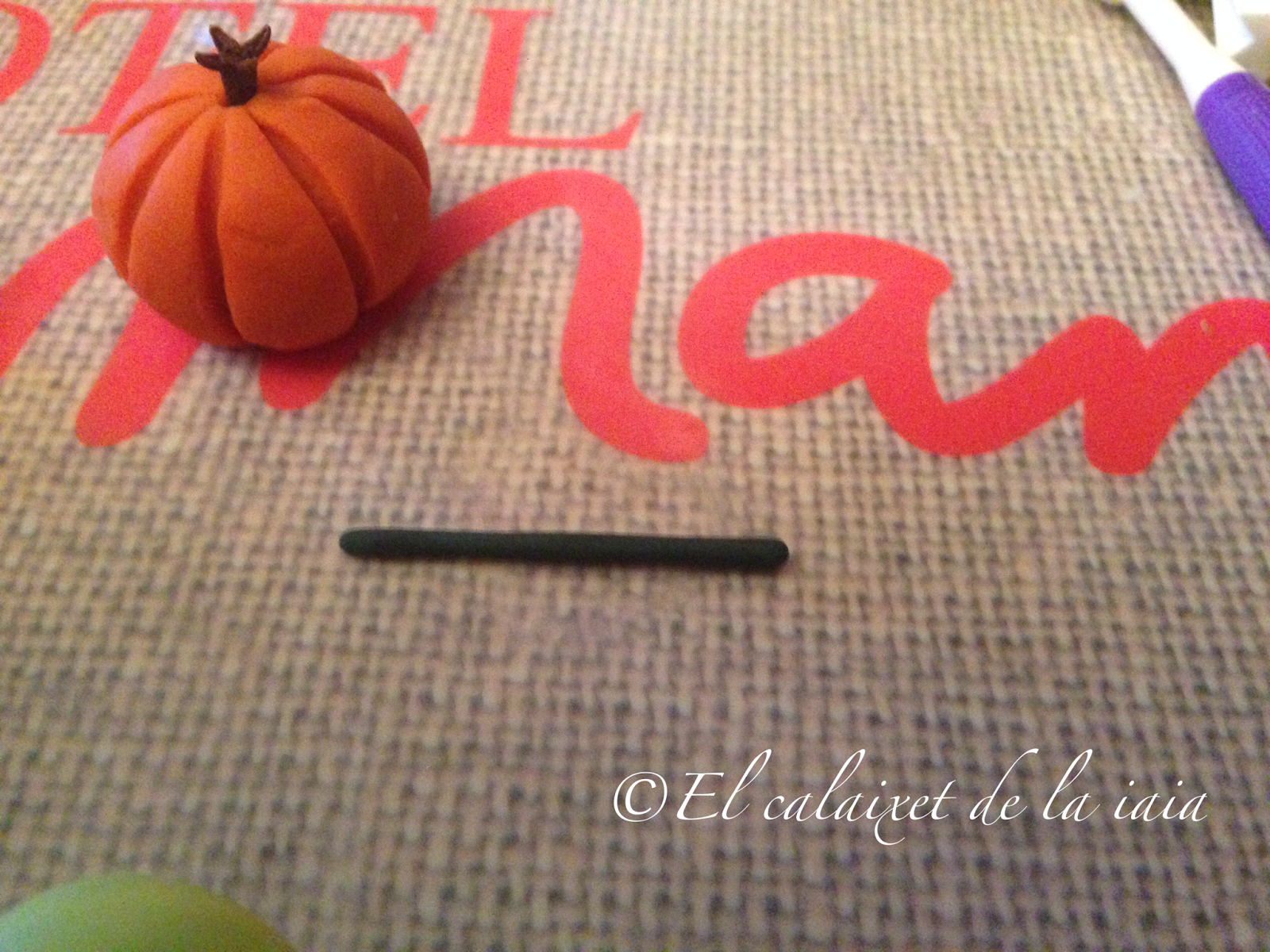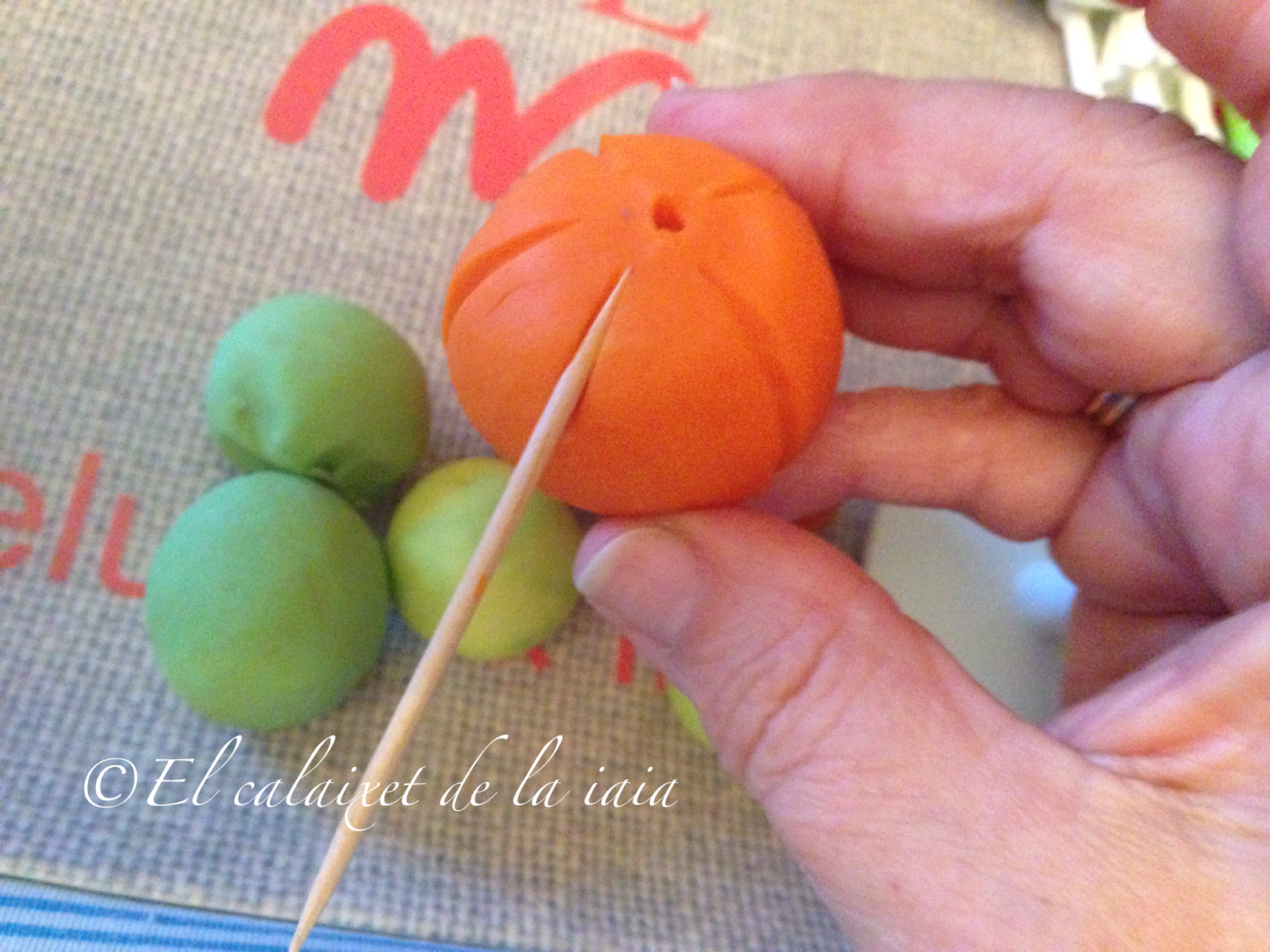 y achataremos un poco intentando dar forma de calabacita, tened en cuenta que no es necesario que tengan ni el mismo tamaño ni forma. Pondremos un clavo simulando el rabito