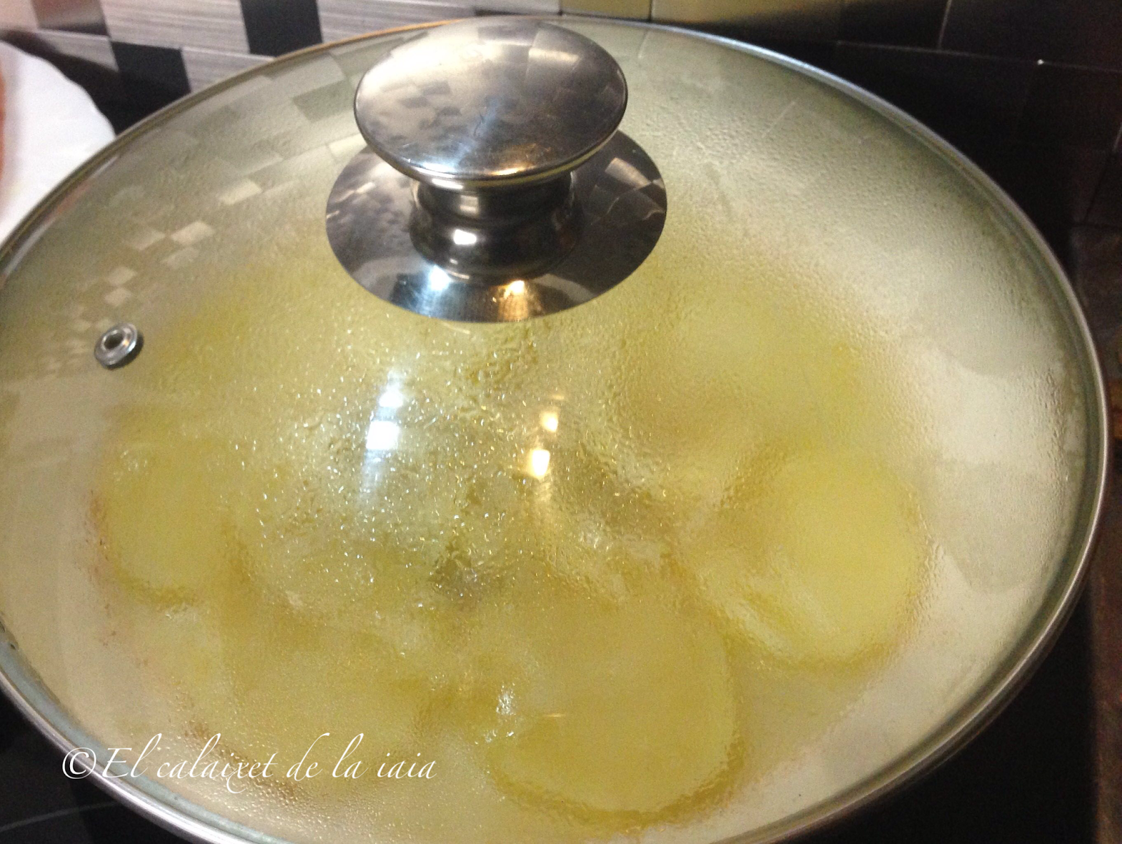 si vais a usar jamón de york, antes de poner las patatas en aceite darle una vuelta al jamón de york y reservar,si vais a usar jamón serrano, ponerlo crudo y saltaros éste paso, porque de lo contrario, queda demasiado salado. Ahora pondremos las rodajas de patatas cubriendo el fondo de la sartén ,taparemos la sartén y la dejaremos a fuego mínimo unos 8 minutos