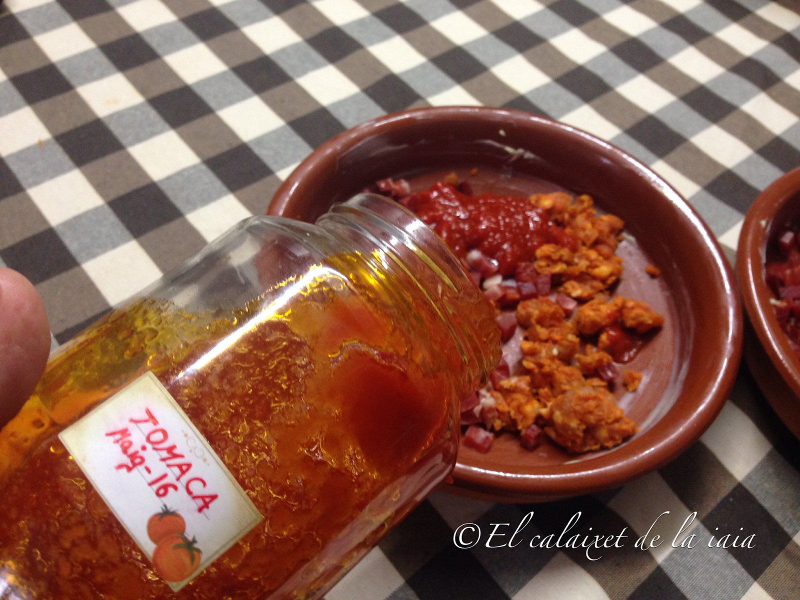 cubriremos con dos cucharadas en cada cazuelita de salsa de tomate casero bien espeso (no uséis de bote, que el industrial no tiene nada que ver, vale la pena hacerlo en casa, con tomates naturales, en serio)