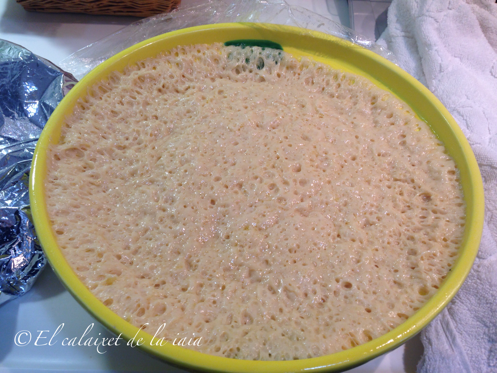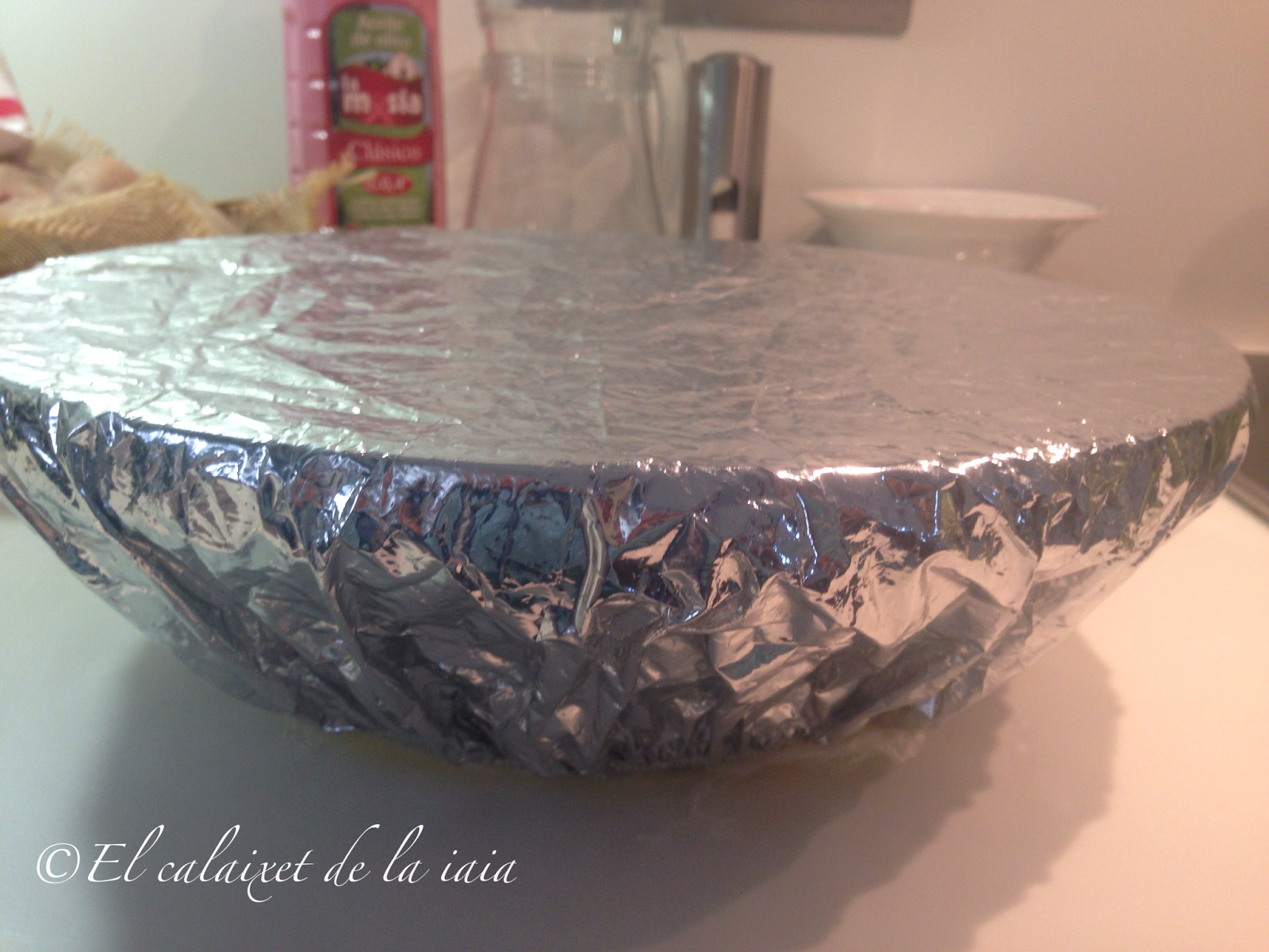 Tengo ésta tapa de aluminio con goma adaptable para tapar las masas, por el interior la unto con aceite y de ésta manera, po mucho que suba la masa no se pega en la tapa 😉 pero podéis usar papel aluminio y hacer igualmente, el truco del aceite, porque es genial 🙂